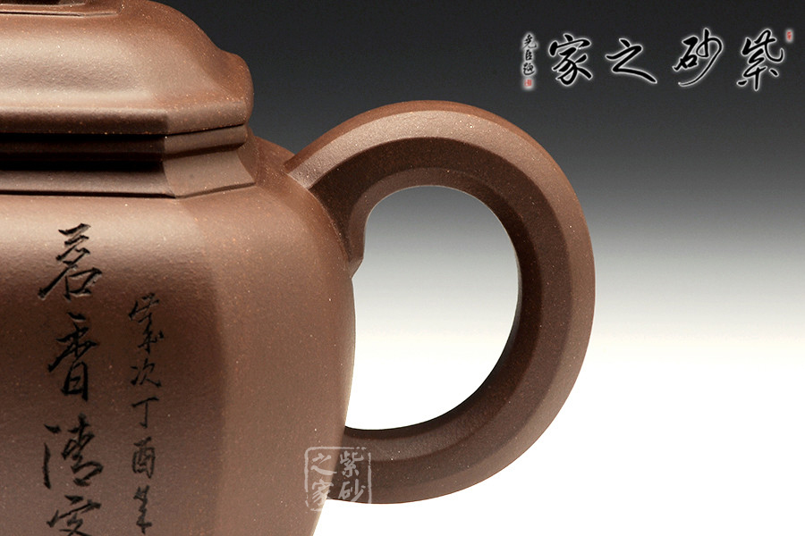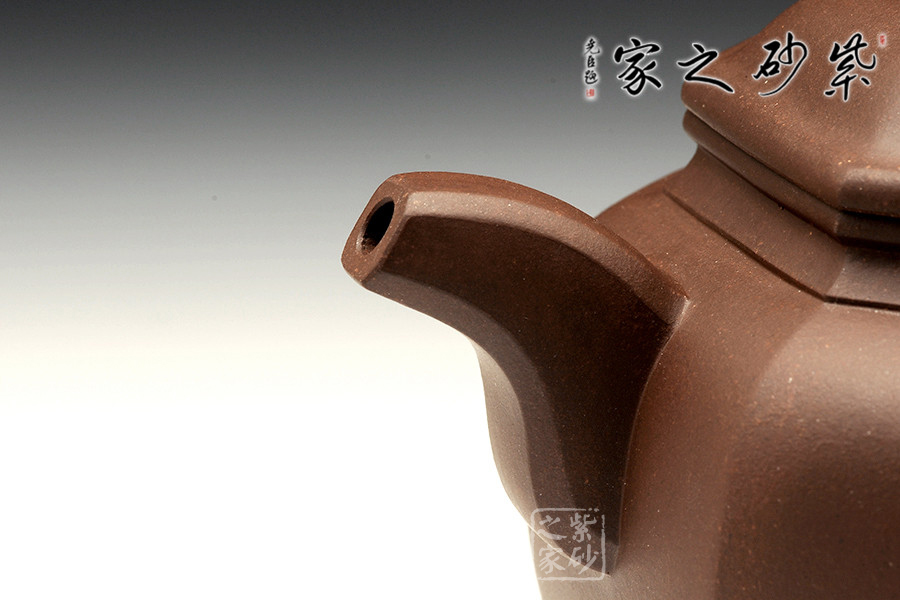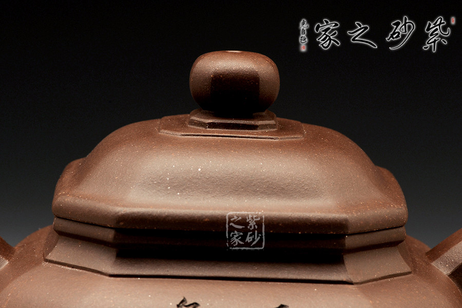 壺身的四方型中融入圓形,四角被切去,圓滑里有工整自然。子母線的圓潤非常動人,平整細膩,足見工藝高超。蓋上鼓起,八方珠鈕小巧精致。彎流嘴上下粗細變化獨特,弧線的美感十分突出。而壺把則是粗細一致,端握趁手。
