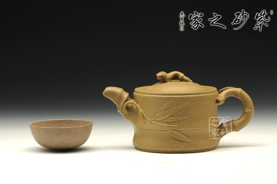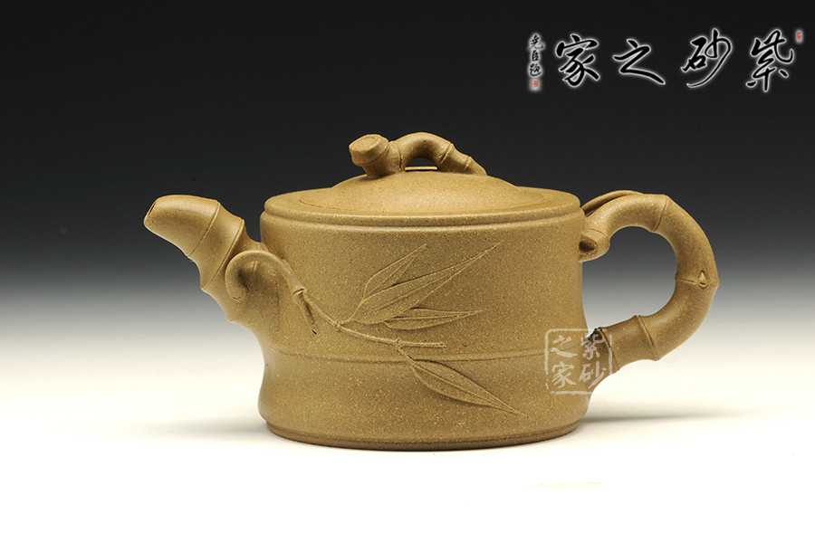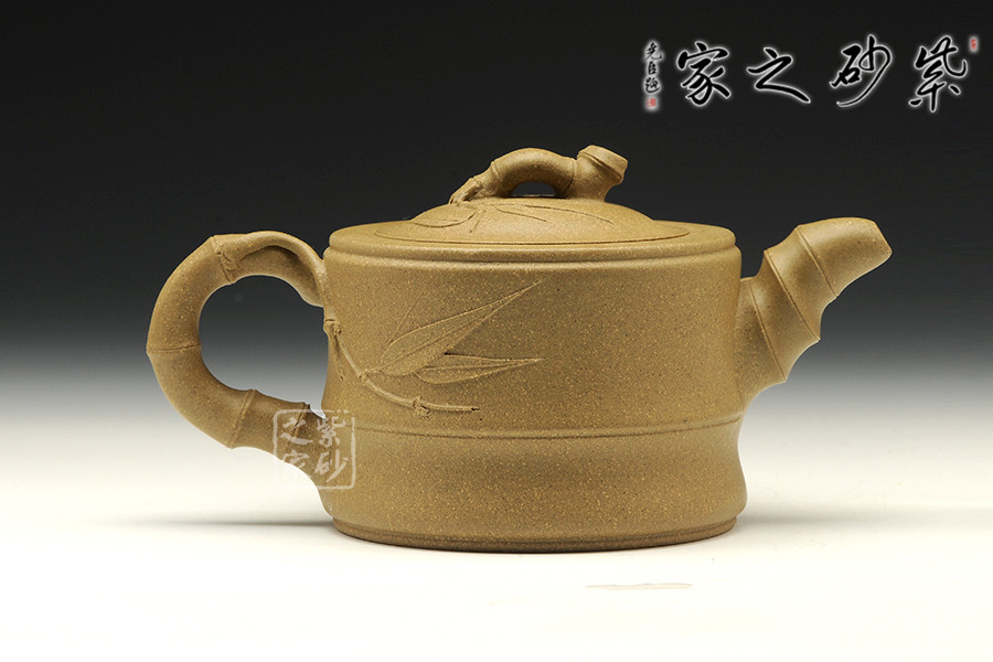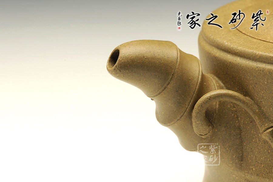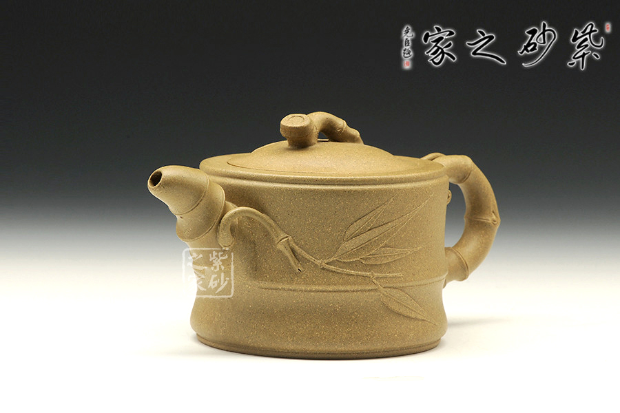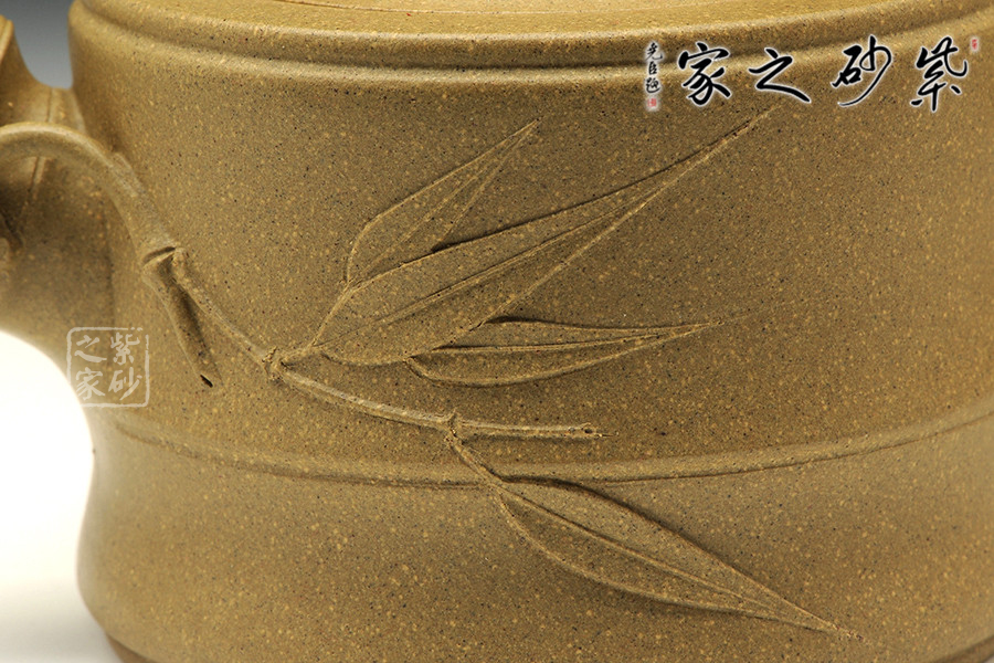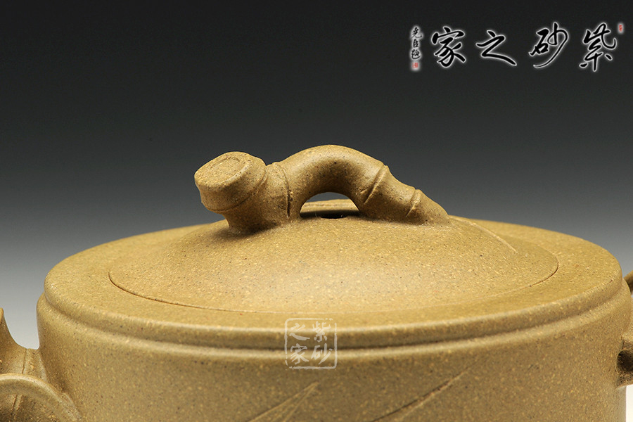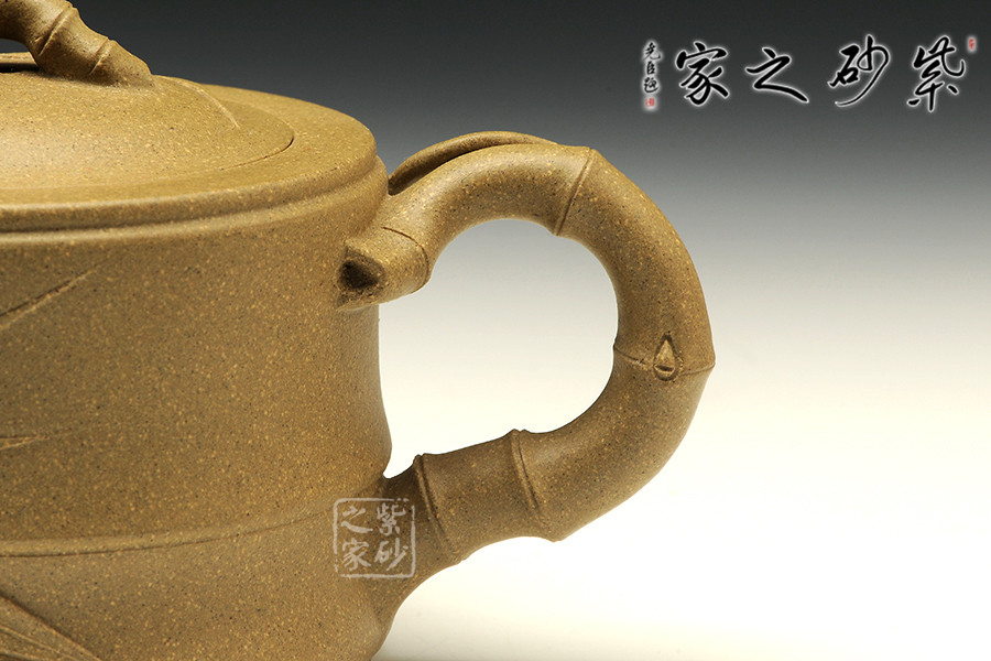 穩(wěn)穩(wěn)的壺身中,可感覺到竹的靈氣,彎曲的竹枝為滴手和壺把,曲卷翻動的勢與度恰到火候。創(chuàng)作此壺決不是延習(xí)古作,簡單模仿,而力盡在適度的變形中,在思想和情感的融合中,在品位和格調(diào)的提煉中,源于生活,高于生活,做到飄逸灑脫,高風(fēng)亮節(jié);由此,品格與藝術(shù)得到升華;一品竹段、高風(fēng)亮節(jié)的人生,又何嘗不是如此呢,給人以無限遐想的空間和無法忘懷的魅力。