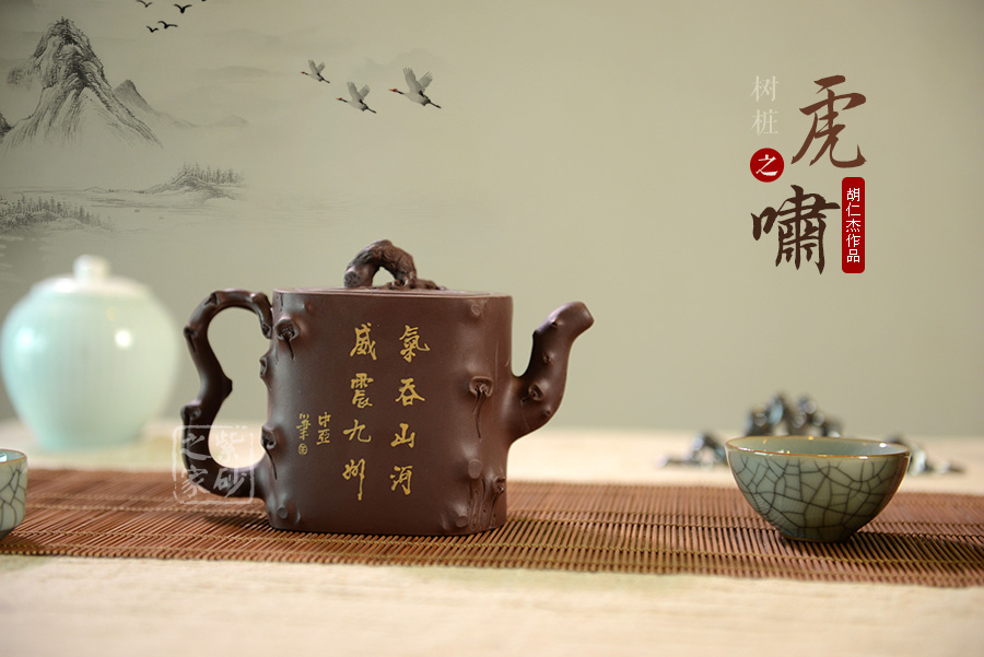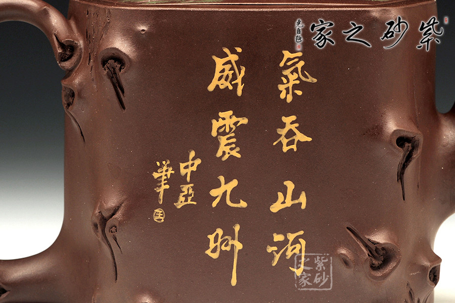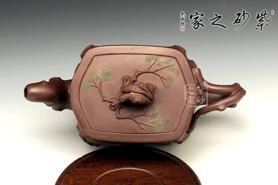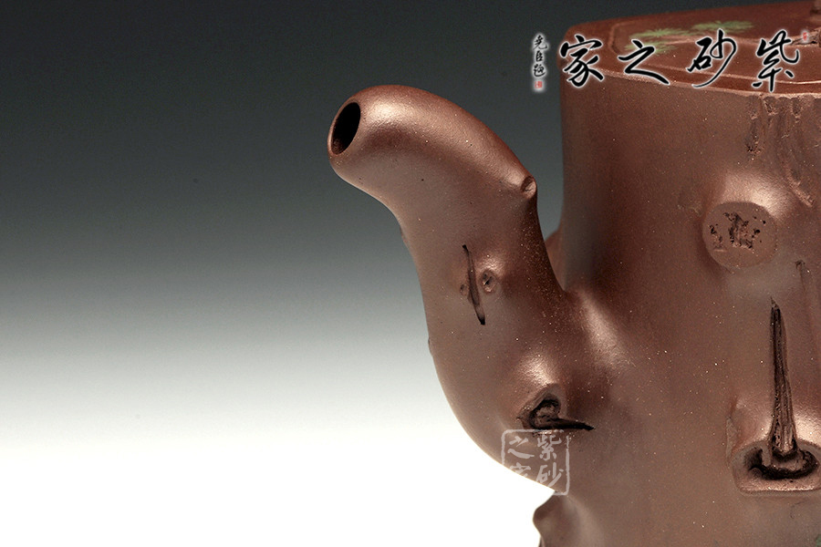 樹木的形態(tài)上下貫通,逼真自然。樹樁粗細(xì)不同,上下全不規(guī)則,再加上各種瘢痕、裂紋、樹皮的模樣,更顯得樹樁十分生動(dòng)。壺嘴、壺鈕和壺把則是樹枝,有彎有直,有收有放,粗細(xì)不一,將樹樁壺點(diǎn)綴得尤其逼真。