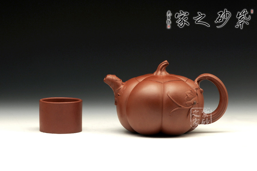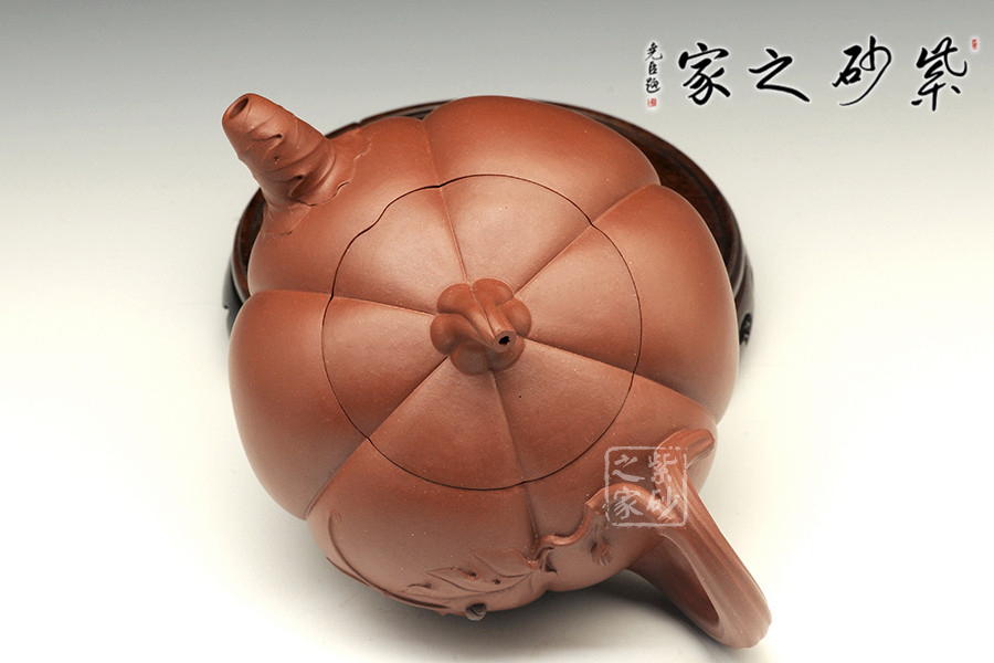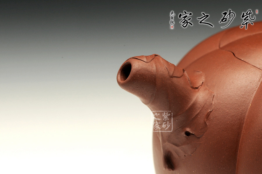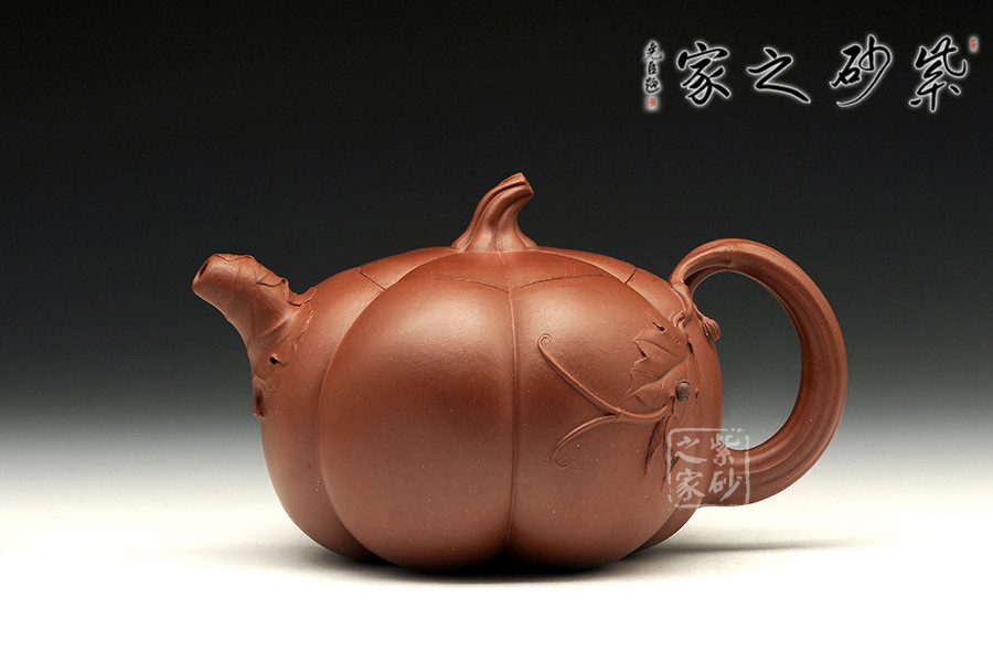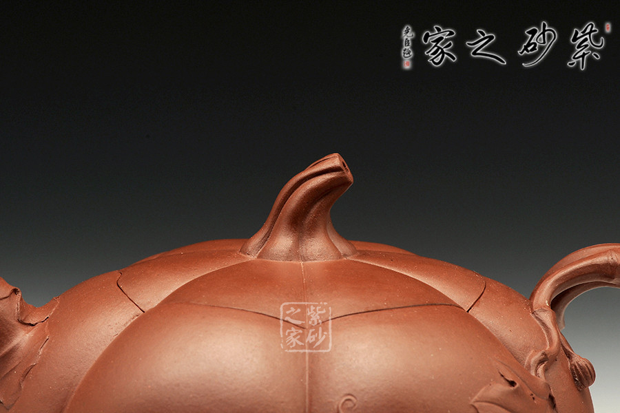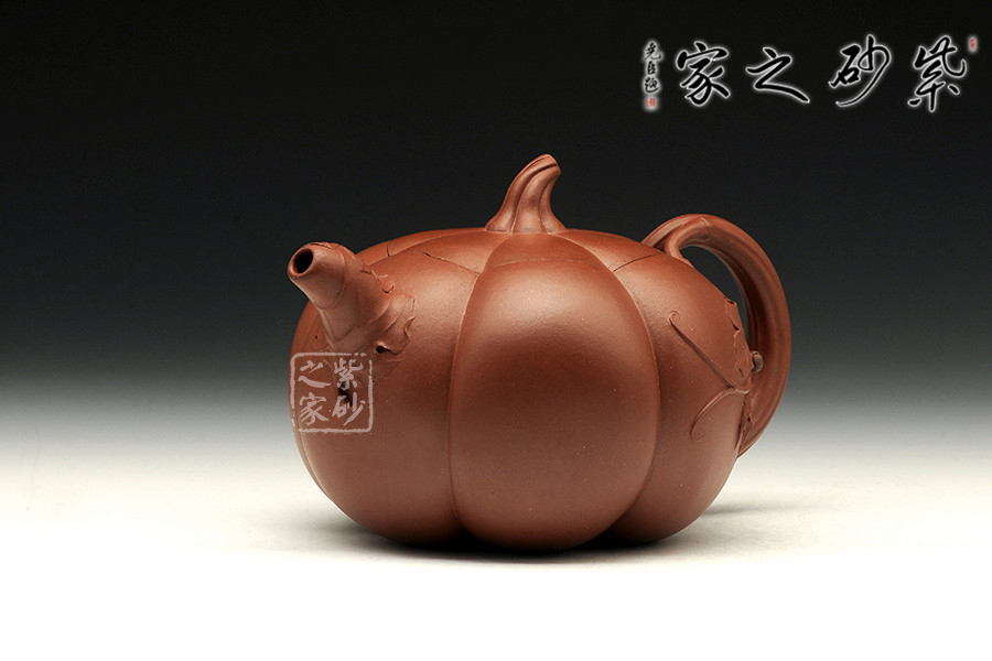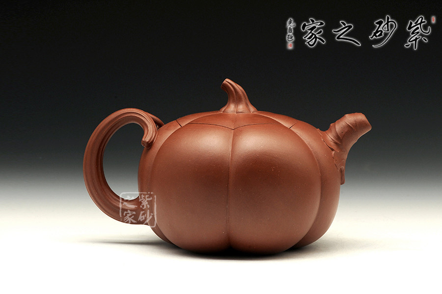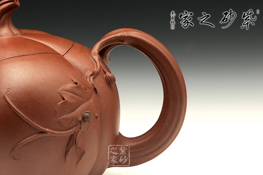 南瓜壺是紫砂壺中很常見的一種款型。此南瓜不僅外形酷似南瓜,更是集聚了南瓜的神韻,猶若瓜熟即將待落。壺鈕、壺把嫉皆以南瓜藤為原型,形象逼真。壺嘴則若南瓜葉包裹而成,精巧別致,創(chuàng)意極新。壺把處一南瓜葉子胥出,蒼老卻不失神氣。而南瓜壺身,紅色斑駁,極似熟透了的南瓜,讓人有快速采摘拿去熬湯的沖動(dòng)。此南瓜壺,顯然活矣!