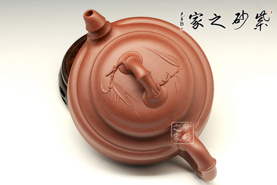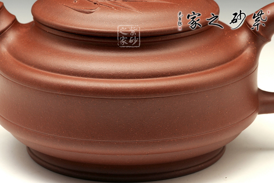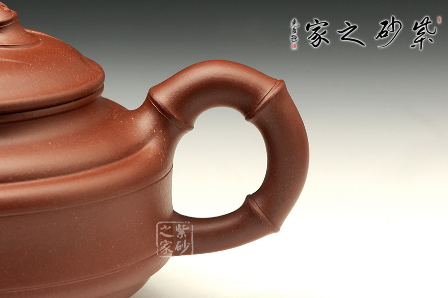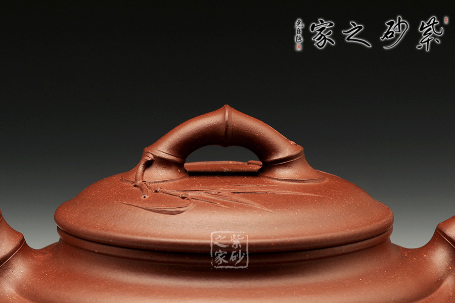 此壺為傳統(tǒng)壺型,傳承經典,端莊雅致,不失渾厚樸實,質拙中顯高意,值得擁有;的流把竹節(jié)造型,一彎嘴三節(jié)竹節(jié)裝飾而成,弧鈕散開在略微鼓起的壺蓋之上,蓋沿明顯厚于口沿,形成強勁的壓蓋之勢,耳形提把為三節(jié)竹節(jié)裝飾,兩條清晰的線條從壺腹中間穿過,似是一條寬闊的腰帶橫亙其中;加底,與壺口口徑一致,整款壺竹韻清疏,竹葉自壺鈕清淺胥出,貼于壺蓋之上,再也無其他裝飾,韻味不失,毫無矯飾。