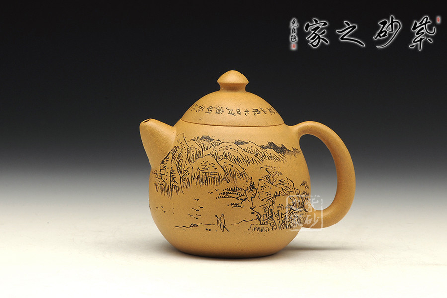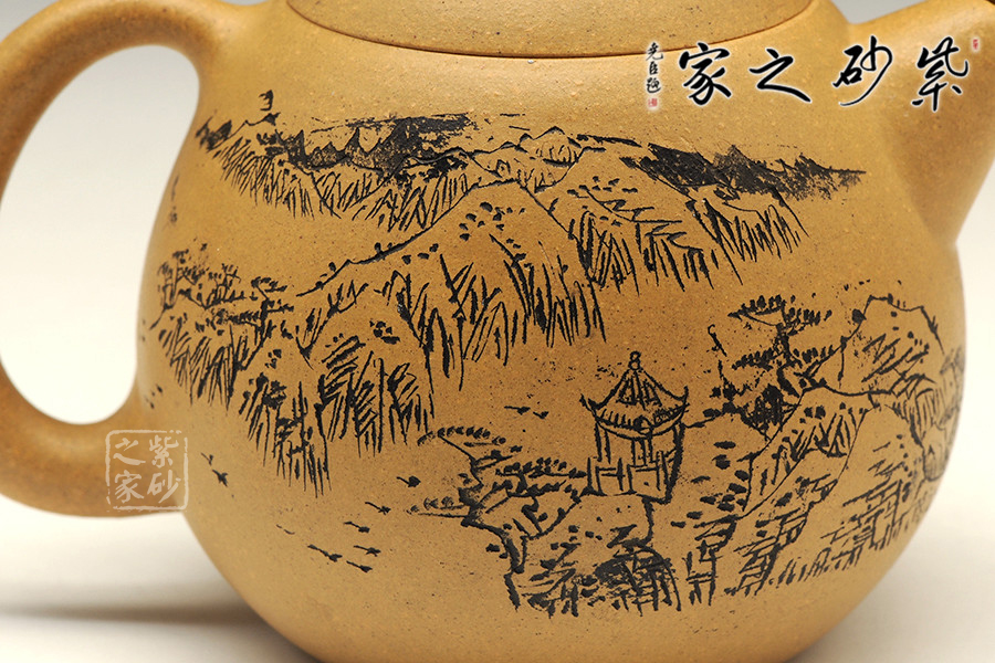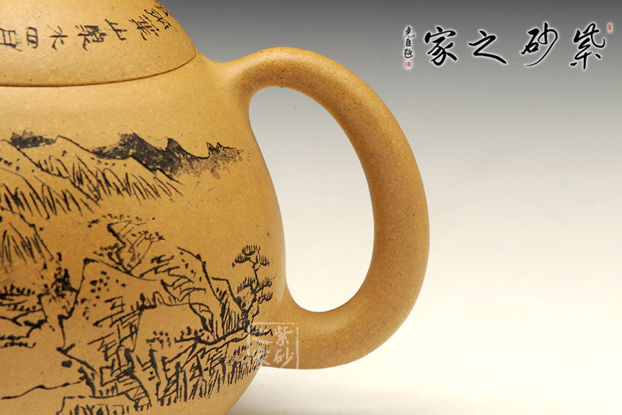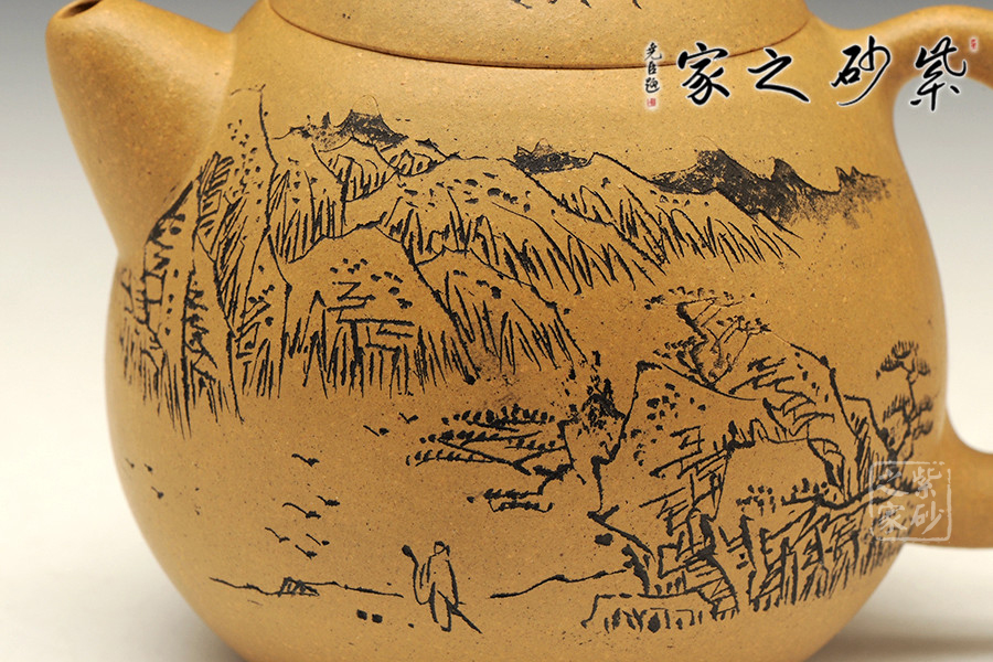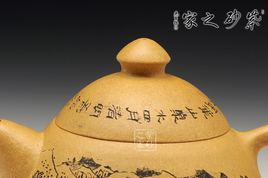 A面: 裝飾: 壺蓋刻繪 裝飾者:顧勤 裝飾內(nèi)容: “一心二葉山泉水, 四月清明午采茶”