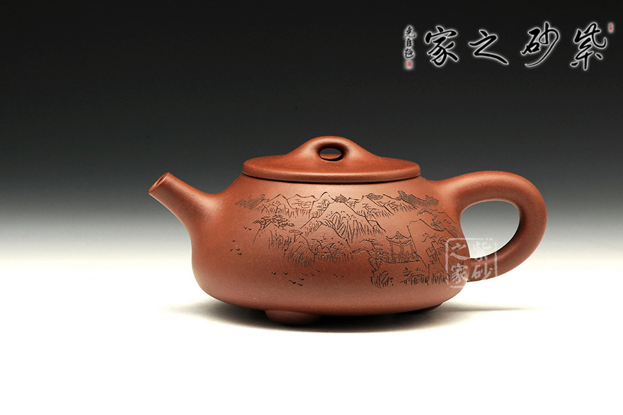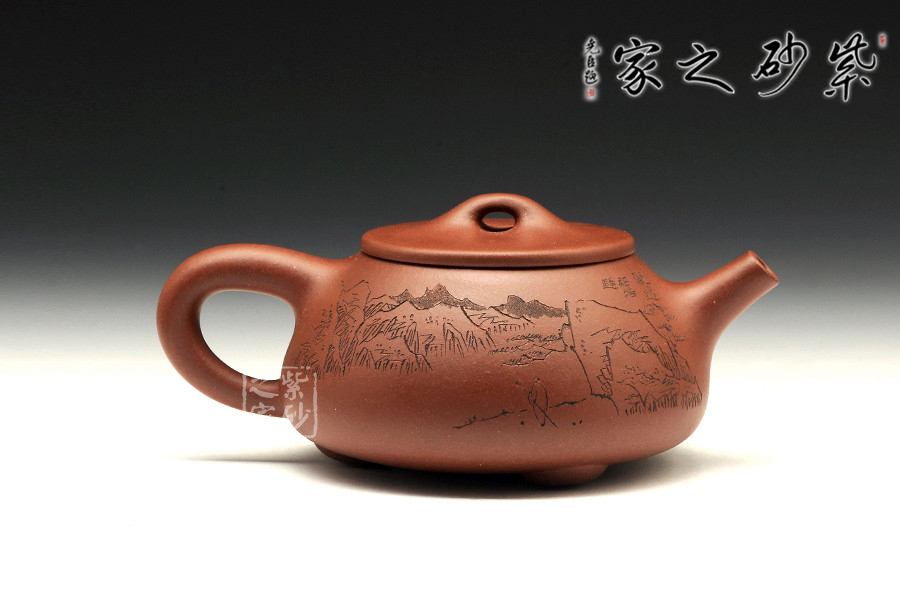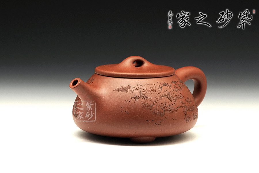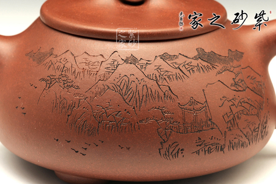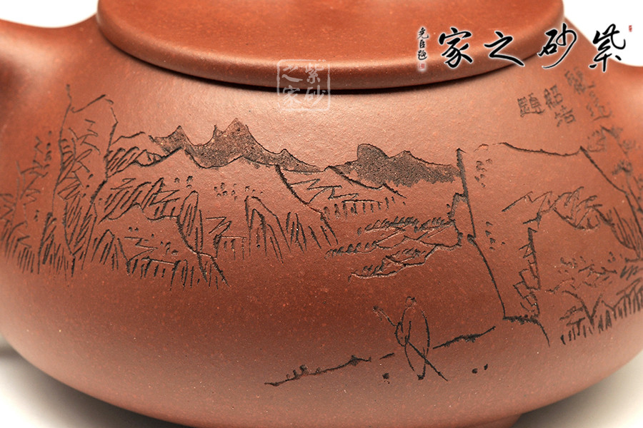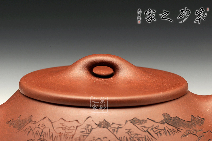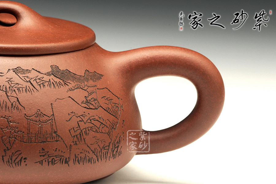 此款石瓢,工藝精湛細(xì)膩,壺蓋厚薄正好,線條圓潤(rùn),下要與口結(jié)合嚴(yán)密,上邊與蓋面的交接和順而又突出蓋板線的圓整有勁。蓋上的橋梁的(鈕),高矮跨度符合比例,變化較大。造型簡(jiǎn)練,古樸大方,端莊穩(wěn)重,剛中有勁,敦實(shí)調(diào)和。壺身描繪山水寓意,其意境更是耐人尋味!