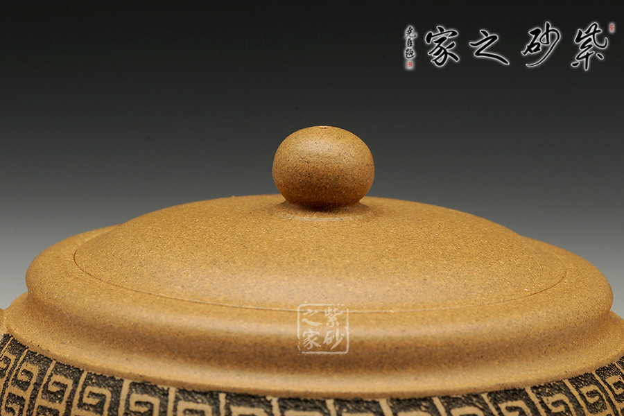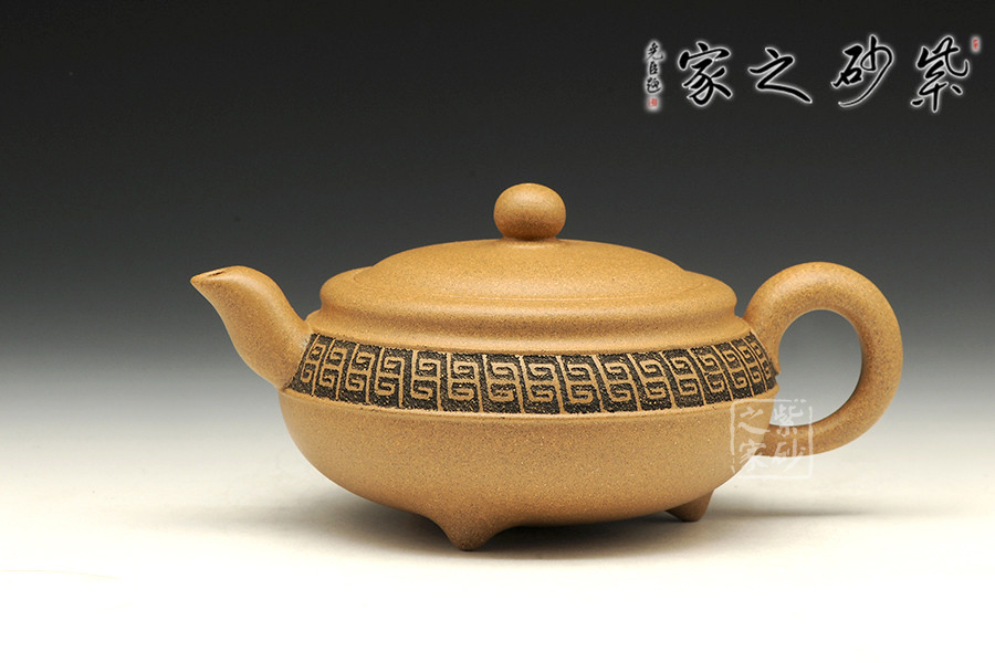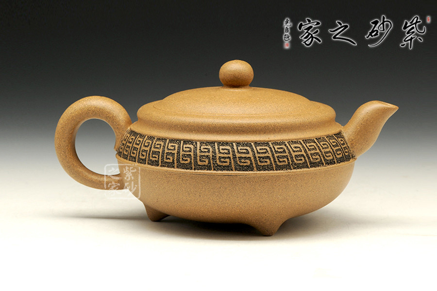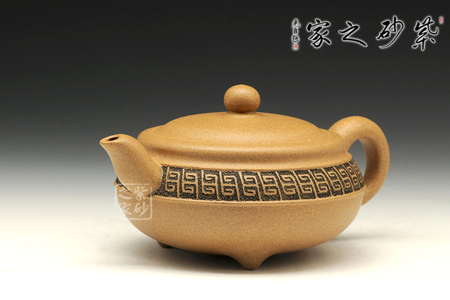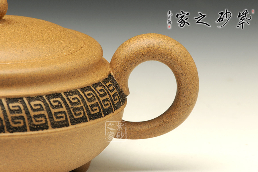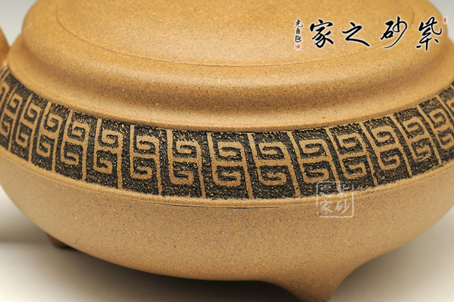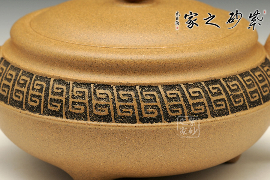 此壺肩頸雙線層疊,過渡和緩,使人藝美流連。壺身的形態(tài)更為生動(dòng),審美也隨之有了內(nèi)容。壺身扁圓小巧,口部與半蓋相切,三足鼎盛,圓珠鈕與蓋渾然一體,似如意吉祥,整個(gè)壺在扁圓中求韻味。