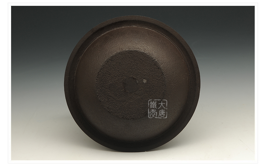鐵瓶內(nèi)底被稱之為“鳴金”的響片使得水燒開之后的煮沸聲更為悅耳。鐵瓶下側(cè)的“春齋”刻印以及共箱蓋子的題字都是作者親筆所寫。此為檢驗春齋鐵瓶真?zhèn)蔚臉酥局弧?/p>