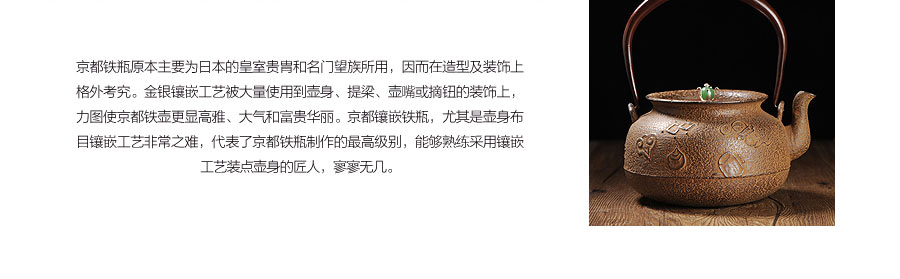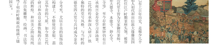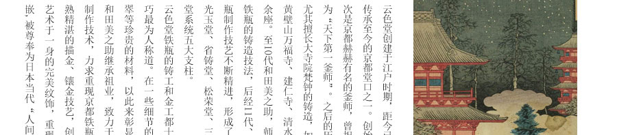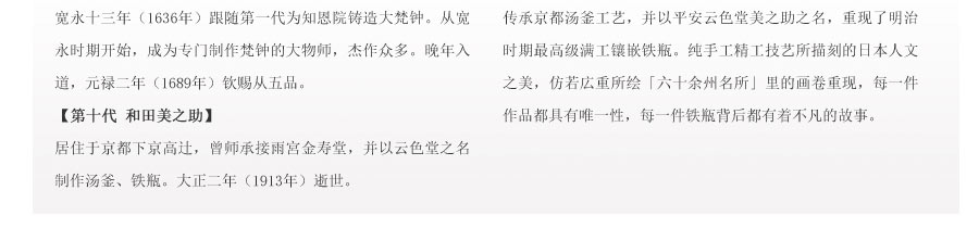 10代和田美之助親自前往雨宮金壽堂學(xué)習(xí)茶湯釜、鐵瓶的鑄造技法,深得京都鐵瓶的制作精髓。幾代人孜孜不倦努力,換來日益精進(jìn)的技藝與作品?,F(xiàn)在每天云色堂的作品都會在各地展出。如今第13代傳人和田美之助傳承京都湯釜制作工藝,鉆研并改良京都鐵瓶的古法制作技術(shù),重現(xiàn)明治時(shí)期最高級京都鑲嵌鐵瓶。