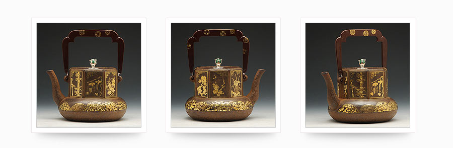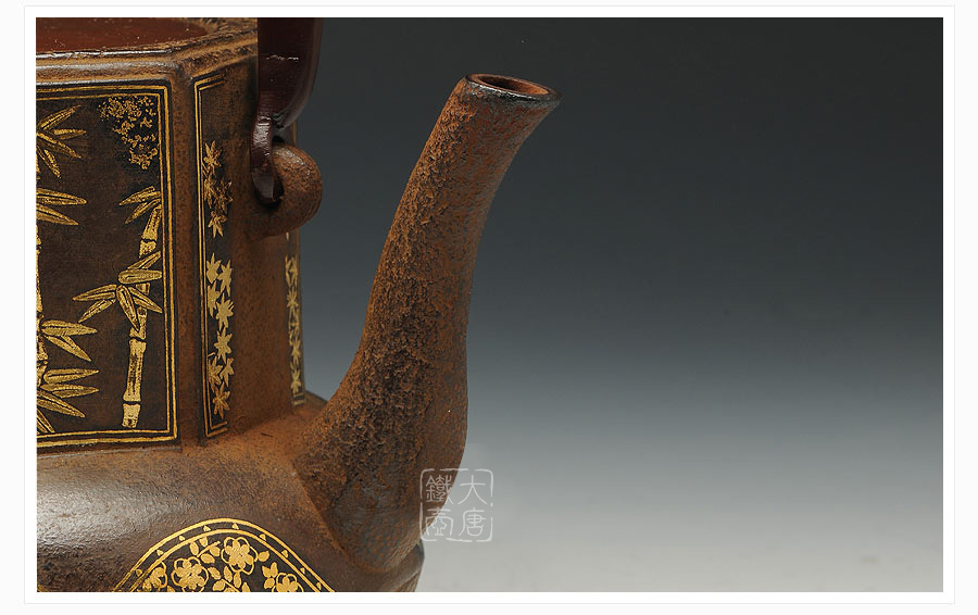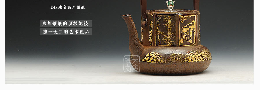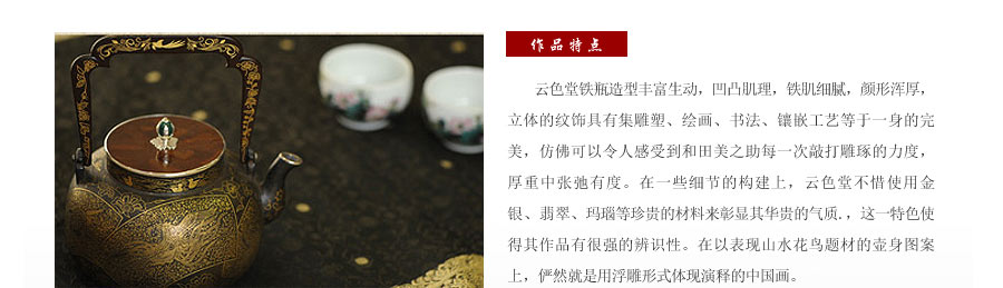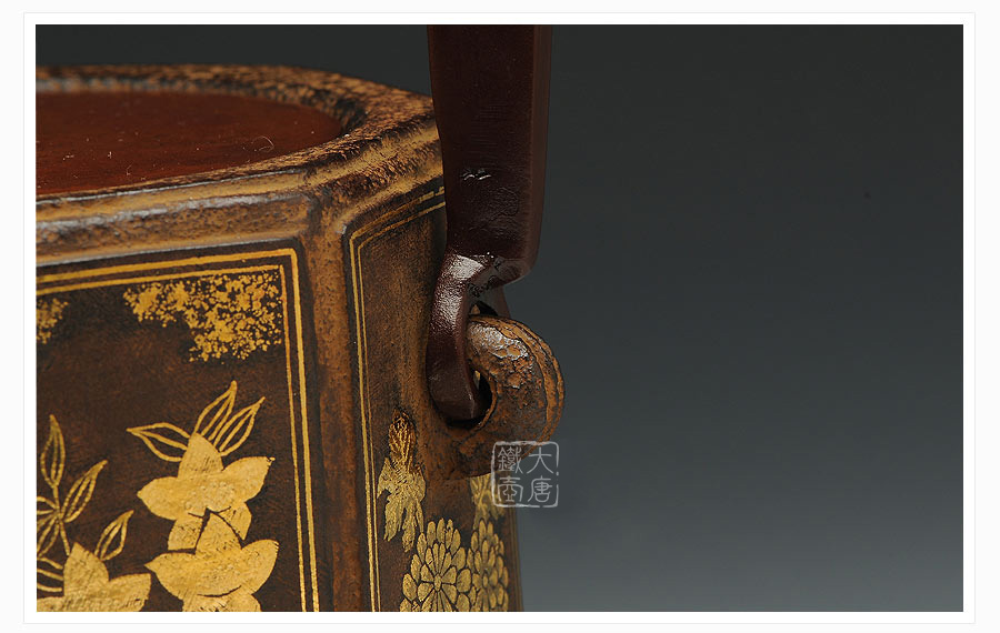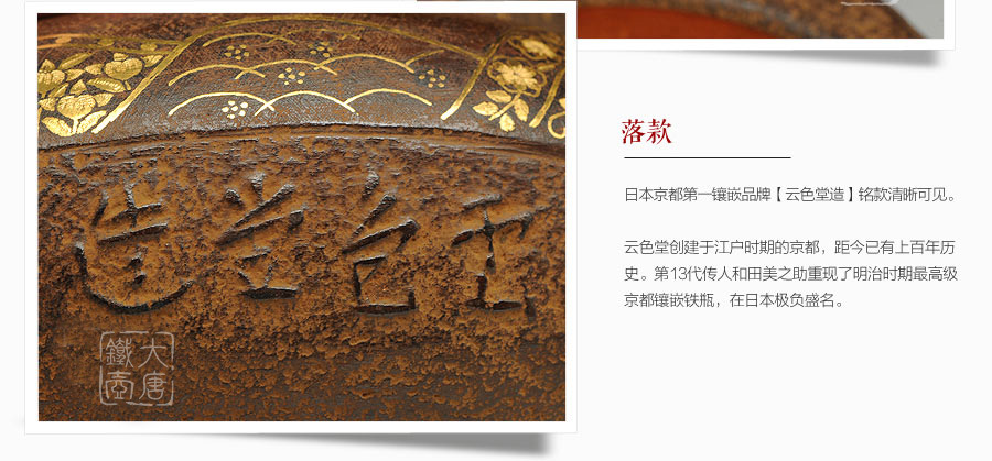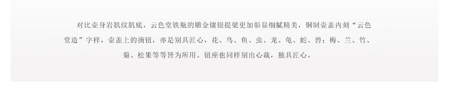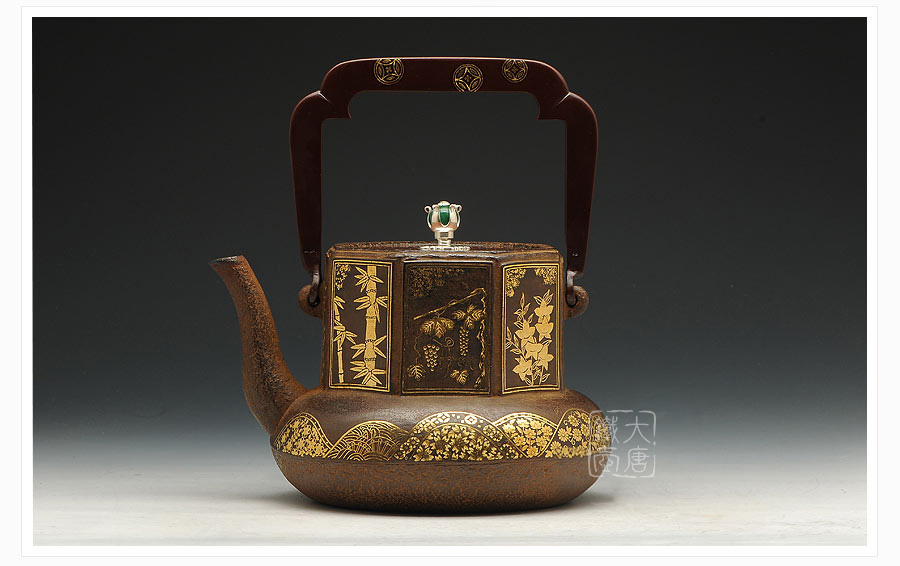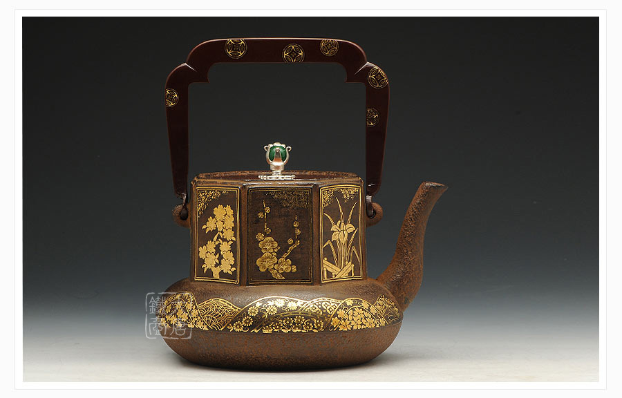 云色堂的鐵壺以豐美的裝飾技巧最為人稱道,描金及鑲金技術(shù)十分成熟。紋飾圖案的線條借鑒了日本古典瓷器的樣式。同時(shí)在一些細(xì)節(jié)的構(gòu)建上,云色堂也不惜使用珍貴的材料來彰顯他華貴的氣質(zhì)。在眾多堂口的鐵瓶中,這種特色使得其作品有很強(qiáng)的辨識性。