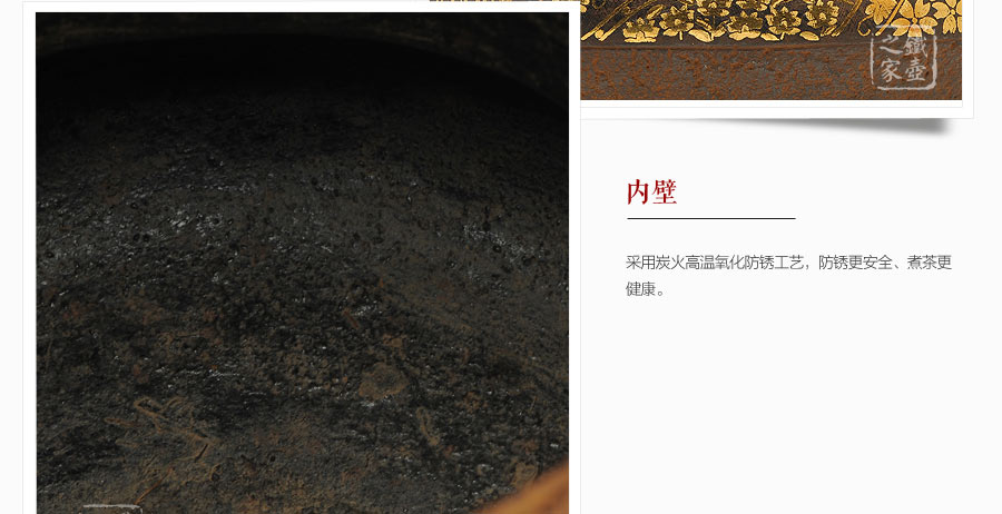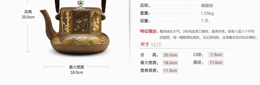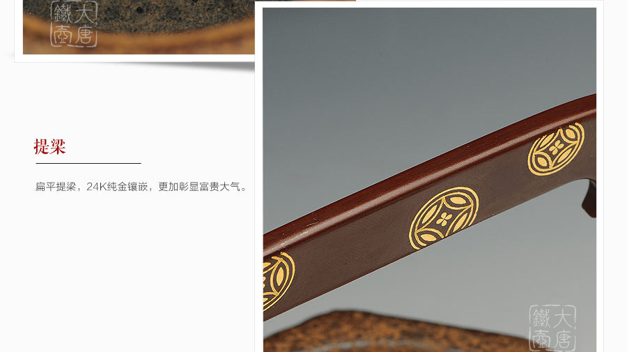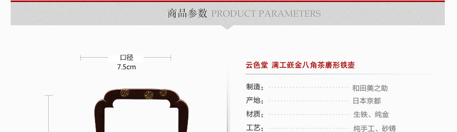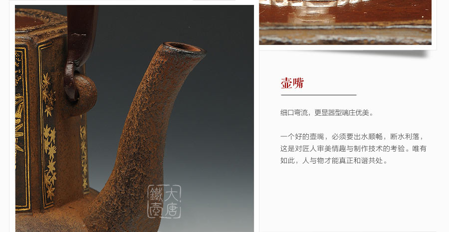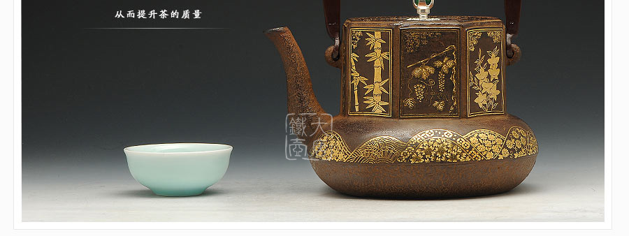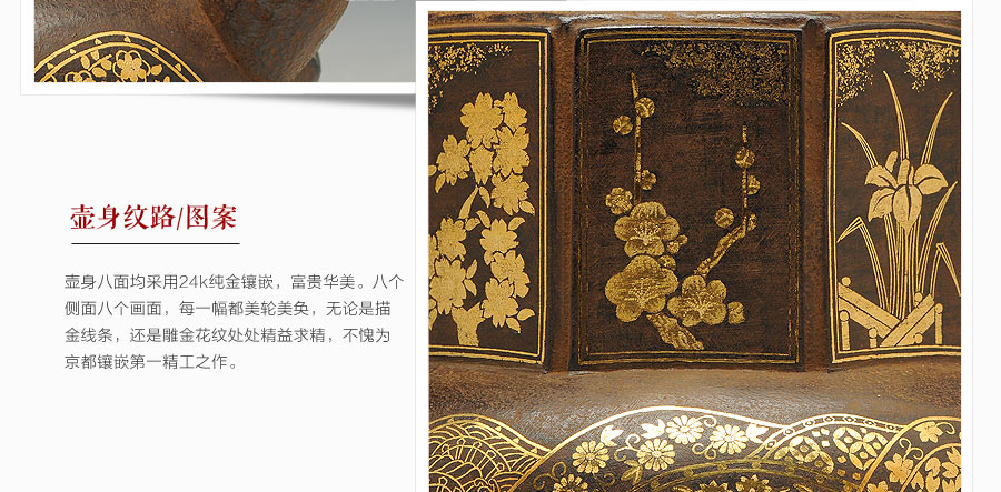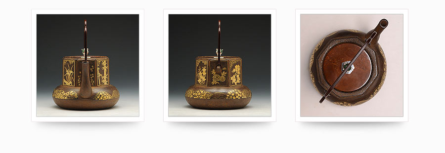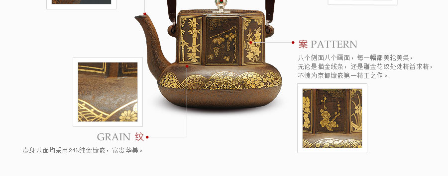 云色堂的鐵壺以豐美的裝飾技巧最為人稱道,描金及鑲金技術(shù)十分成熟。紋飾圖案的線條借鑒了日本古典瓷器的樣式。同時(shí)在一些細(xì)節(jié)的構(gòu)建上,云色堂也不惜使用珍貴的材料來彰顯他華貴的氣質(zhì)。在眾多堂口的鐵瓶中,這種特色使得其作品有很強(qiáng)的辨識性。