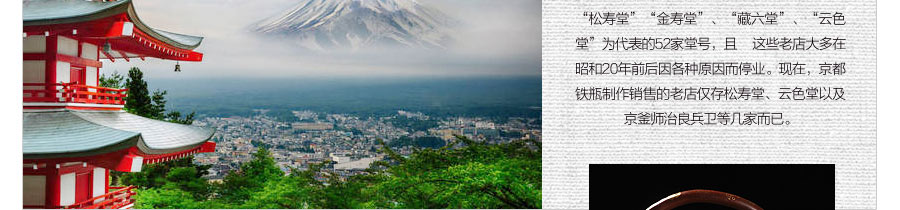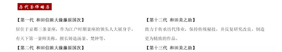 云色堂創(chuàng)建于江戶時(shí)期的京都,距今已有上百年歷史。創(chuàng)始人和田信濃大掾藤原國次是京都當(dāng)時(shí)赫赫有名的釜師,被譽(yù)為“天下第一釜師。之后的幾代堂主皆為御用釜師,參與建造許多大寺院梵鐘,如大德寺、本能寺、妙心寺、黃壁山萬福寺、建仁寺、清水寺等,現(xiàn)存世梵鐘仍有百來座。