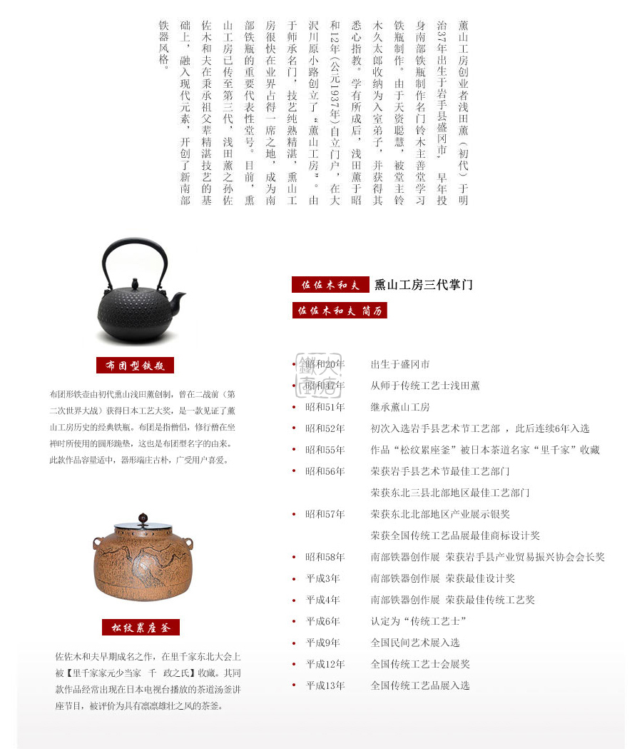 佐佐木和夫是薰山初代目淺田薰得弟子,承接下薰山第三代的招牌。他參考了許多設(shè)計(jì)的元素應(yīng)用于創(chuàng)作,并于其他藝術(shù)家做交流。例如臺(tái)灣知名壺藝家鄧丁壽,兩人曾分別以生鐵與陶土制作出共同設(shè)計(jì)的新式壺形,被傳為佳話。佐佐木和夫的作品經(jīng)常獲得各項(xiàng)獎(jiǎng)。在平成六年(一九九四年)被國家認(rèn)定為傳統(tǒng)工藝士。