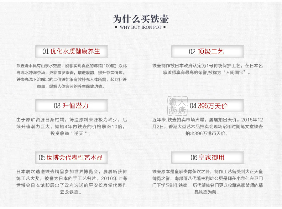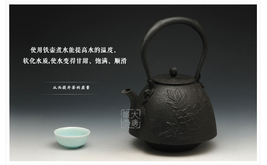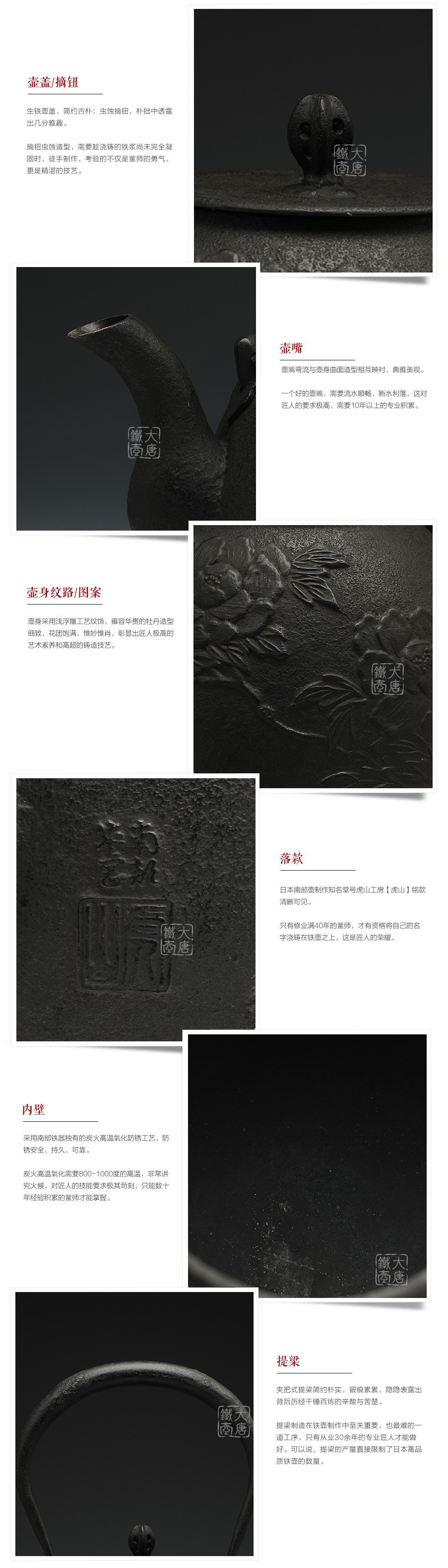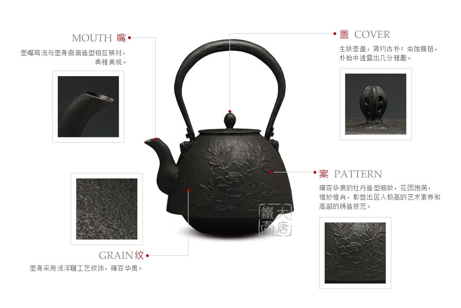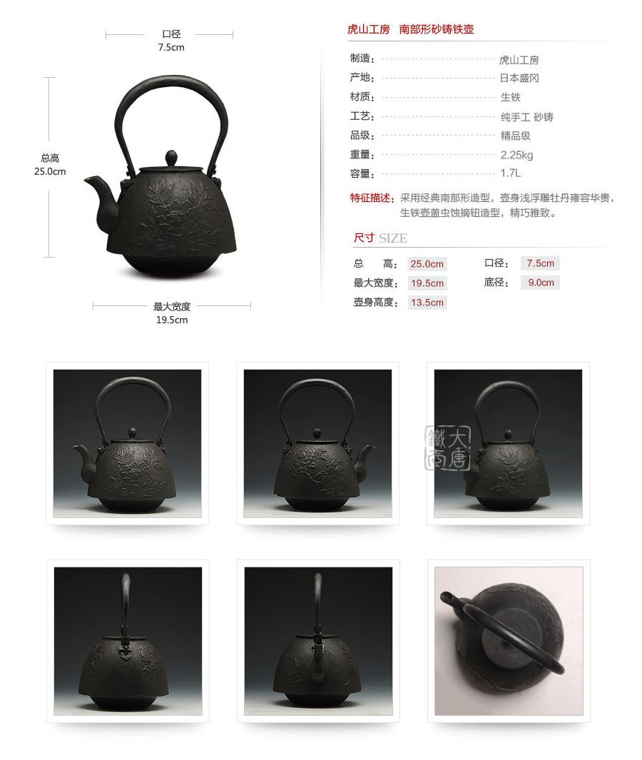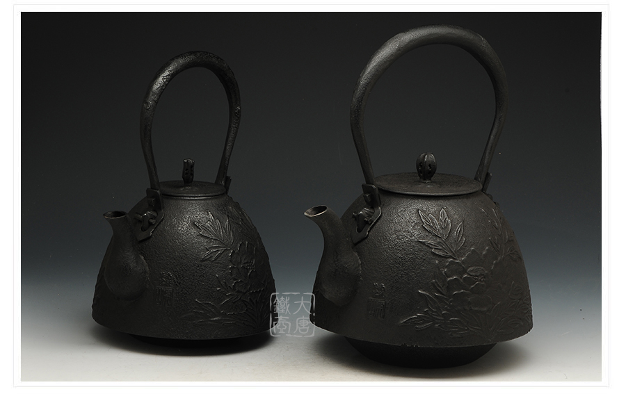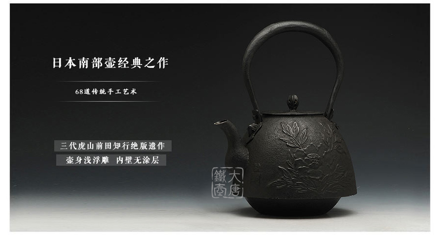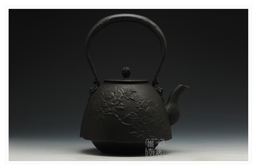 南部鐵器知名堂口虎山工房作品,采用經(jīng)典南部形造型,壺身淺浮雕牡丹雍容華貴,生鐵壺蓋蟲蝕摘鈕造型,精巧雅致。內(nèi)壁采用南部鐵器獨(dú)有的炭火高溫氧化防銹工藝,防銹安全、持久、可靠。