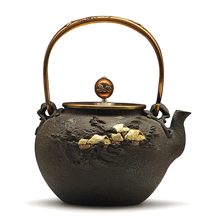 虎山工房創(chuàng)立于1955年,位于盛岡市手作村,是日本南部鐵器中的重要代表?!被⑸健敝从诔醮獛熜芄绕郊某錾厥且郧澳喜糠曫B(yǎng)老虎的地方,故取“虎山”作為工房的名字。熊谷平吉擅長印刻湯釜和鐵瓶上的圖案,制作的鐵器帶有濃厚的藝術(shù)氣息,被視為鐵和火融合于一身的茶道藝術(shù)品?;⑸焦し恐谱鞯蔫F瓶,主要以砂模澆鑄的方法為主,但是改進(jìn)了木質(zhì)刮板的制模技術(shù),從而得以制作出多邊形的鐵器,在南部鐵器中獨(dú)樹一幟。
