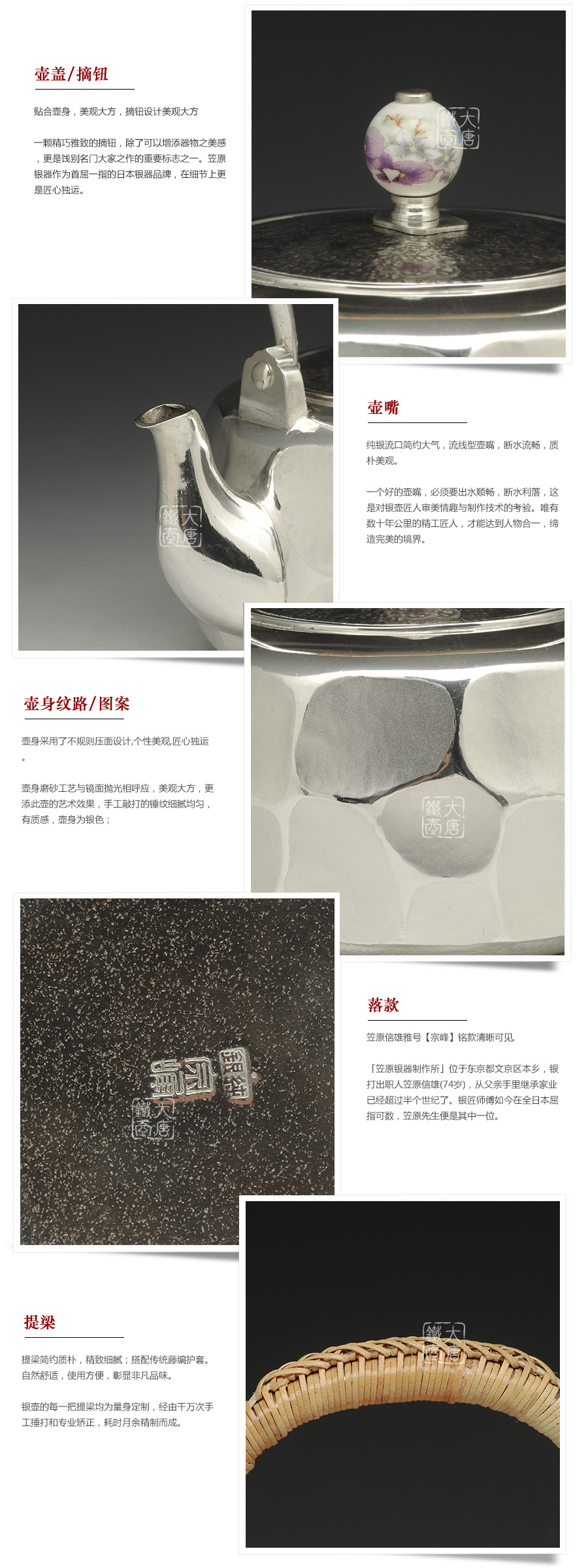 笠原銀器制作所,位于東京都文京區(qū)本鄉(xiāng)。所里笠原信雄是日本屈指可數(shù)的銀匠師,從父親手里繼承家業(yè)已經(jīng)超過半個世紀(jì)。他家的銀是完全沒有混金的純度為100%的純銀(日本的純銀指標(biāo)與中國不一樣,日本的純銀指標(biāo)為純度99%以上。)加工的關(guān)鍵工具鐵棒都是手工制作,代代相傳。