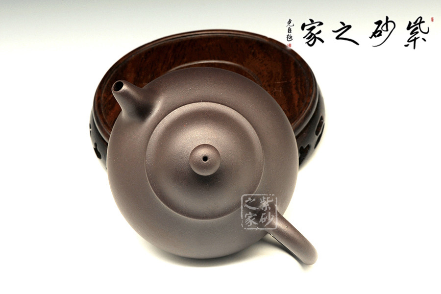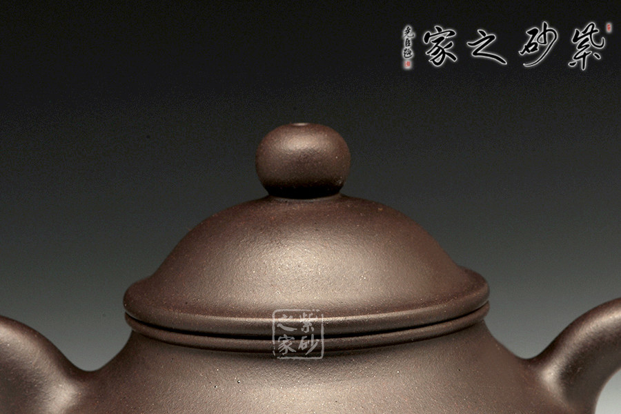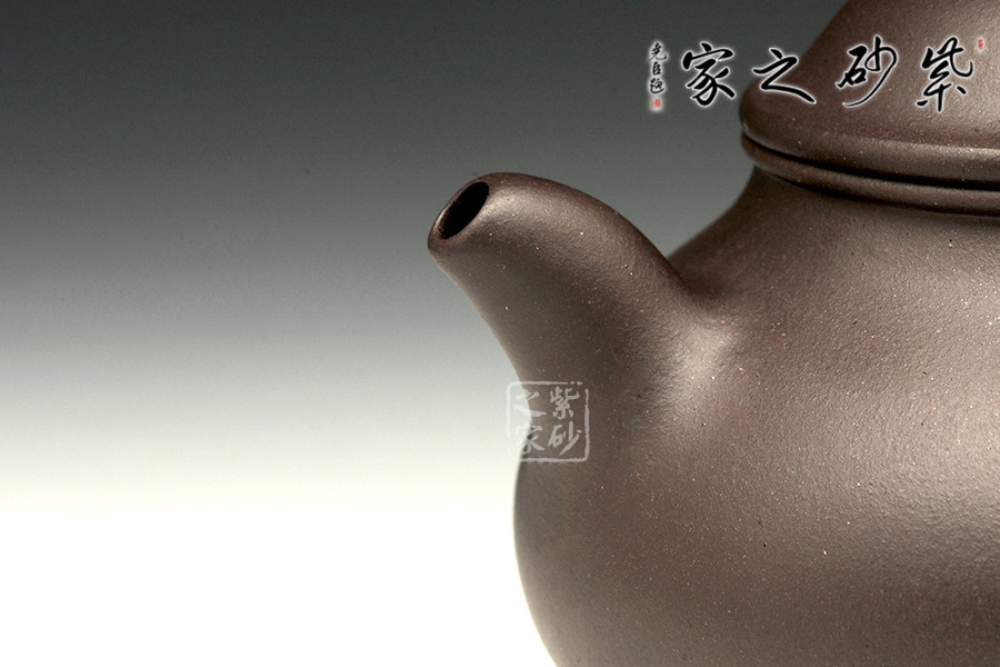 壺鈕為一圓珠,豐潤圓滿,精氣神十足,于壺頂,起提神聚氣之功效。壓蓋,口蓋縫平。蓋形吐出飽滿,呈壓扁圓弧形。壺嘴自然上揚,略彎曲,出水流利。