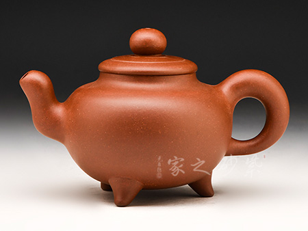 此壺造型如同一鼎,渾圓鼎型,三足支撐穩(wěn)重有力。壺嘴向前,似直似曲,與壺身相融。流把與整器呼應(yīng),剛健有力,和諧有度。壺蓋配以橋型鈕,口與嵌蓋密不透風(fēng),整器散發(fā)出一種霸氣而優(yōu)雅的氣質(zhì)。
