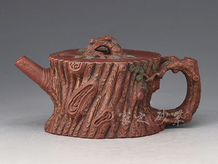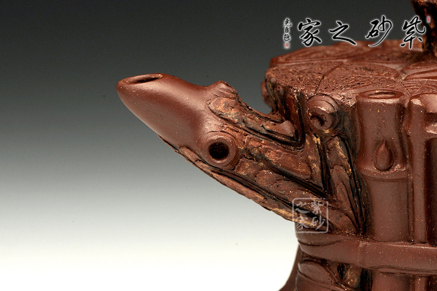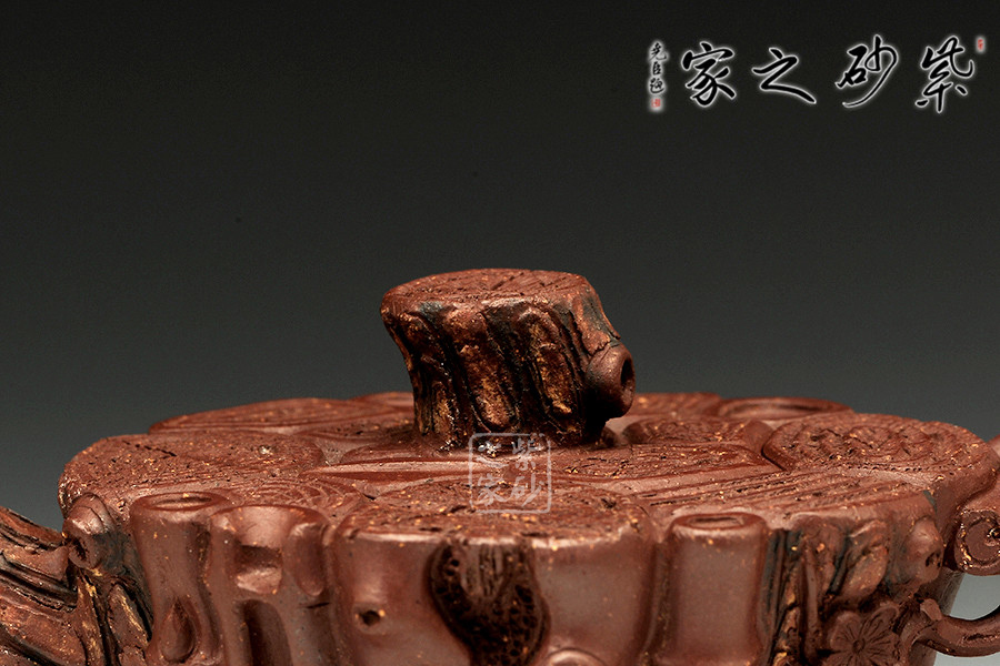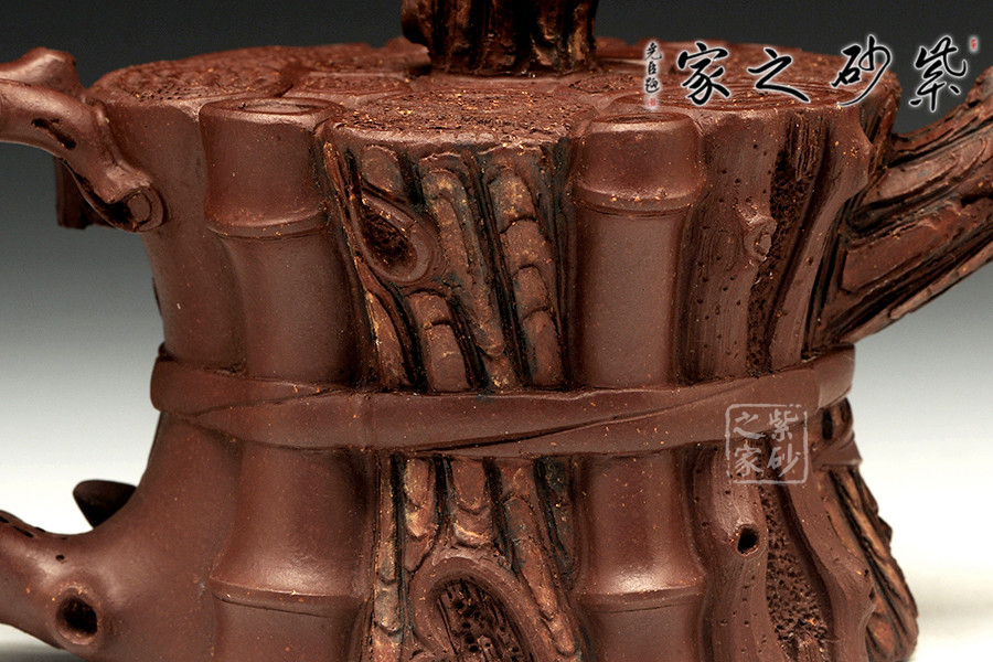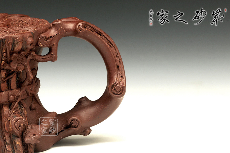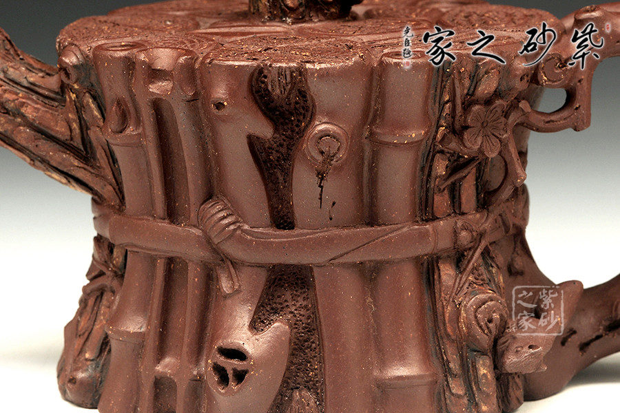 此壺集松、竹、梅三干而成,亦稱“歲寒三友”,意指寒冬臘月,獨近自然之精神。壺身仿似松、竹、梅三樹段束于一體,松段的松鱗、松針,梅段的桿枝、花卉,以及竹段的竹節(jié)、竹葉,都刻劃仔細,自然夾置,于繁復中見規(guī)整條理。壺把狀若虬屈的梅枝,壺流有如橫生的松枝。全器渾若天成,不愧為絕妙名壺。