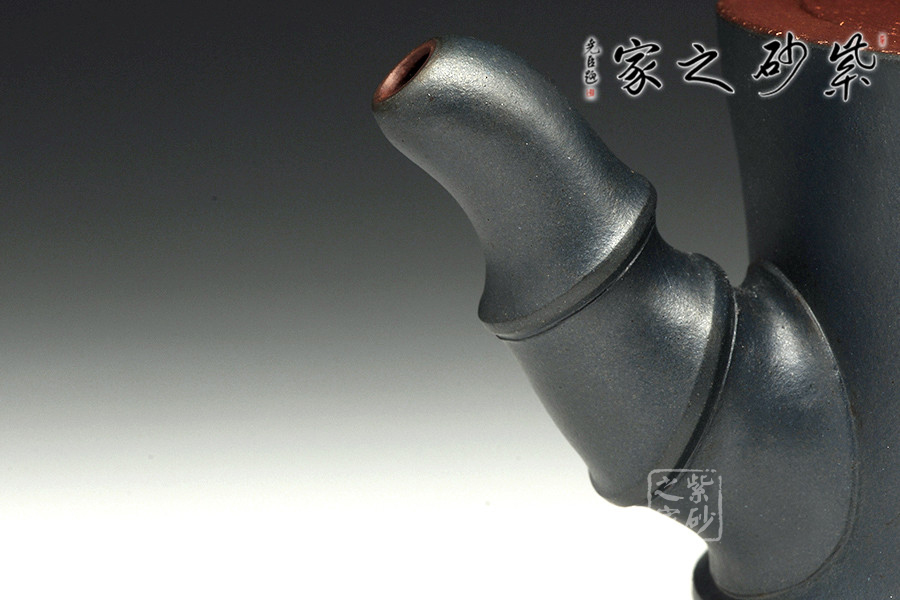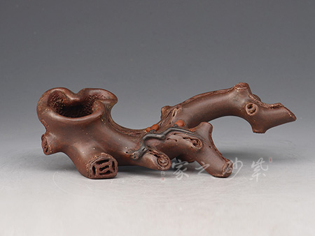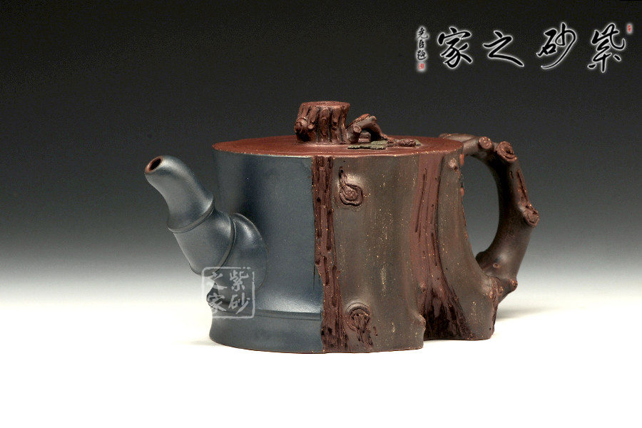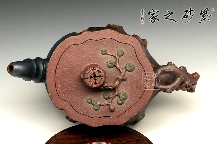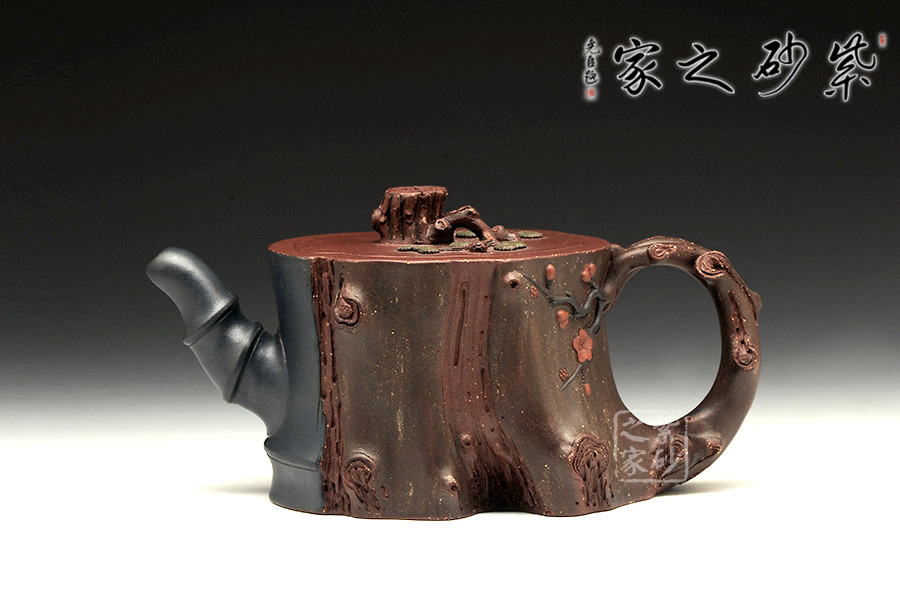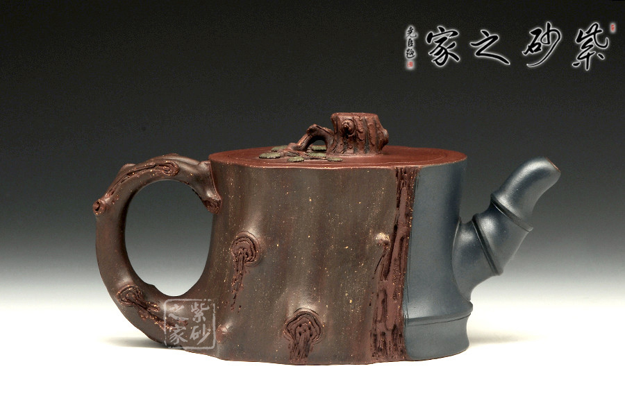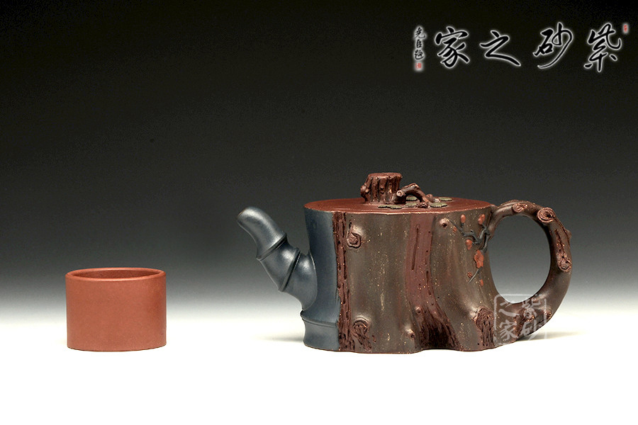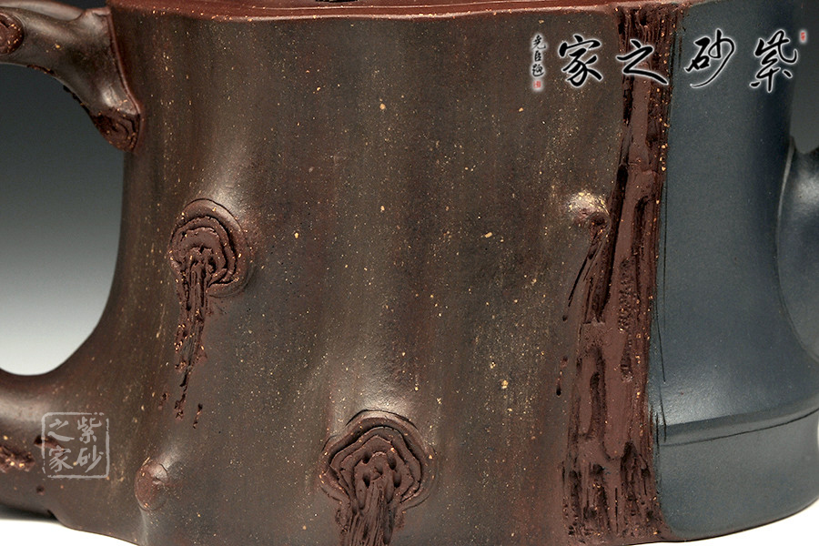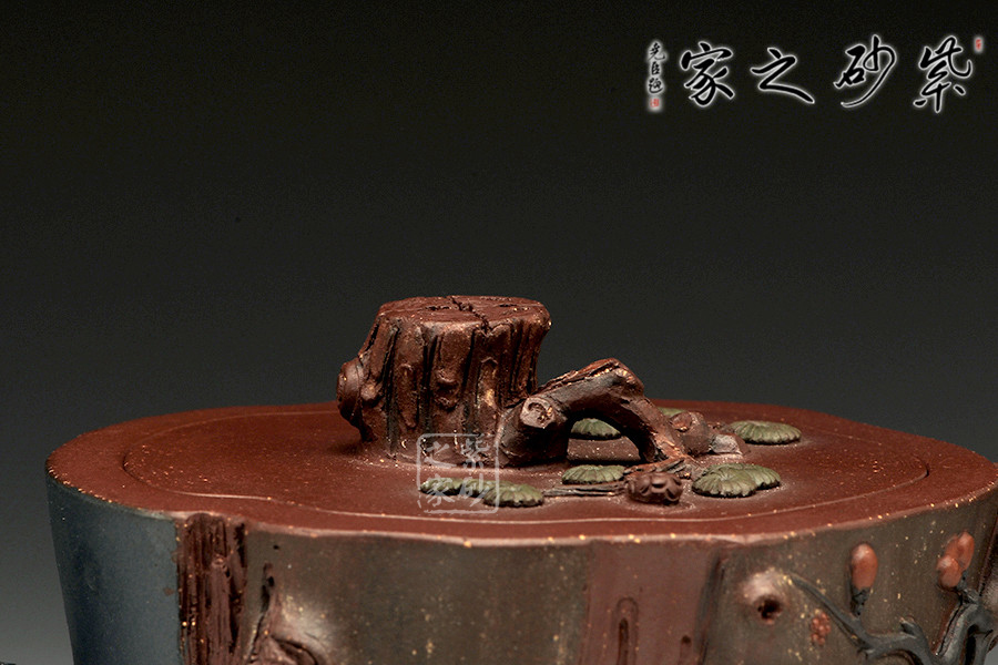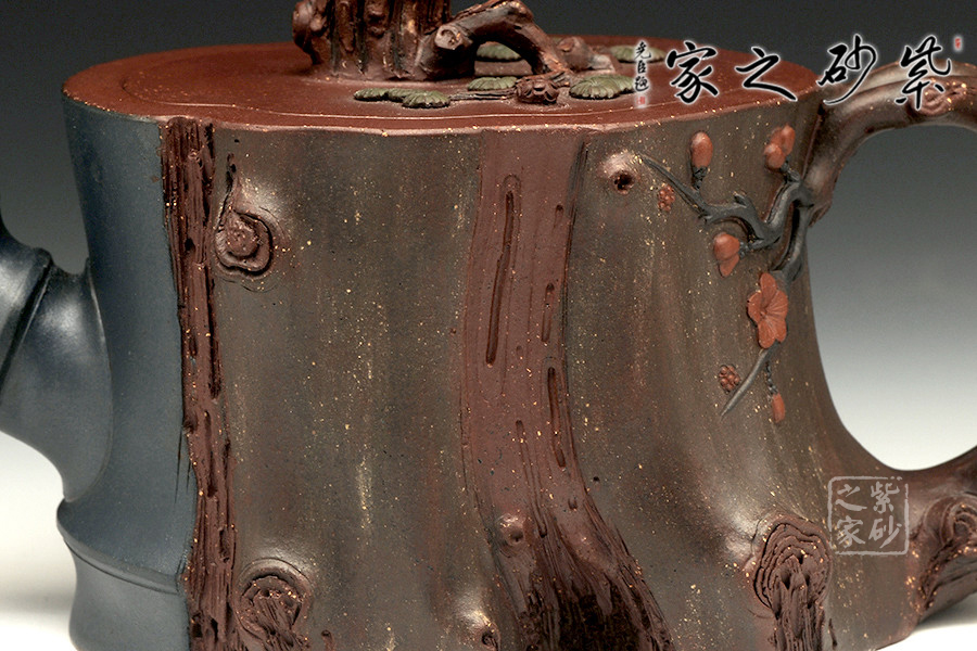 此壺為仿生形態(tài),做得逼真自然,能讓人喜歡。樹木的形態(tài)上下貫通,逼真自然。樹樁粗細(xì)不同,上下全不規(guī)則,再加上各種瘢痕、裂紋、樹皮的模樣,更顯得樹樁十分生動(dòng)。壺嘴是竹節(jié)、壺鈕是松樁、壺把則是梅枝,有彎有直,有收有放,粗細(xì)不一,將樹樁壺點(diǎn)綴得尤其逼真。