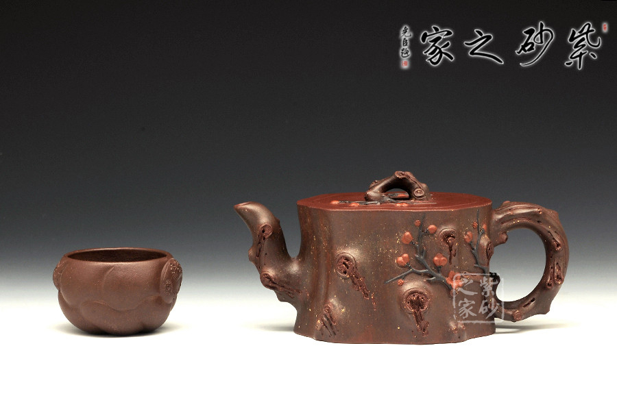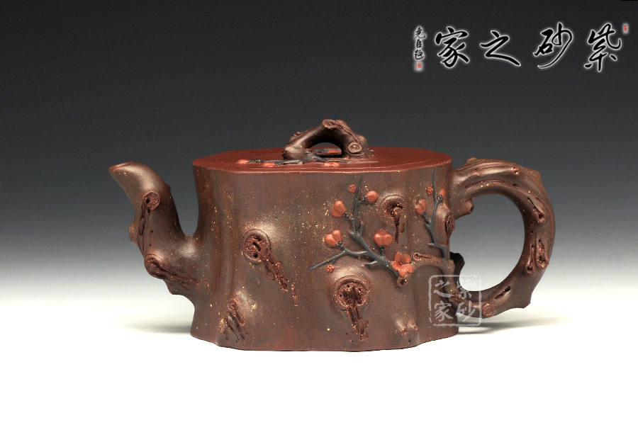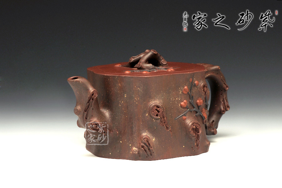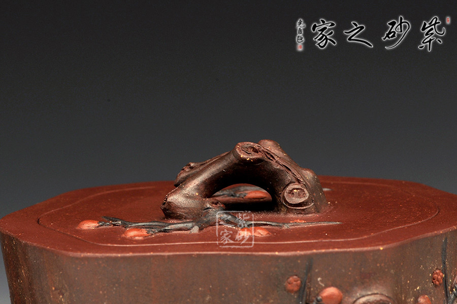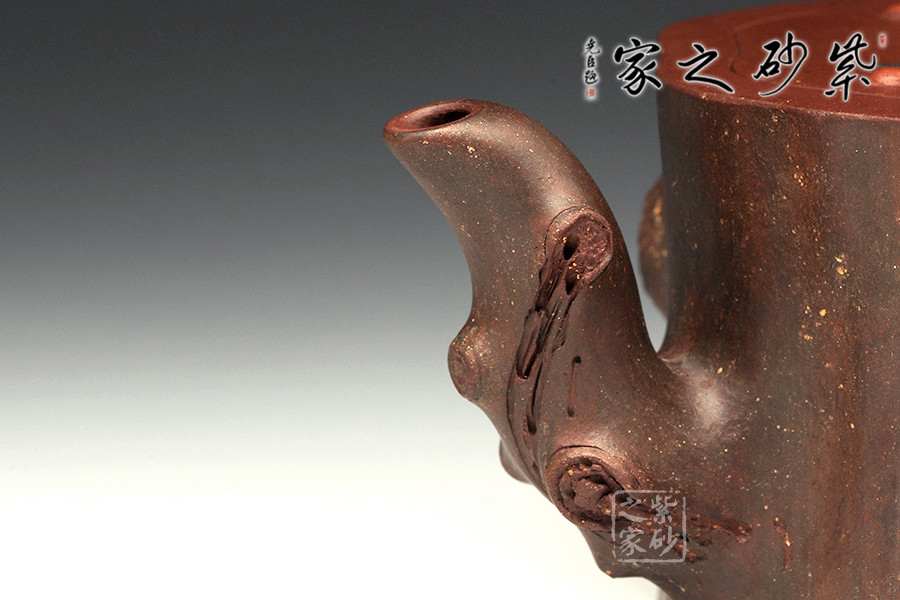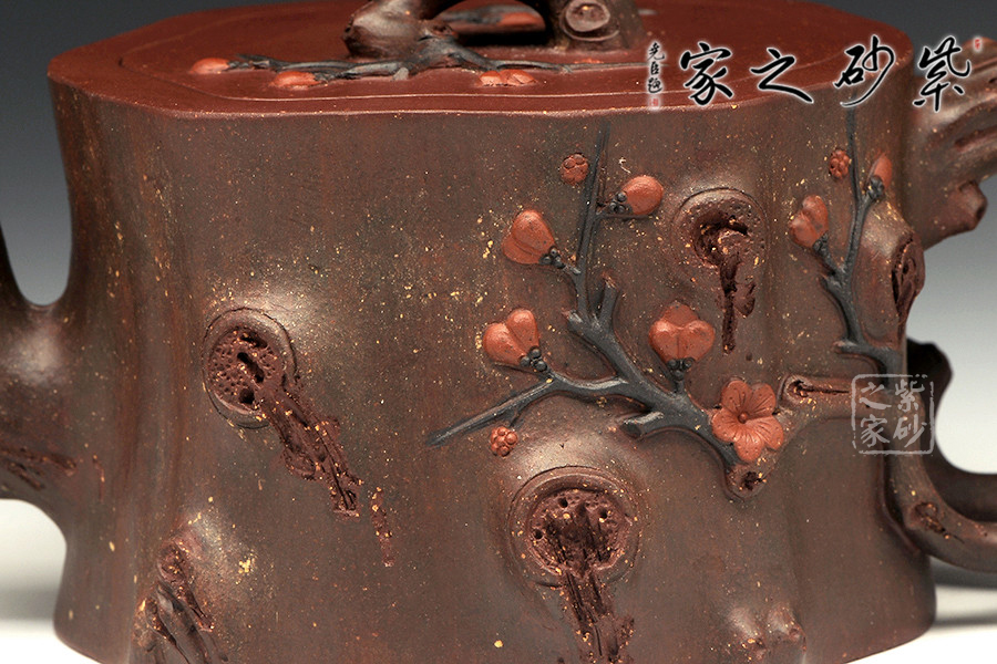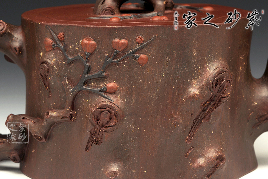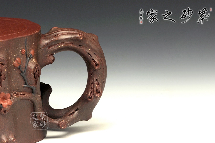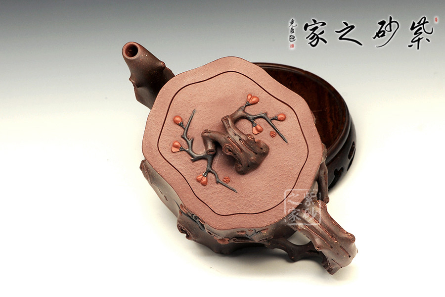 壺身、流、把、蓋全部是用極富生態(tài)的梅樁、樹皮及纏枝組成,形態(tài)自然而富含力度;壺上梅花采用堆花技藝手法,壺嘴壺把為梅樁衍生出的枝干,伸展自然,有如自然長成,仿生性極強,充滿了生命的活力;壺把和壺鈕處胥出梅花,疏影橫斜、暗香動人;壺身融圓、壺足挺立,壺蓋穹窿,整體制作到位,此壺做工精細(xì),氣度非凡,實用性觀賞性都很好,是把玩收藏之佳作!