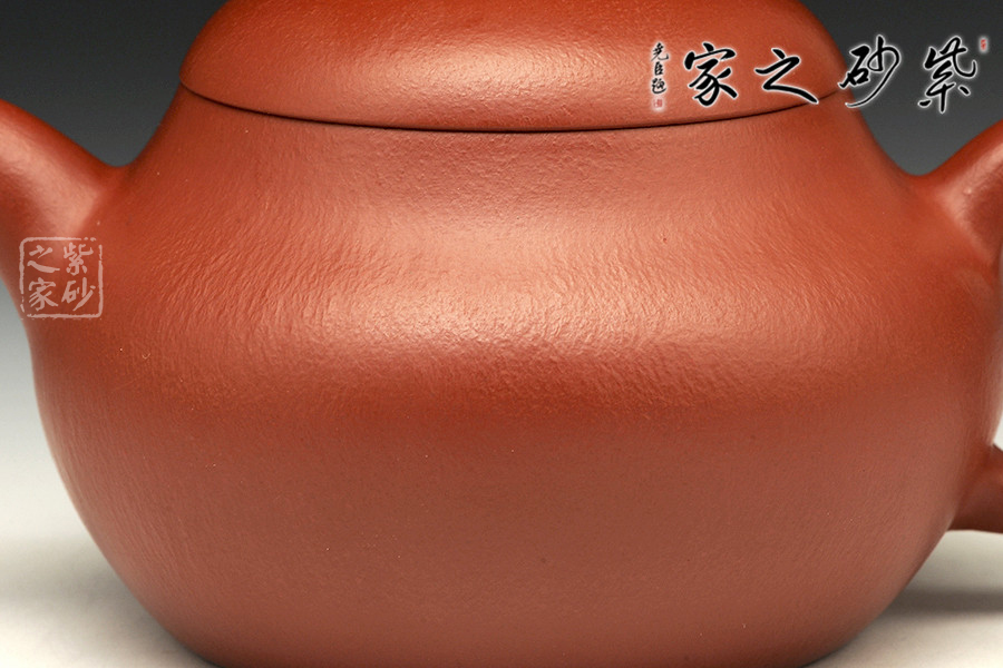 特點:質(zhì)感綿密、緊實細緻,持之扎實沉重、紅潤豔麗,泥中極品,無以倫比;泥胚含少許原礦顆粒,沖淋熱水后色變極大,呈紅中帶紫,養(yǎng)壺易現(xiàn)“包漿”之美。