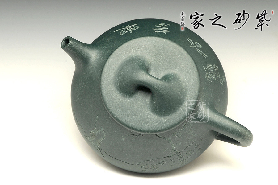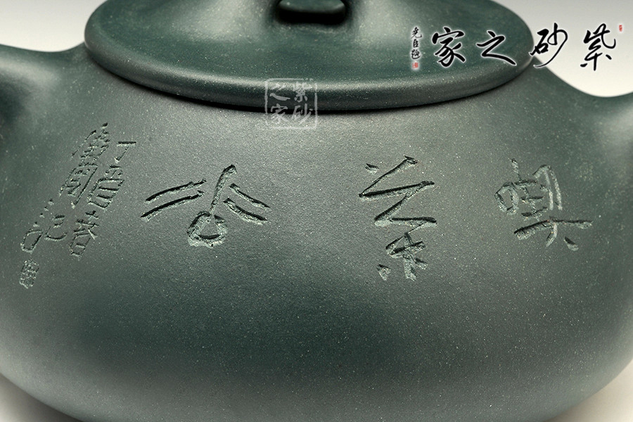 造型簡練,古樸大方,剛中有勁。流把鈕均為暗接手法,與壺身宛若一體,可見功力。橋鈕搭接在平蓋之上,直流嘴,三角把拐角處略微圓潤;壺身較為飽滿,乳足圓潤,略見憨態(tài),透露幾分柔美,文人氣息頗濃。