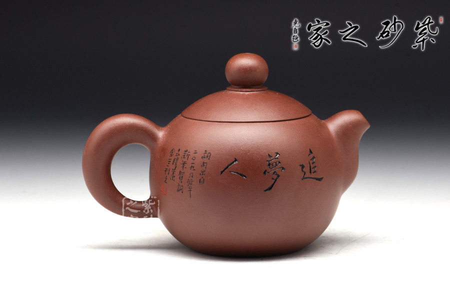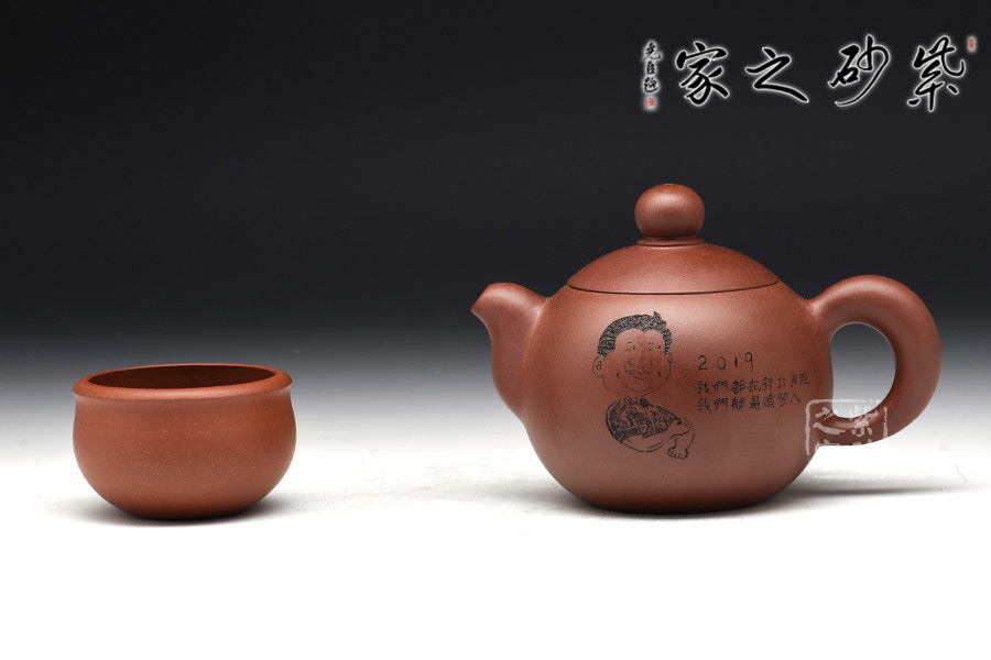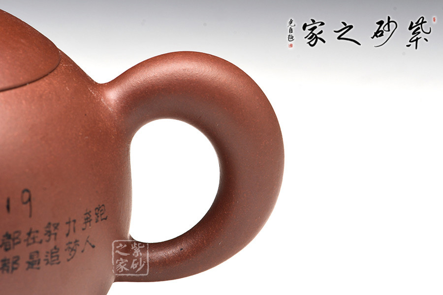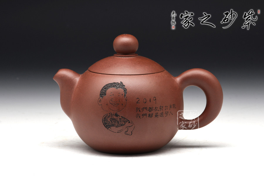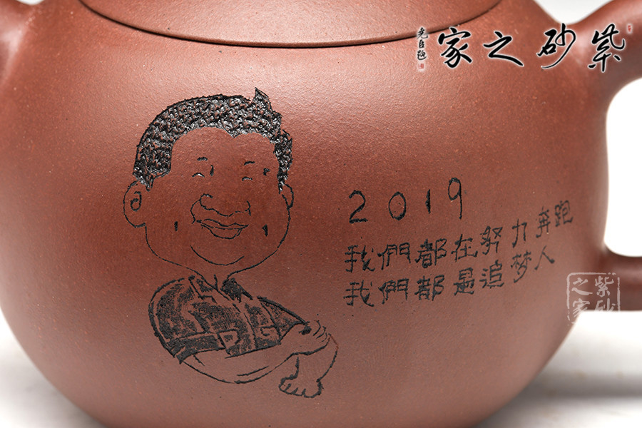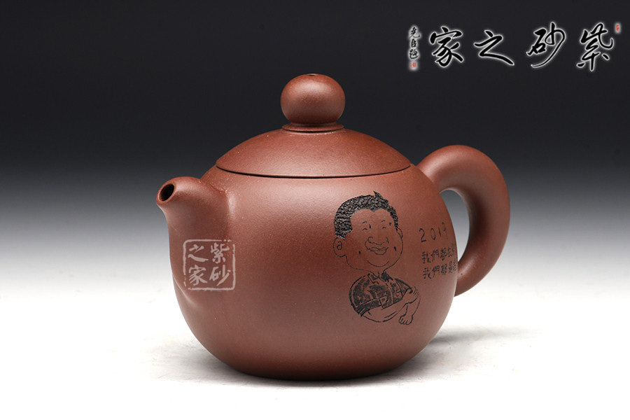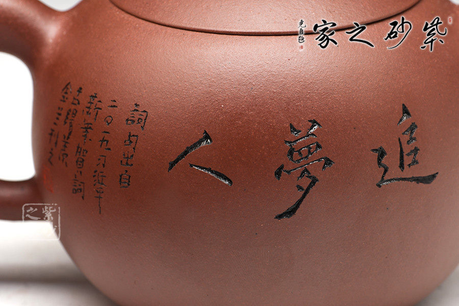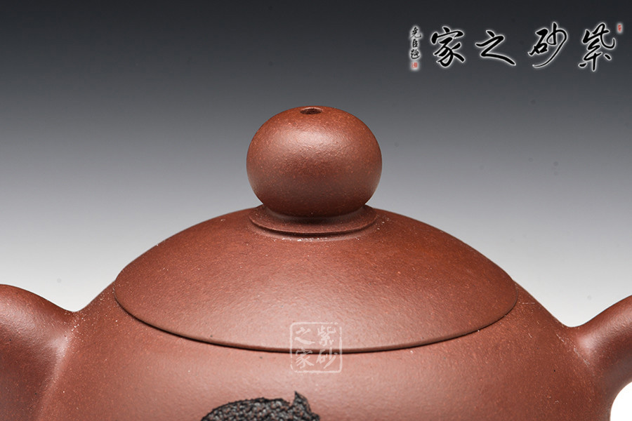 此壺器型非常簡(jiǎn)潔,圓潤(rùn)的壺身線條一起合成,壺蓋為截蓋,與壺身連接成一體,密不可分。壺鈕為圓珠造型,與壺身上下呼應(yīng),以圓堆疊,壺把和壺嘴是暗接的,工藝巧妙,不見接痕,最特別的還是壺身上的刻繪,將古典與現(xiàn)代結(jié)合,可謂是大膽的嘗試。