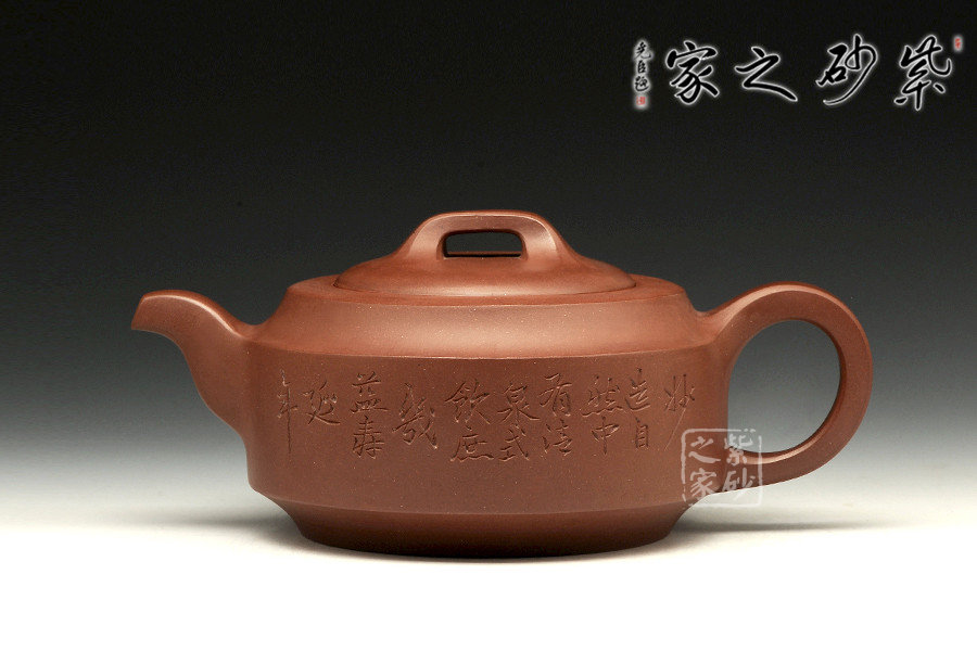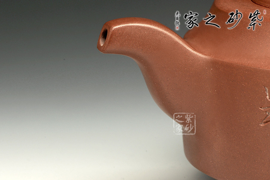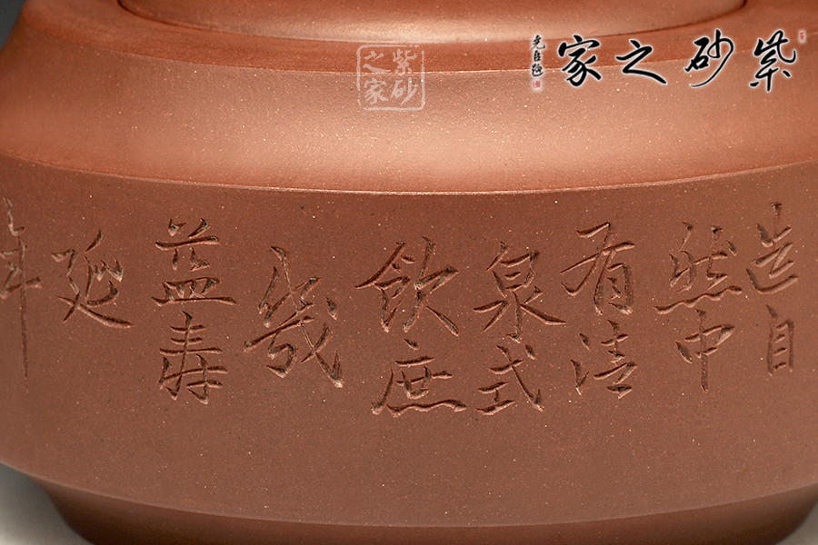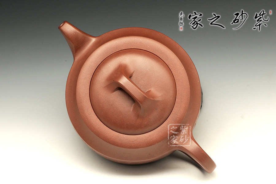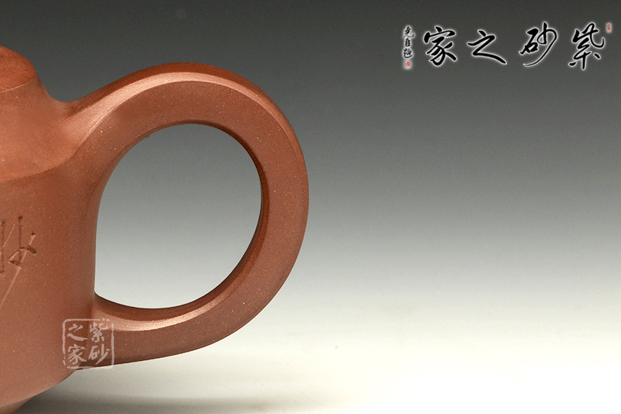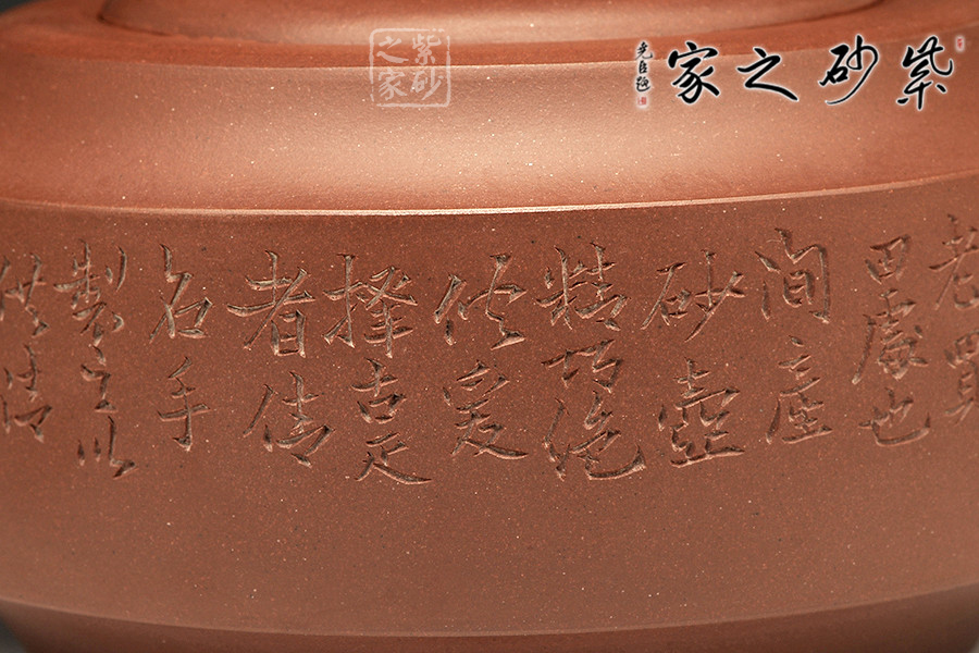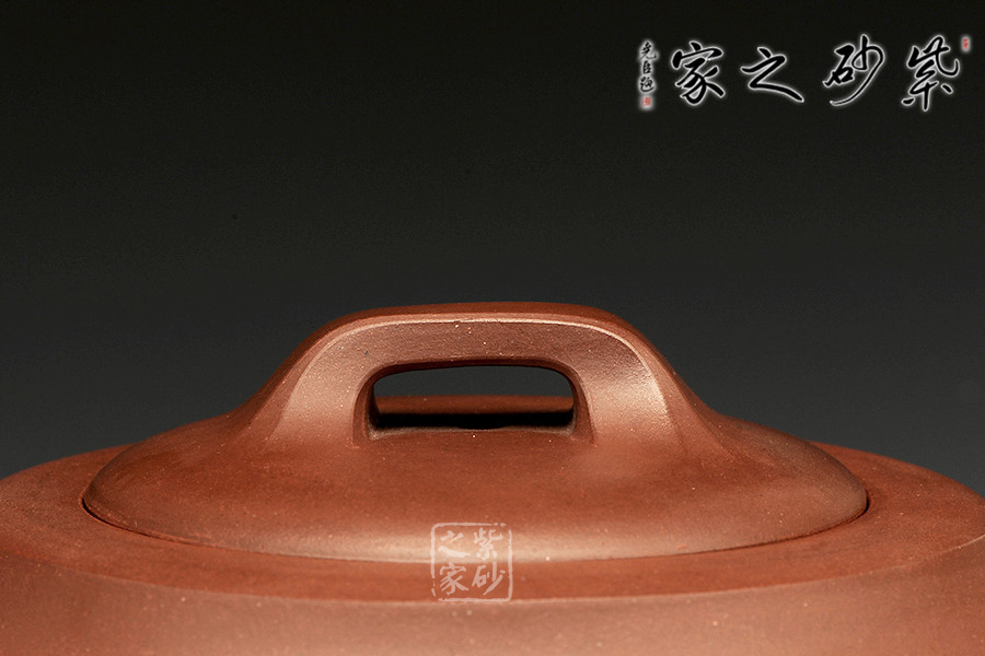 此壺壺身成扁鼓式,圓棱肩,腹部雙折成帶形,壺腹下緣作對(duì)應(yīng)處理,把圓蓄勁,流作二彎,根部略大,以“暗接”手法過(guò)渡,將壺肩線(xiàn)與壺嘴、壺把的側(cè)線(xiàn)接連一氣,自然舒暢、整體感強(qiáng),橋鈕方中寓圓,嵌蓋圓穹與口唇合體,微細(xì)中見(jiàn)神韻。