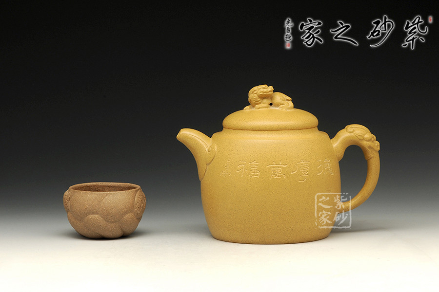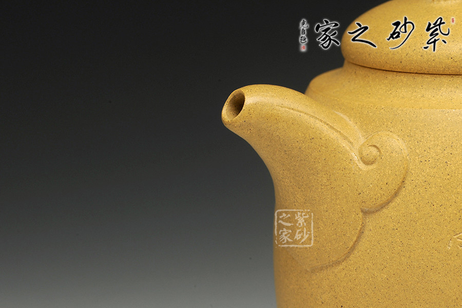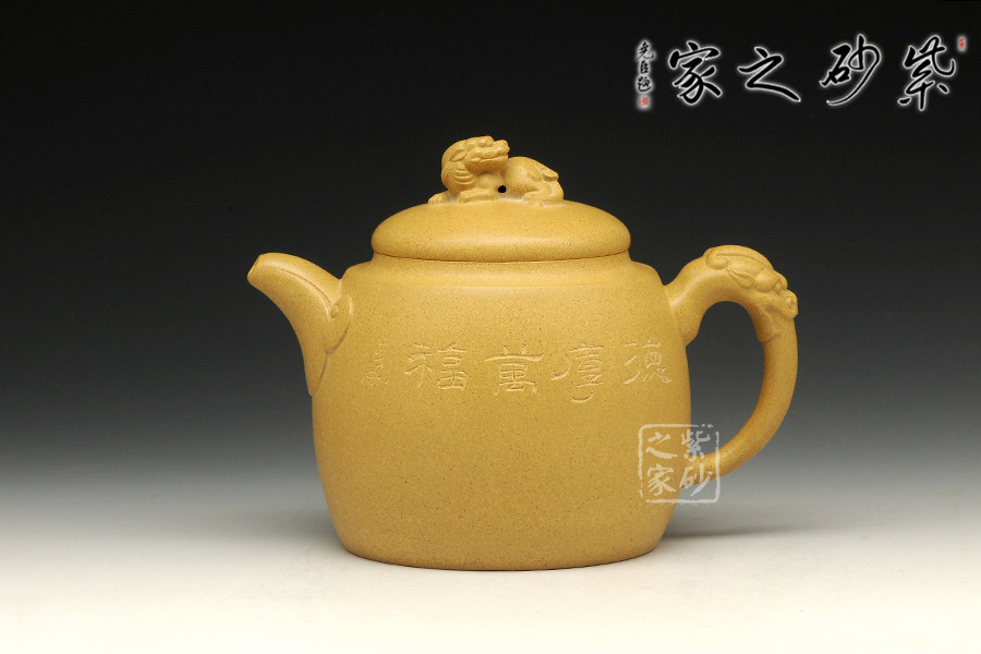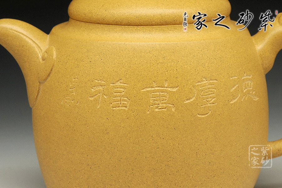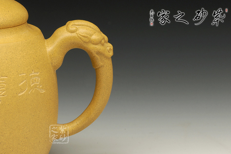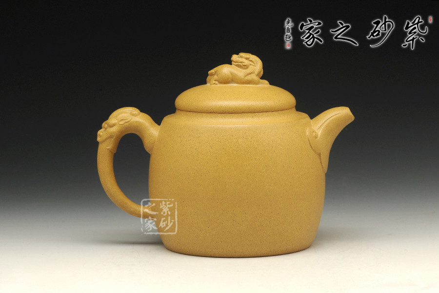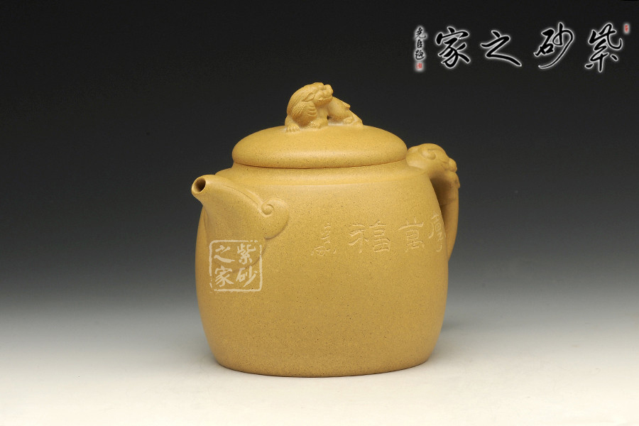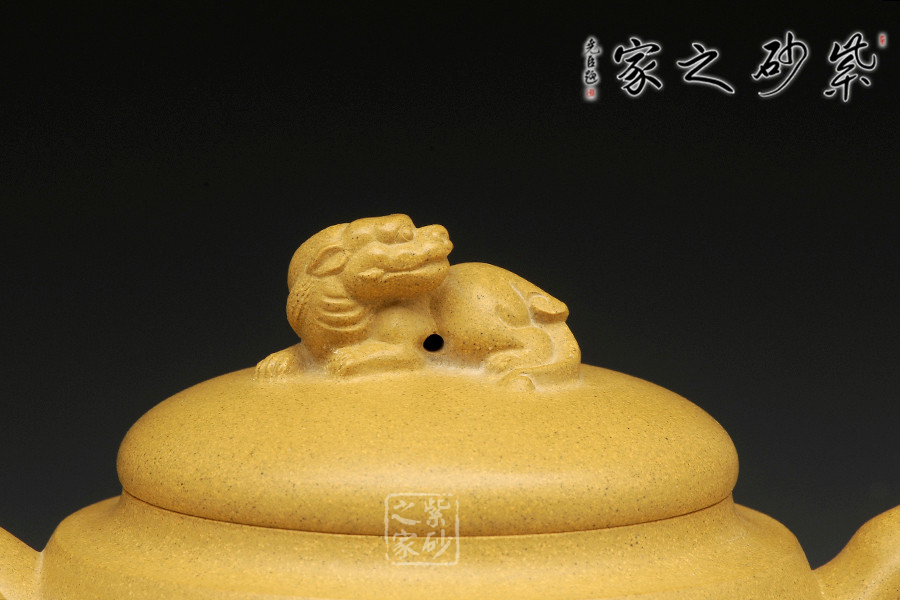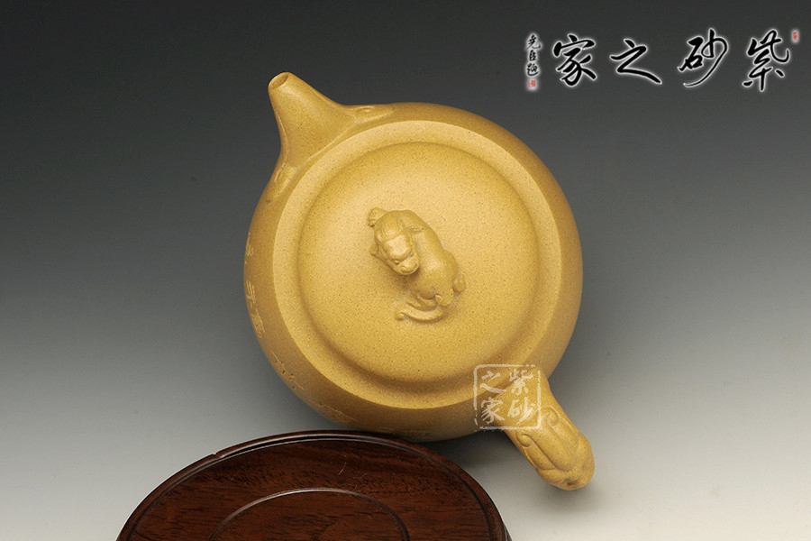 此壺壺身極為飽滿柔和,壺底平和,壺肩圓潤,簡約而不失古意;壺口開闊而平整,壓蓋設計同樣呈圓鼓之形,蓋面飽滿上凸,獸形壺鈕別致有趣,壺嘴彎流,壺基豐厚,銜福而至,耳形端把寬和大氣,持握舒適。