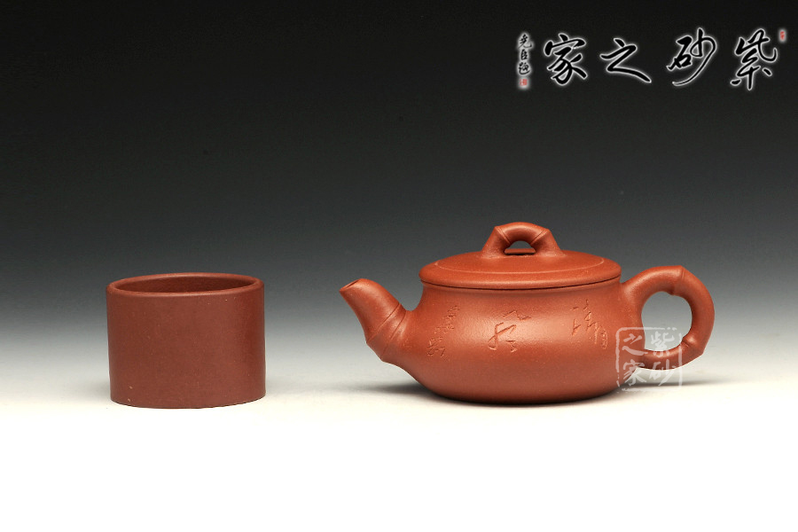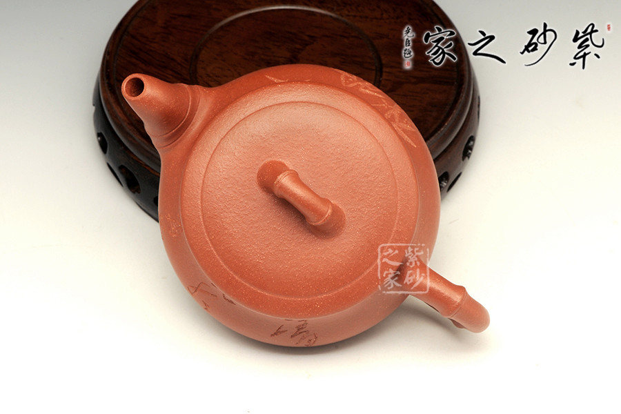 此壺以竹子為原型,整個器型渾然一體,嚴絲合縫,氣密性良好,壺鈕以竹節(jié)為形;竹節(jié)造型的壺嘴,顯得清韻古生;壺把竹節(jié)造型古樸。此壺整體造型穩(wěn)健,細觀之,但見如靜水行舟,四平八穩(wěn),清風竹影,足見作者處理用功之深。