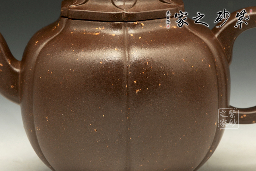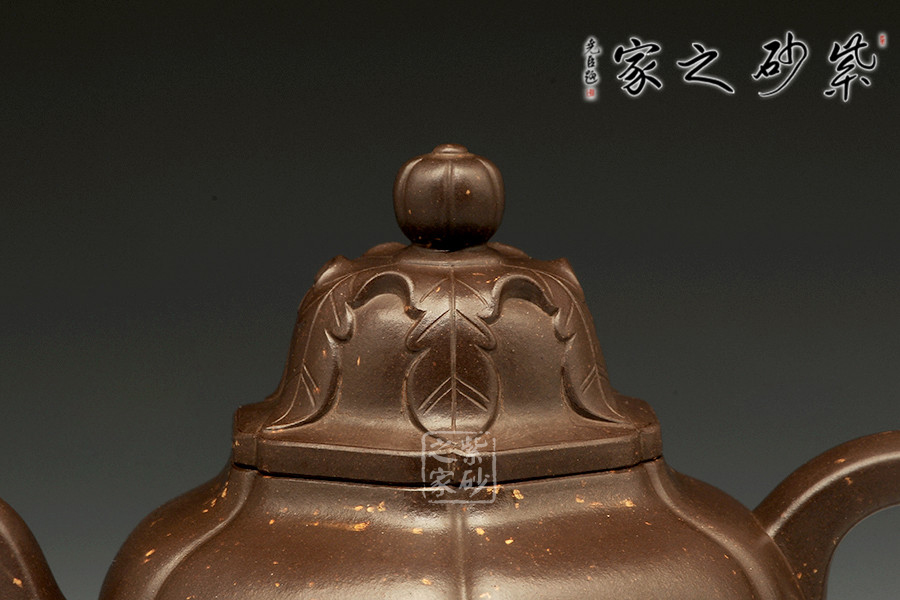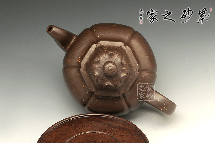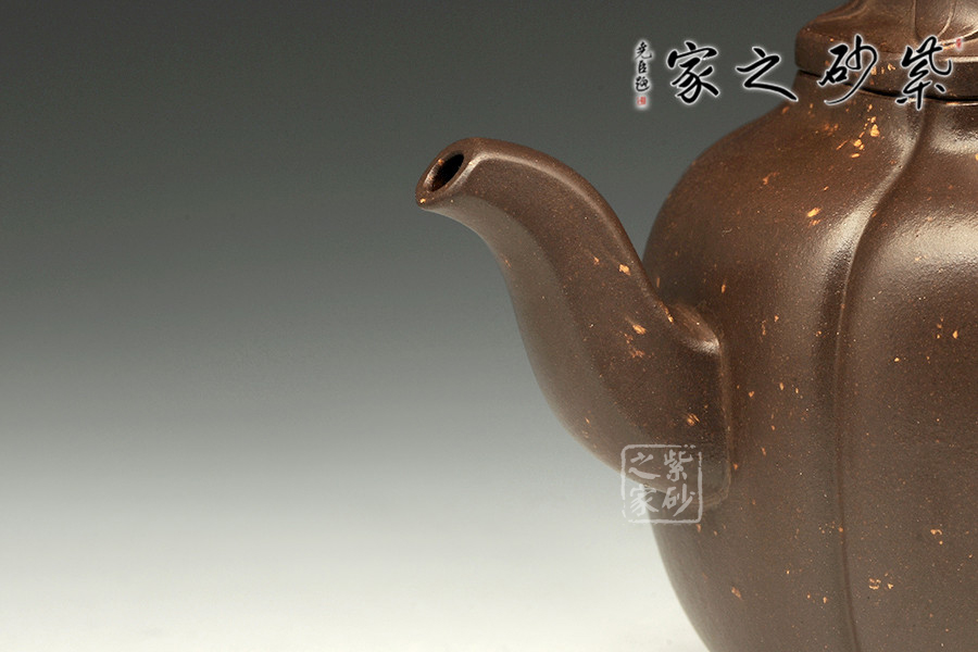 此壺形制碩大,器身分為六瓣筋紋,瓣面大小如一,凹凸有序,腴而不腫。表面張力十足,自上而下一氣貫通,明暢自然,充滿秀雅的韻律感;壺肩到壺身的轉(zhuǎn)角呈渾方狀,鈍而不圓,呈現(xiàn)出勻稱豐腴的寶相;三彎壺嘴,四方長(zhǎng)圓把,有方圓結(jié)合的妙用。