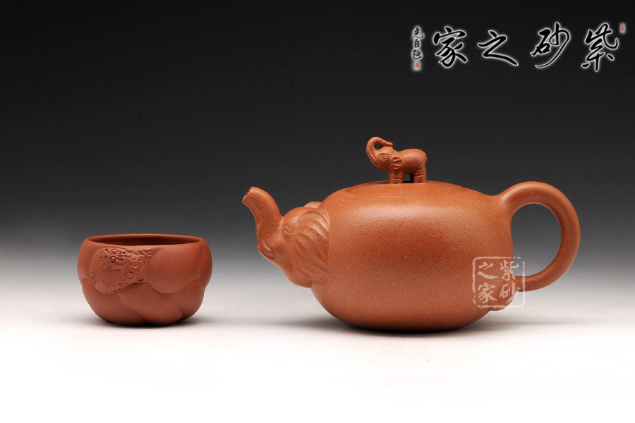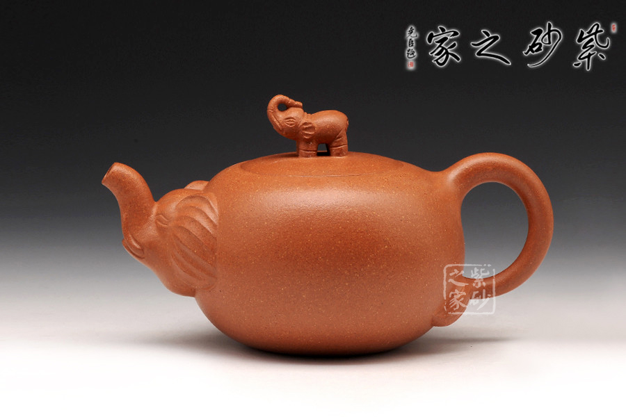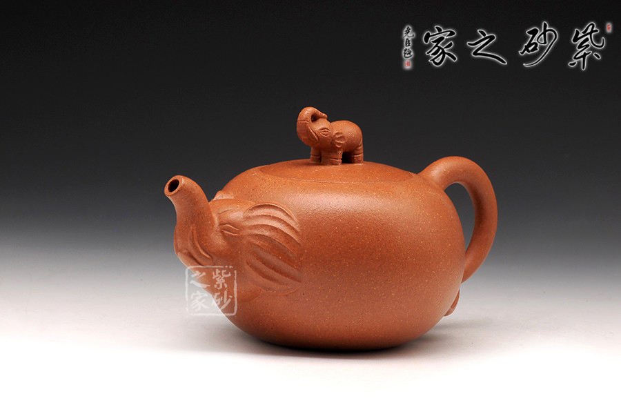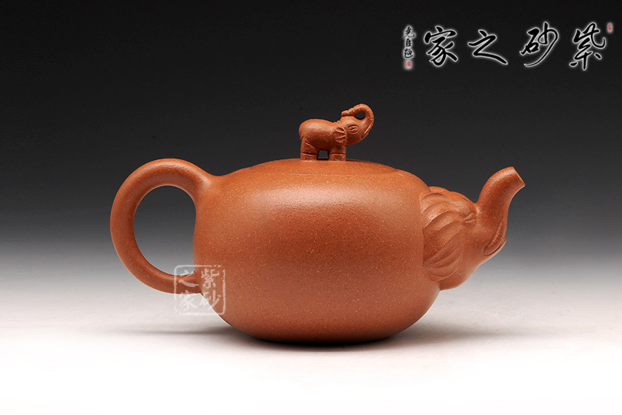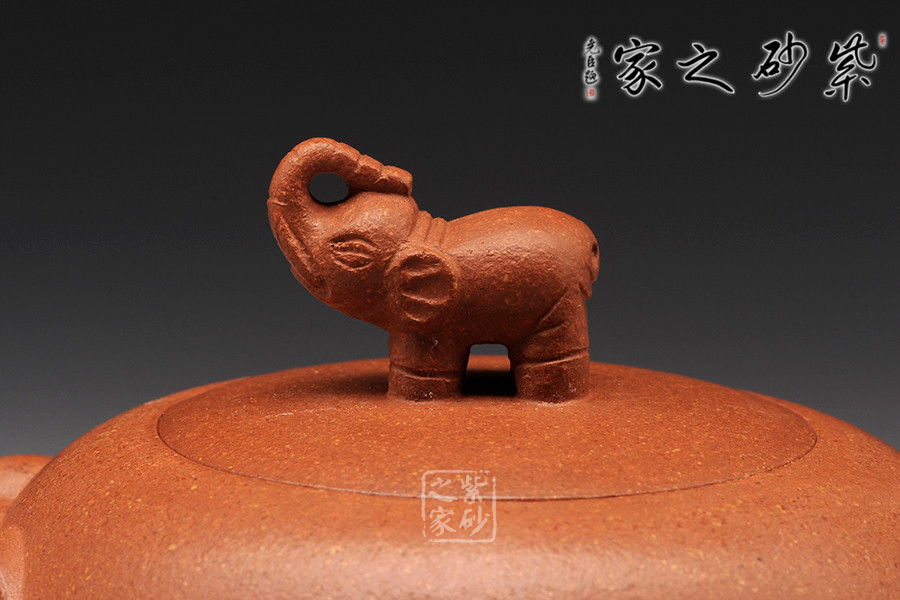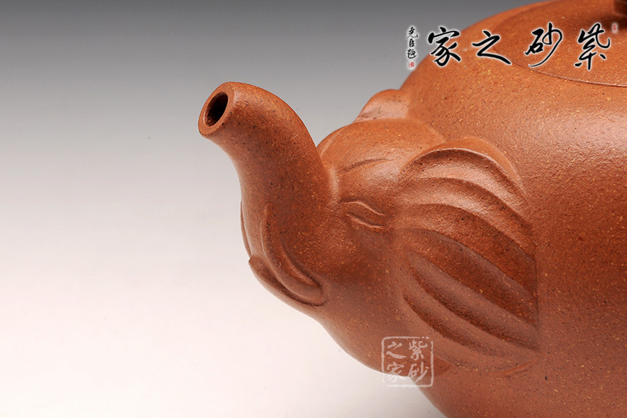 壺型以圓為基礎(chǔ),做得圓滑精妙。壺身為圓球,光澤細(xì)膩柔和,讓人心生喜歡。壺嘴彎流,悠長而特別,正是象鼻的造型。壺把粗細(xì)均勻,變化平緩,不用修飾即恰到好處。壓蓋設(shè)計更凸顯壺鈕,以象入壺,而此象造型小巧卻不失生動,長鼻卷曲更顯活潑。