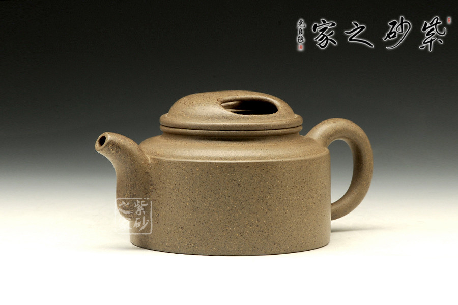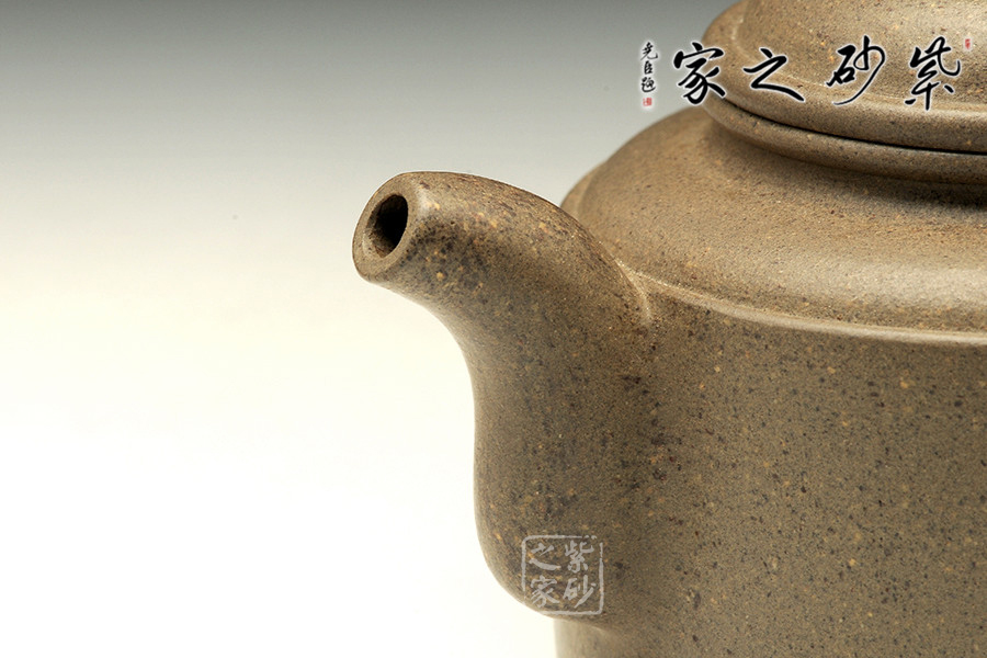 壺身呈圓柱筒狀,其將生硬的加工的線條感覺演變?yōu)榍€;短頸,寬口,肩部收斂成口,外包口沿;短嘴,二彎流,出水流暢;壺柄耳大圓潤;壺蓋做的很精致,壓蓋,與壺口緊密結(jié)合,口蓋整體平整光滑,外形流暢;壺鈕制作別出心裁,采用了牛鼻孔式的鏤空結(jié)構(gòu),生動(dòng)與趣味完美結(jié)合。