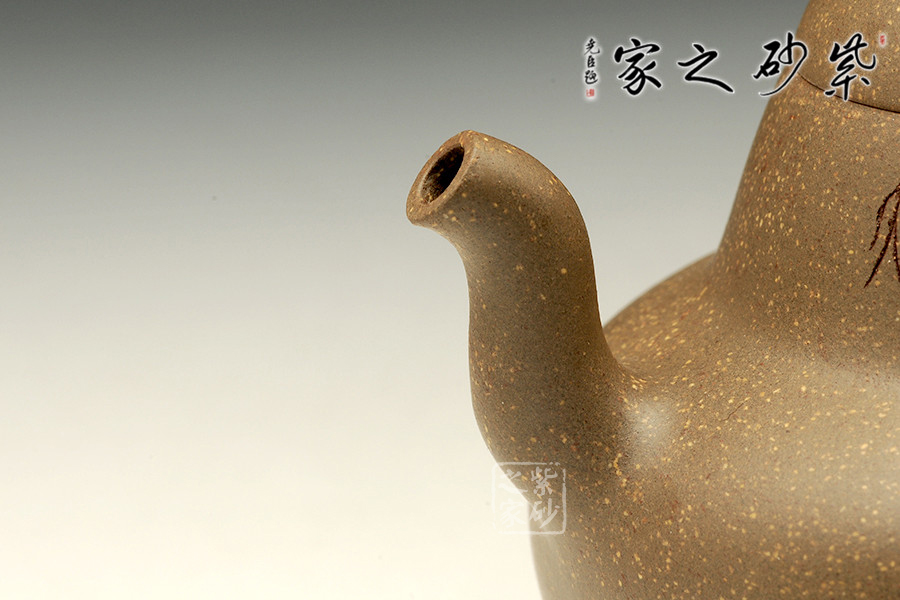 壺身上沿與蓋沿過(guò)渡自然,儼然一體。整體圓潤(rùn)飽滿,自然收縮,壺身圓潤(rùn)有型,壺嘴長(zhǎng)流蜿蜒,出水暢快。