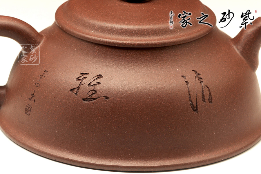 作品以簡潔的線條構(gòu)成淳樸凝重的形體,深厚且具神韻,設(shè)計(jì)上空間虛實(shí)和諧,提諧舒適,有端莊古樸之意境,作者對(duì)壺的形體可謂吃透了要點(diǎn),方圓之間恰到好處,所以此壺逗人喜愛。壓蓋處嚴(yán)絲合縫,毫無虞漏,豐腴圓潤,轉(zhuǎn)動(dòng)溫和。