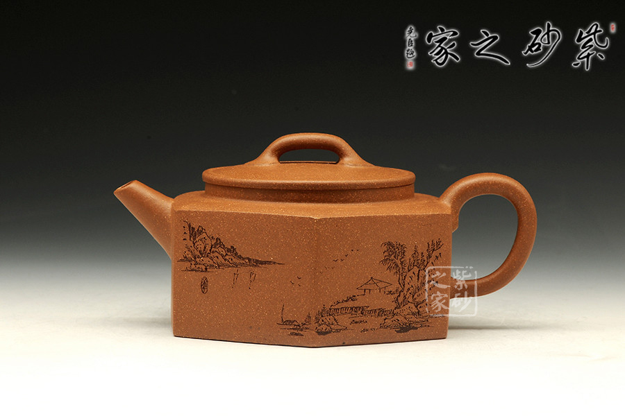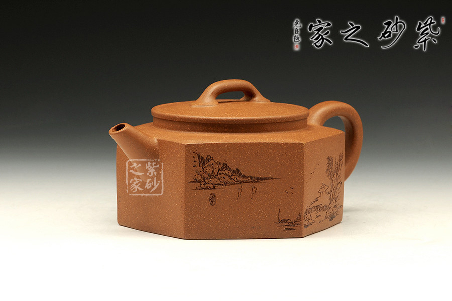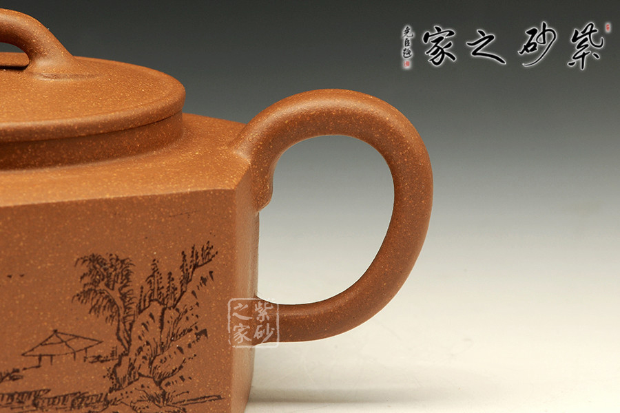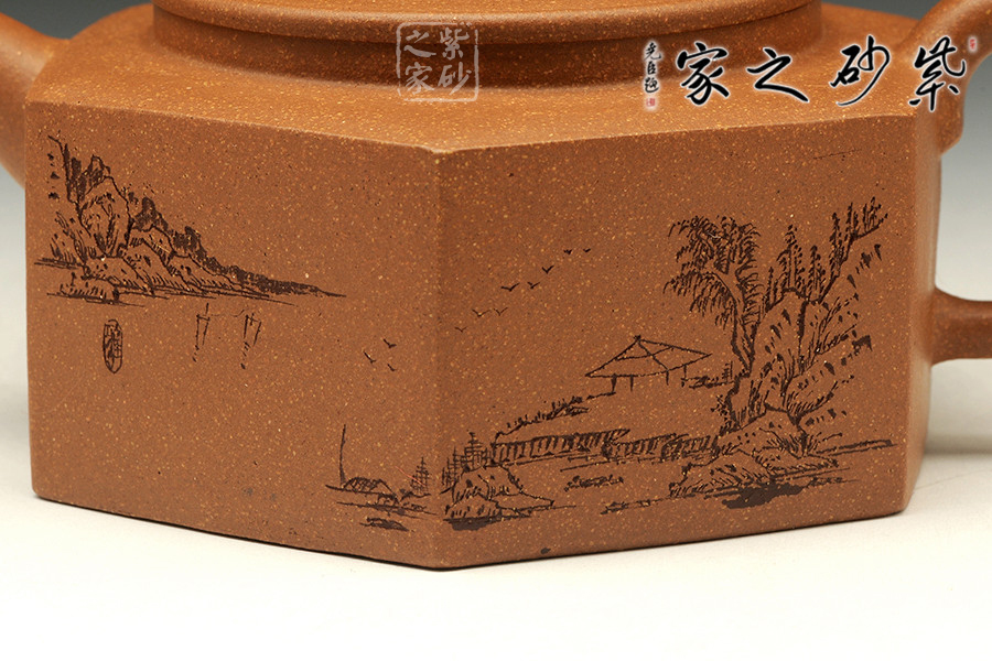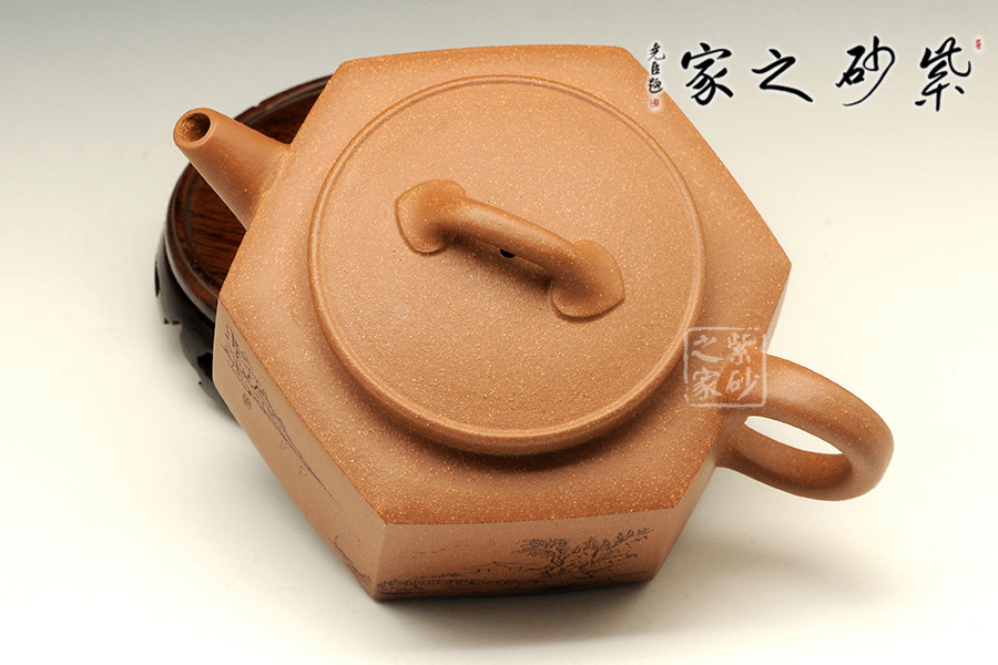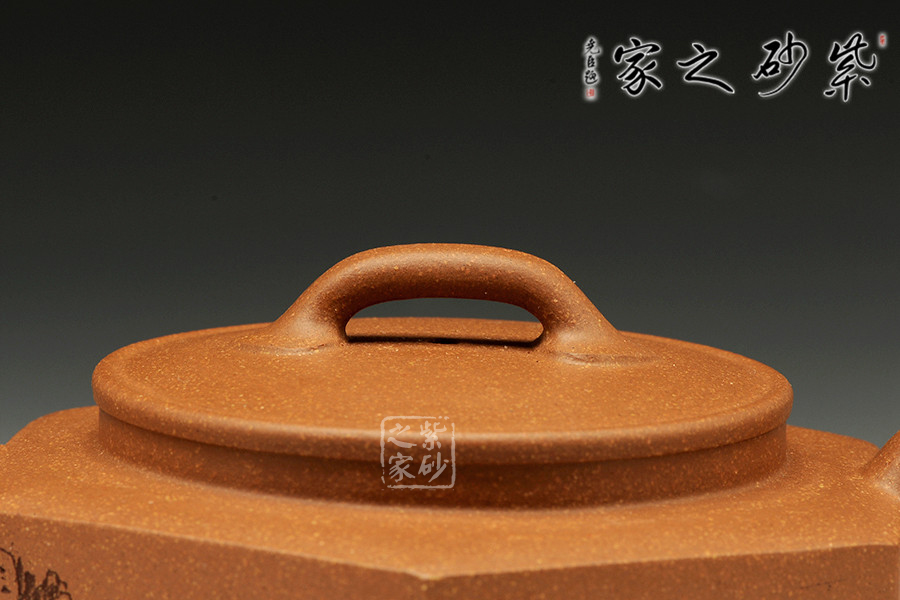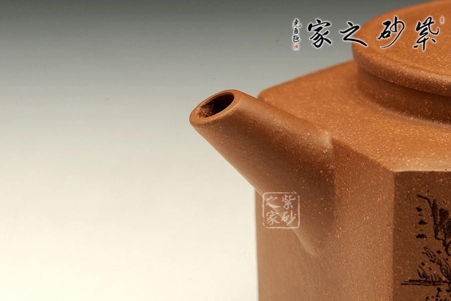 六方外觀的層次分明,六面工整,過渡間線條筆挺。壺身突出而足部收斂,肩部以上更是逐級壓縮。壺蓋上圈紋裝飾,漸變到壺鈕,如意橋型美好吉利。壺把和壺嘴皆有鋒芒露出,壺嘴是粗細(xì)漸變,彎流巧妙。壺把則是方里留巧,意味深長。