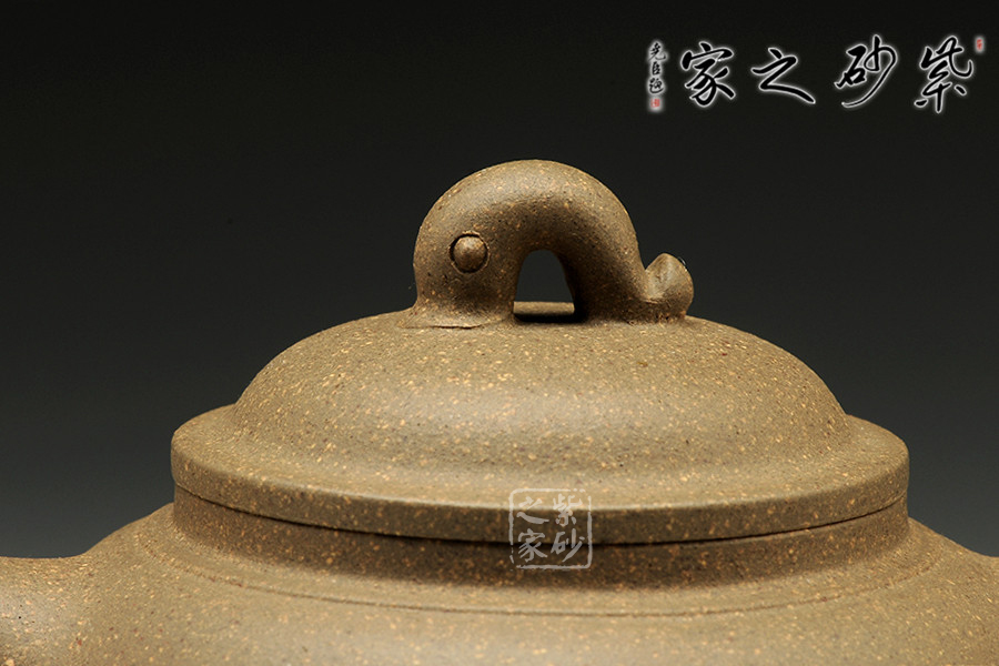 中青年優(yōu)秀陶藝家莊紅陽,精于手工制壺,注重作品的原創(chuàng)性,性價(jià)比高。該作品榮獲2013年第十五屆中國工藝美術(shù)大師精品博覽會(huì)金獎(jiǎng),段泥為料,肌理豐富,手感佳,因色澤相對(duì)較淺,適合沖泡綠茶類茶葉。造型融合了匏尊之形設(shè)計(jì)而來,壺身圓潤飽滿,雍容大度;嘴為魚嘴、把為魚尾,整器若一條靈動(dòng)的魚。壓蓋之上一條小魚彎曲成鈕,妙趣橫生,與壺身呼應(yīng)成趣。作品表達(dá)了魚躍龍門之意,有著極美好的祝愿。