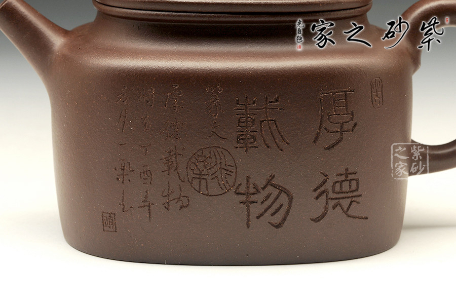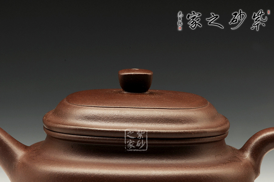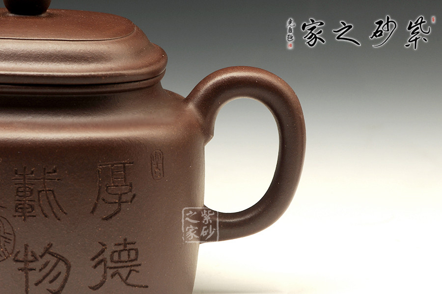 中青年優(yōu)秀陶藝家莊紅陽,精于手工制壺,注重作品的原創(chuàng)性,性價比高。家藏紫泥手工制作,色澤沉穩(wěn)雅致,能鎮(zhèn)靜心靈作用。經(jīng)典壺式德鐘加入方的元素,微小的方線條在整器上若隱若現(xiàn),形成圓中有方的視覺效果。此器泥色純一,莊重儒雅,沉穩(wěn)周正,圓潤涵光。壺胎身圓、氣勢穩(wěn)、布局均,不染匠氣而自成格局,識者自珍。方形平鈕與器身形似,直流、耳把有清正、直諫君子的風度,壺肩線條圓轉(zhuǎn),過渡自然,呈疏朗大器之韻。此壺涵光華于樸厚、寄風雅于平常,乃謙謙君子之化身。