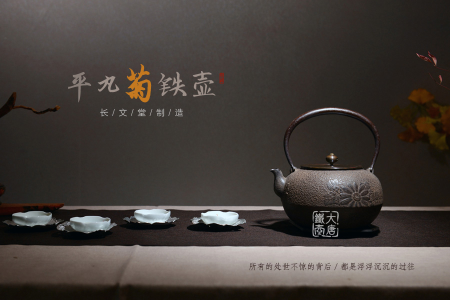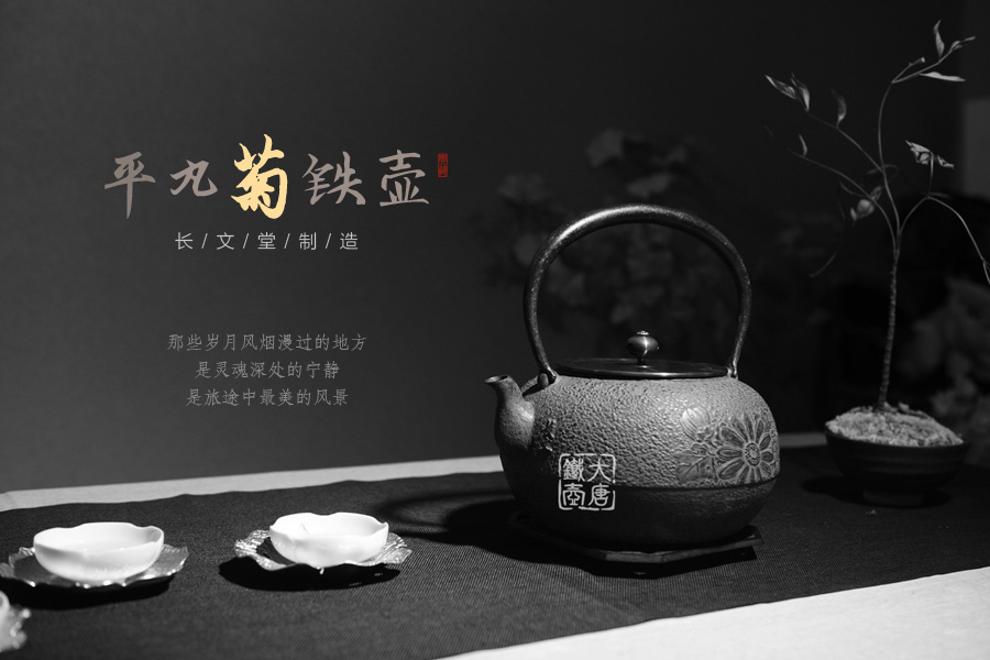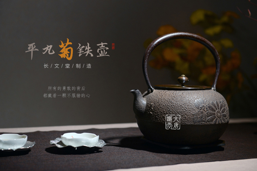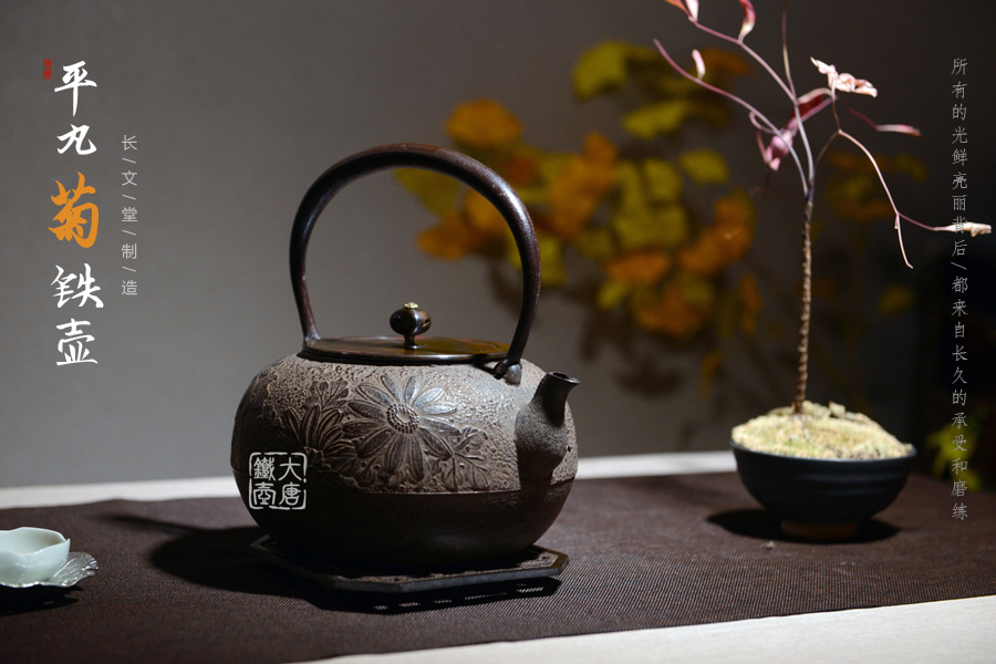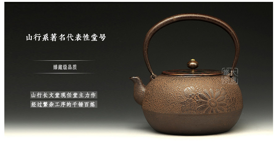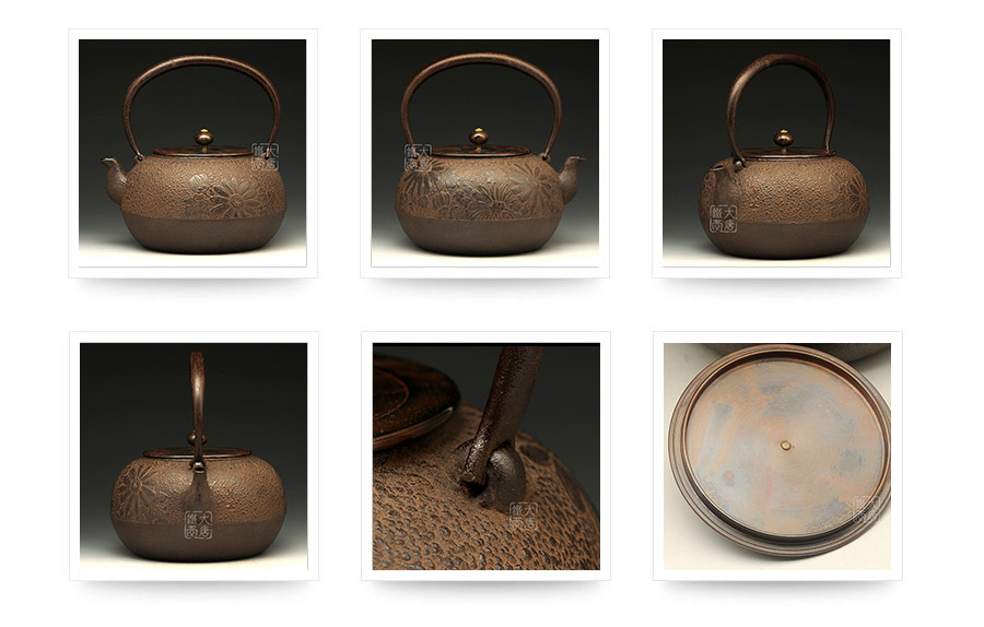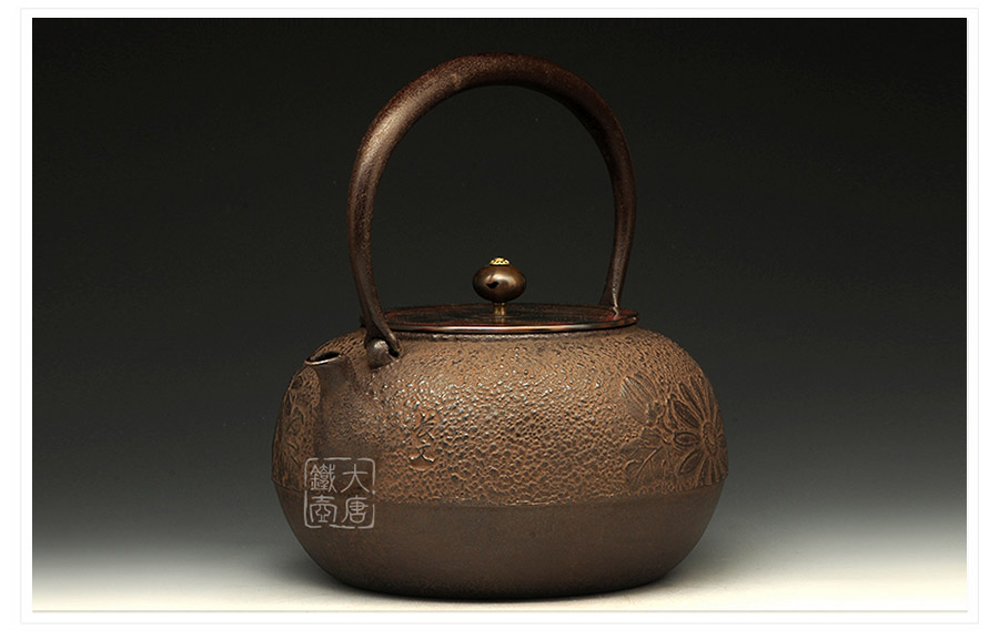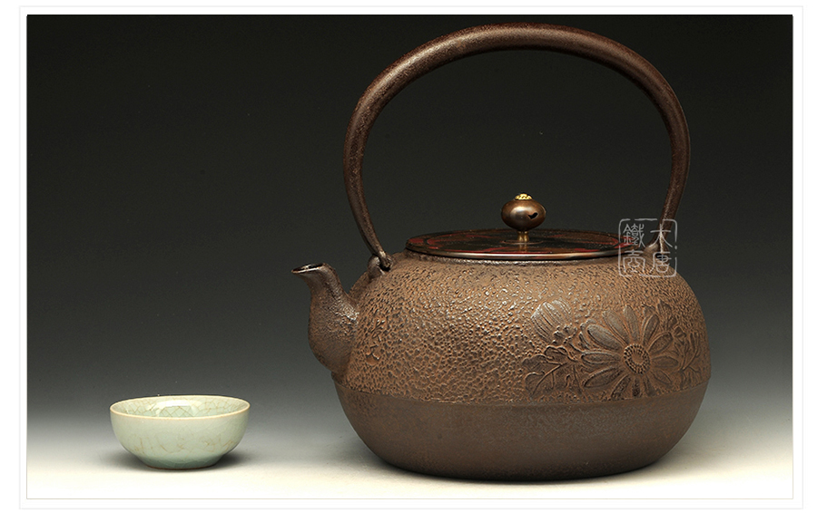山形長文堂現(xiàn)任堂主,長谷川光昭作品,燒型制法,一模一具,壺身造型沉穩(wěn)古樸,鐵肌厚重溫潤,經(jīng)典菊紋細(xì)膩雅致,給人以淳樸雅致的藝術(shù)美感。