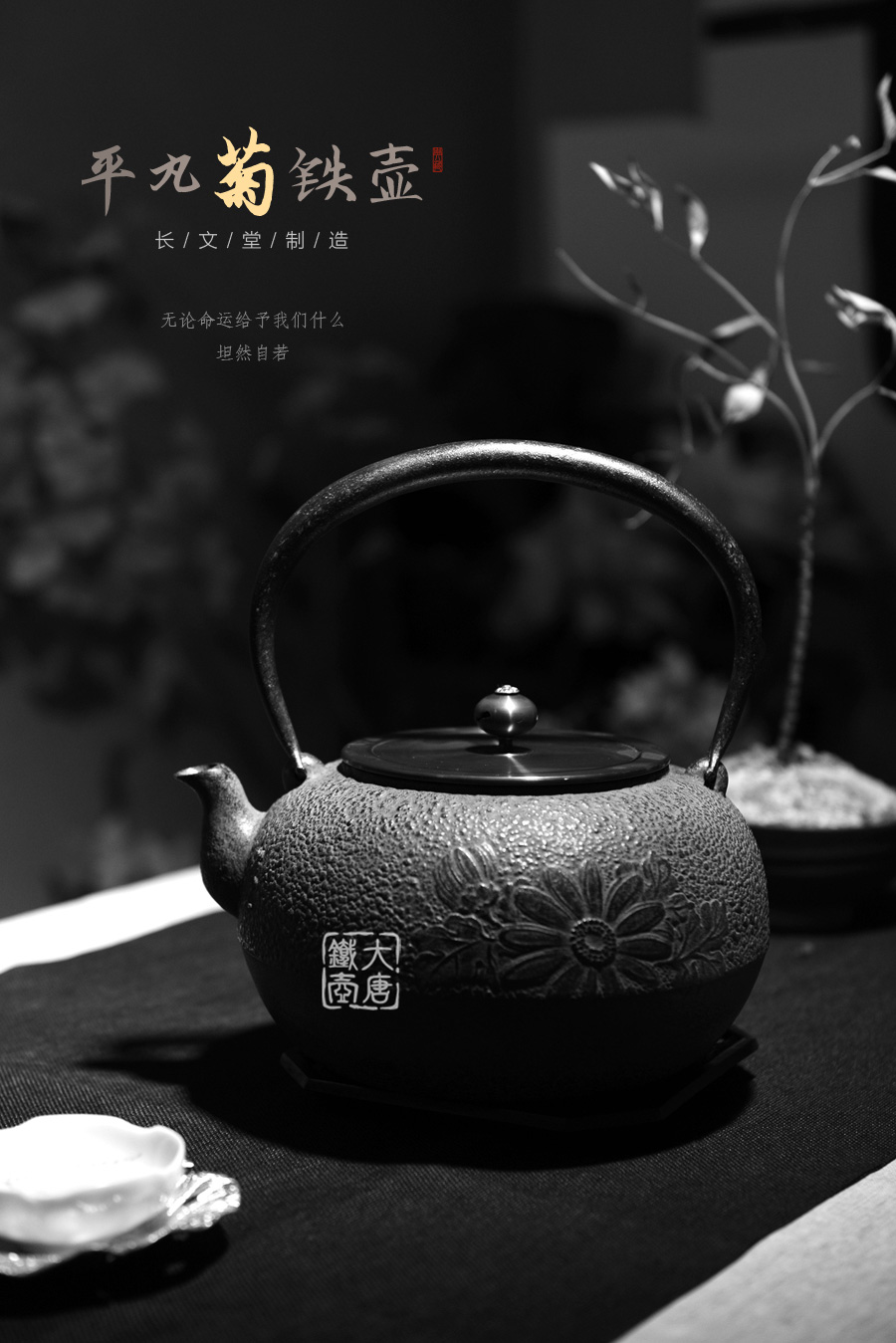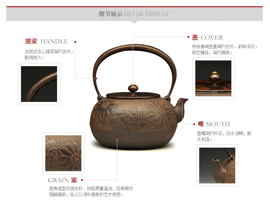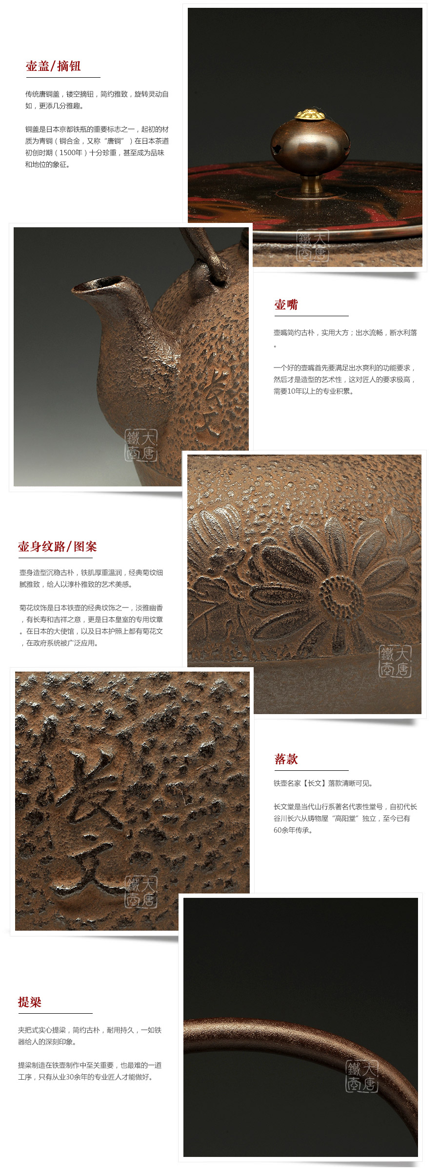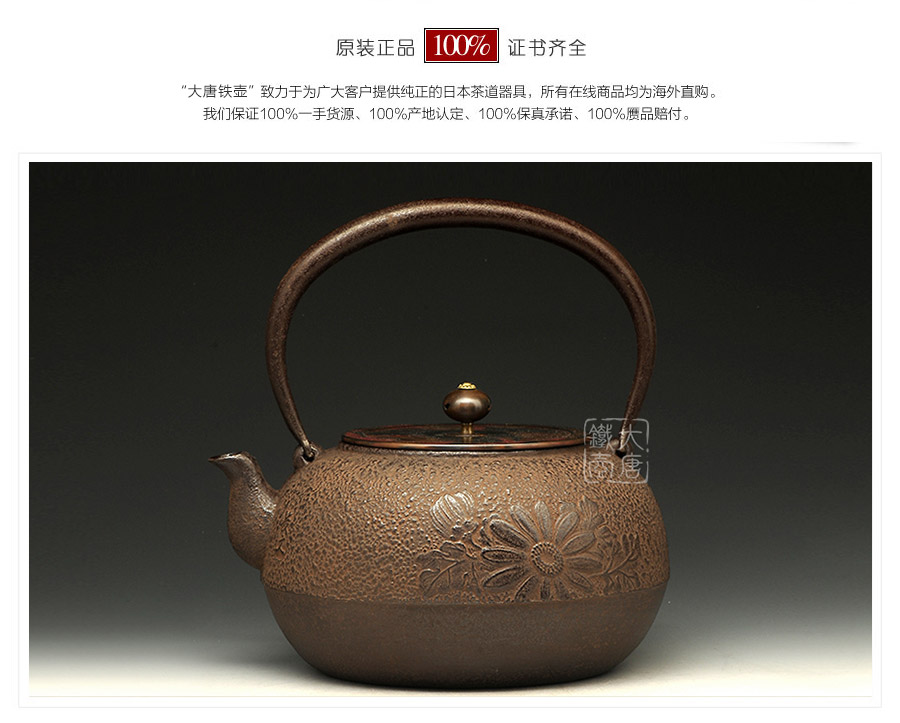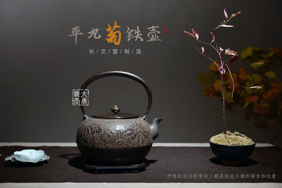 山形長文堂現(xiàn)任堂主,長谷川光昭作品,燒型制法,一模一具,壺身造型沉穩(wěn)古樸,鐵肌厚重溫潤,經(jīng)典菊紋細(xì)膩雅致,給人以淳樸雅致的藝術(shù)美感。