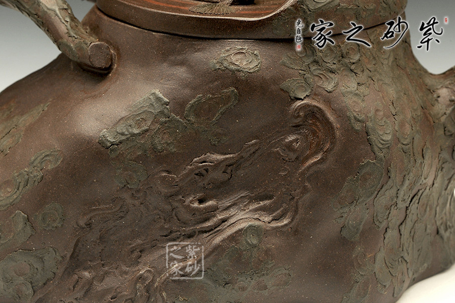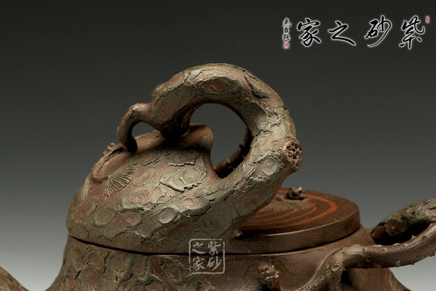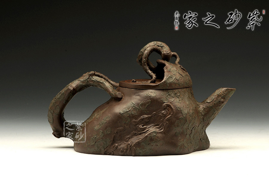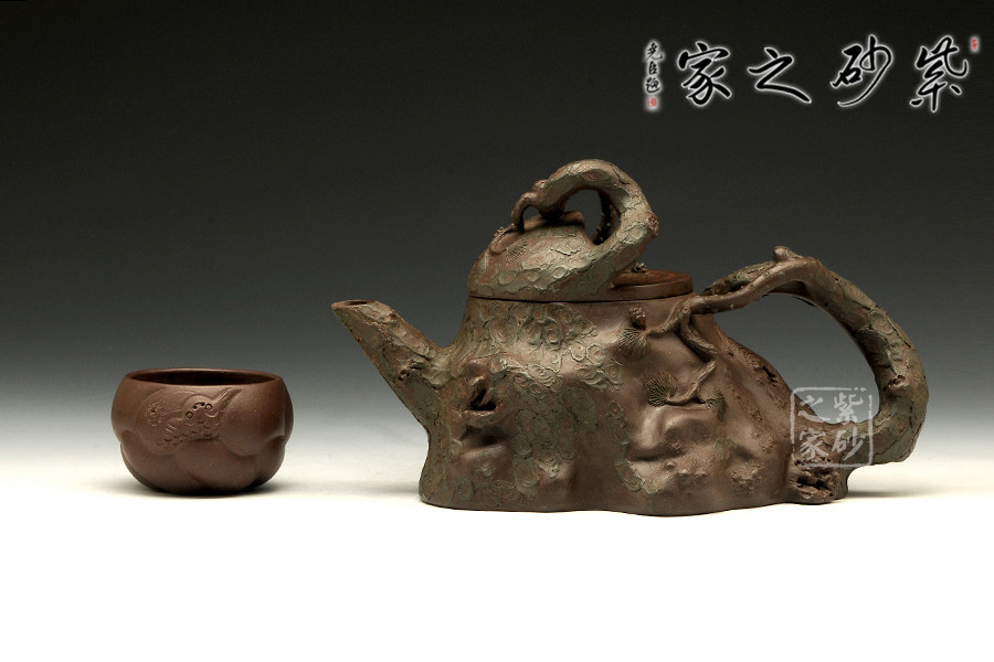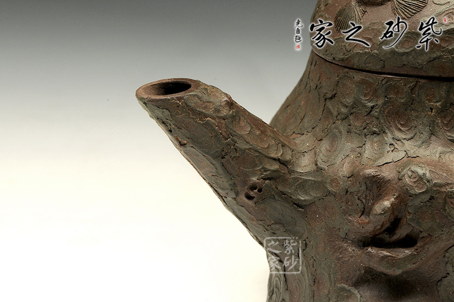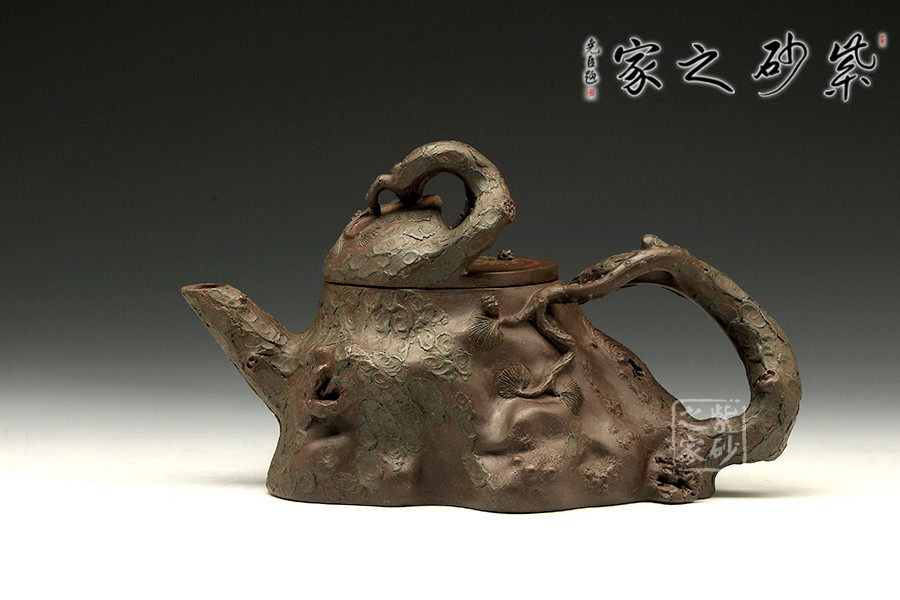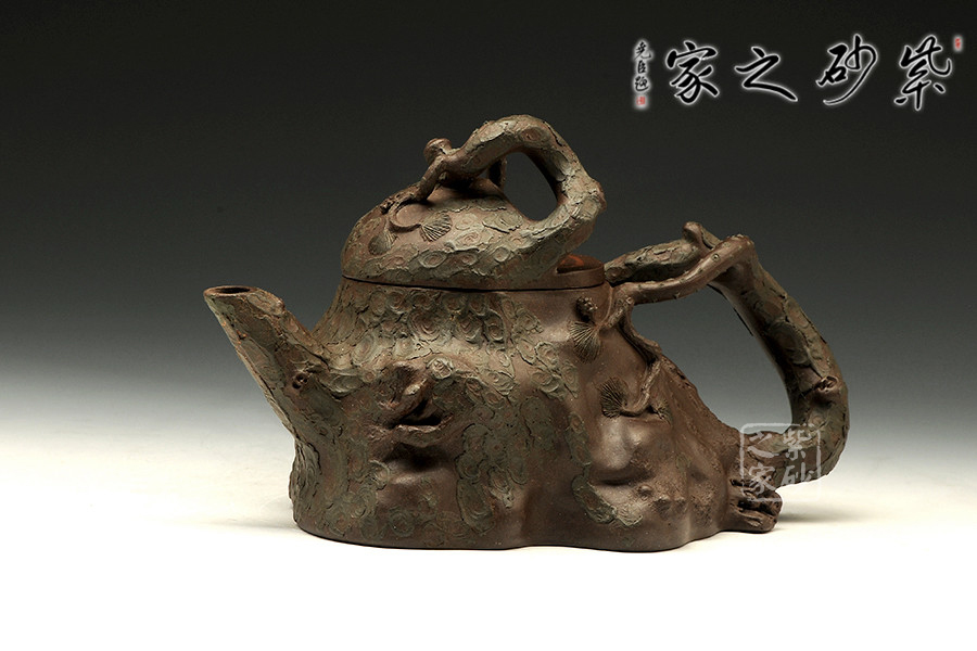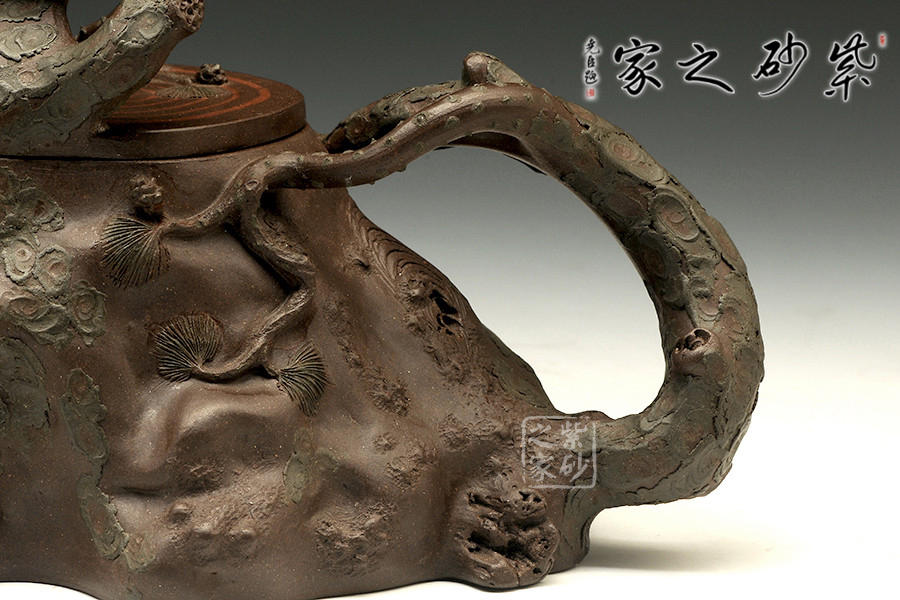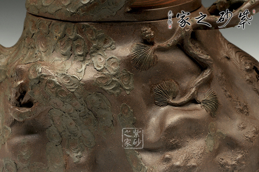以一段老松樹樁為造型,盡顯此壺的氣勢與張力。壺嘴、壺把均以樹枝造型來表達,宛如從樹樁壺身自然生成,剛勁有力。壺鈕則用異形樹根為造型,豐富整個壺蓋的裝飾,也與壺身相呼應,且壺蓋設計十分奇特,三分之一的樹皮撐起,猶如老樹皮即將脫落之感。此壺設計巧妙、制作精良,且功法謹慎嚴密、一絲不茍。