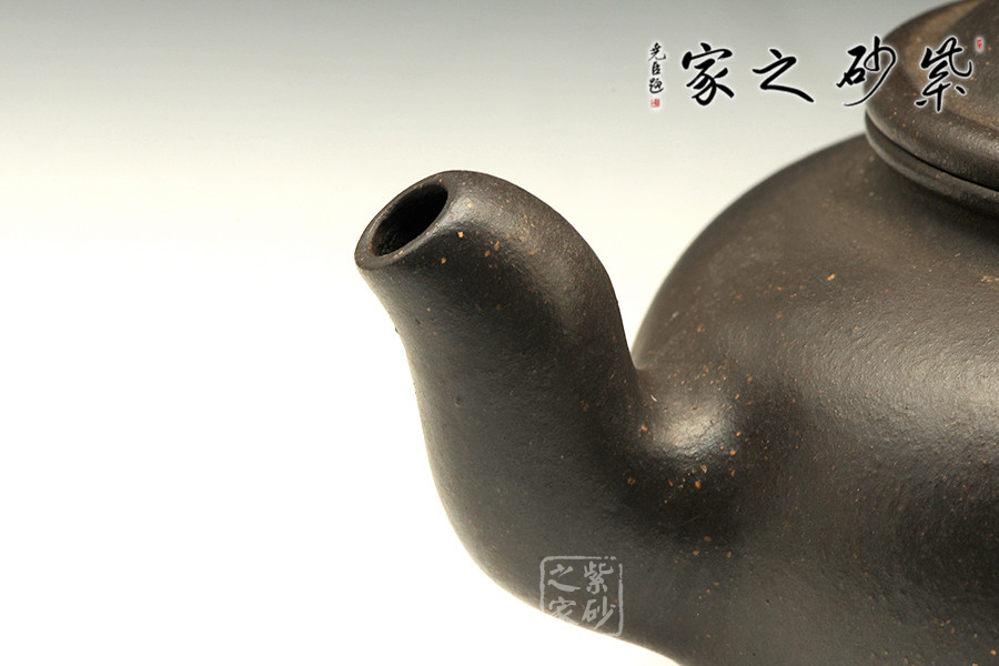 該壺色澤沉穩(wěn),做工精美。壺鈕精致而小巧,壺身飽滿,線條流暢。壺嘴蜿蜒而出,拙樸而不失秀氣,出水流暢利落。壺把看似普通,實則設(shè)計感十足,宛如一片騰云,為整壺增添動感元素,穩(wěn)重而不失靈動。