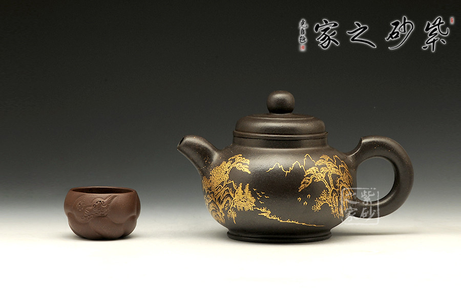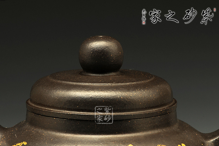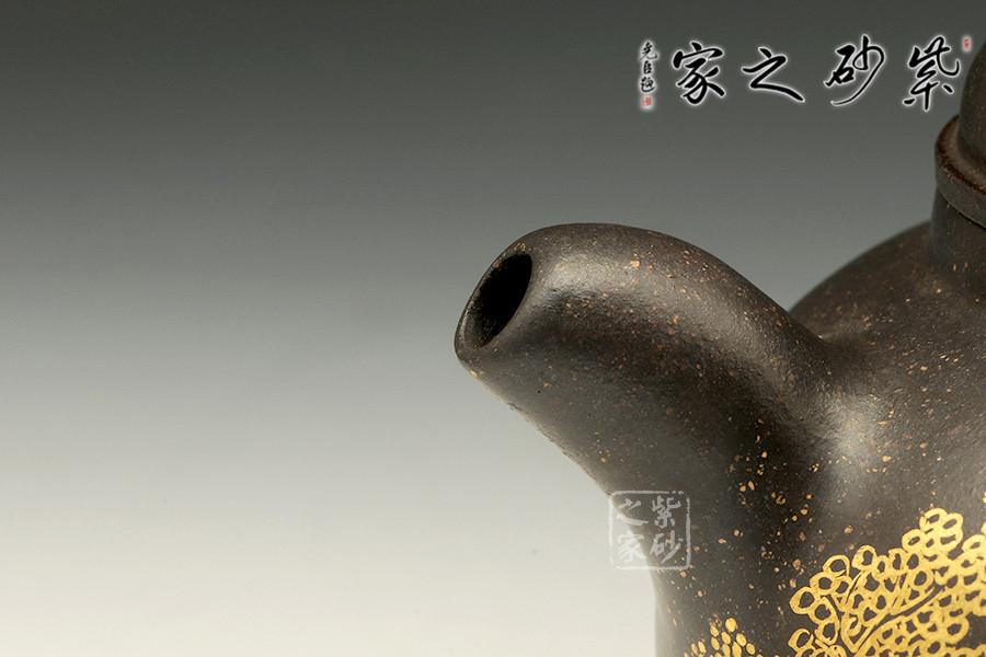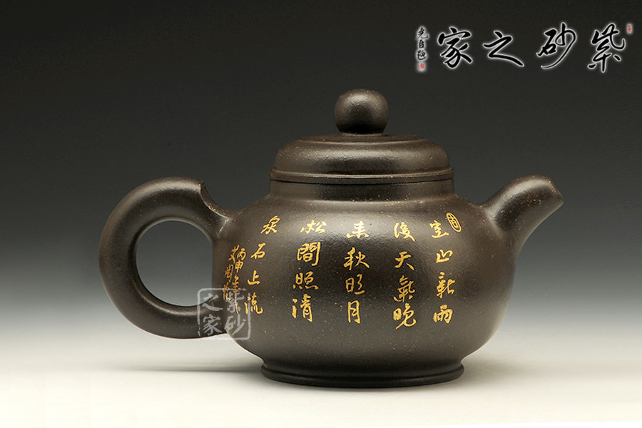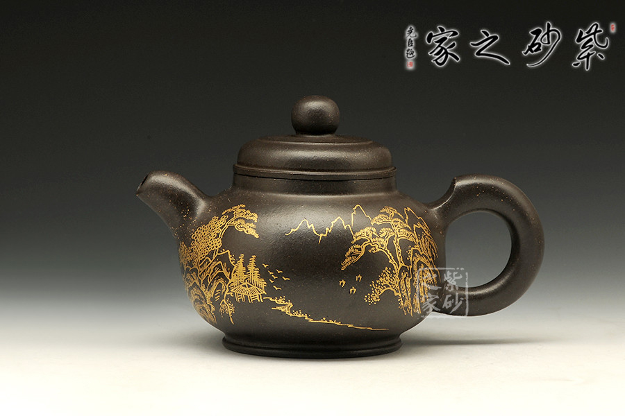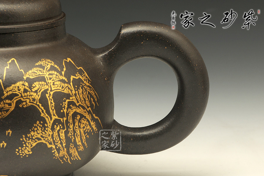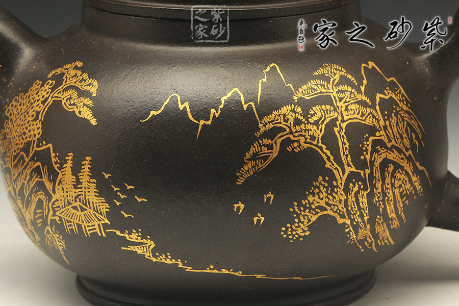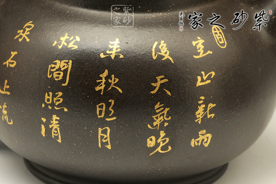 該壺容量為470cc,壺體圓潤、光滑,壺蓋厚實,身與蓋自然銜接,過度順暢,渾然一體,默契地構(gòu)筑了柔美光滑的曲線。壺鈕宛若一個圓珠,精致小巧。壺嘴微微從蓋沿附近延伸出,翹首而置神氣、灑脫,出水流暢。壺身正面為群松環(huán)抱竹亭,飛鳥掠過江邊,別有一番風(fēng)味。壺身背面為唐朝詩人王維的《山居秋暝》,描金工藝為整壺增添了鎏金質(zhì)感,值得推薦。