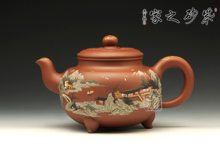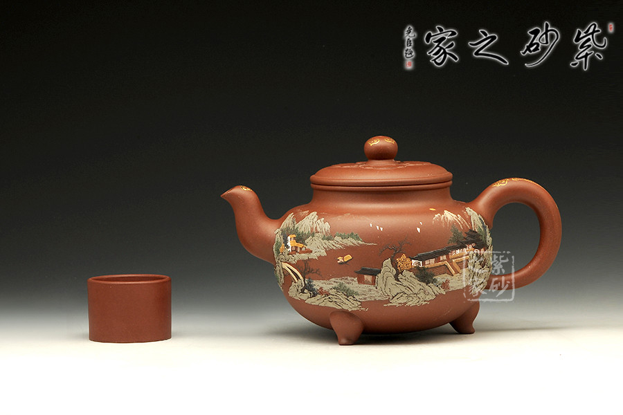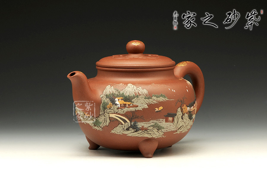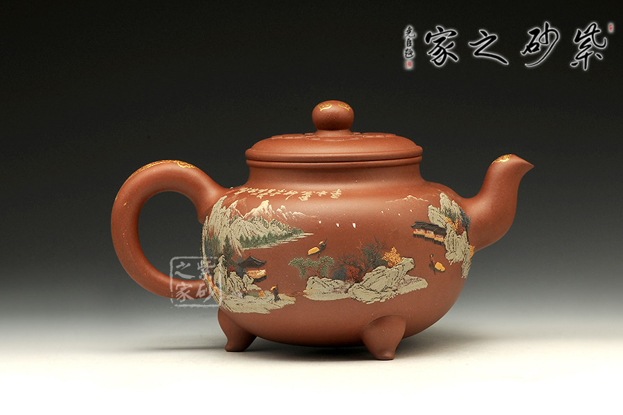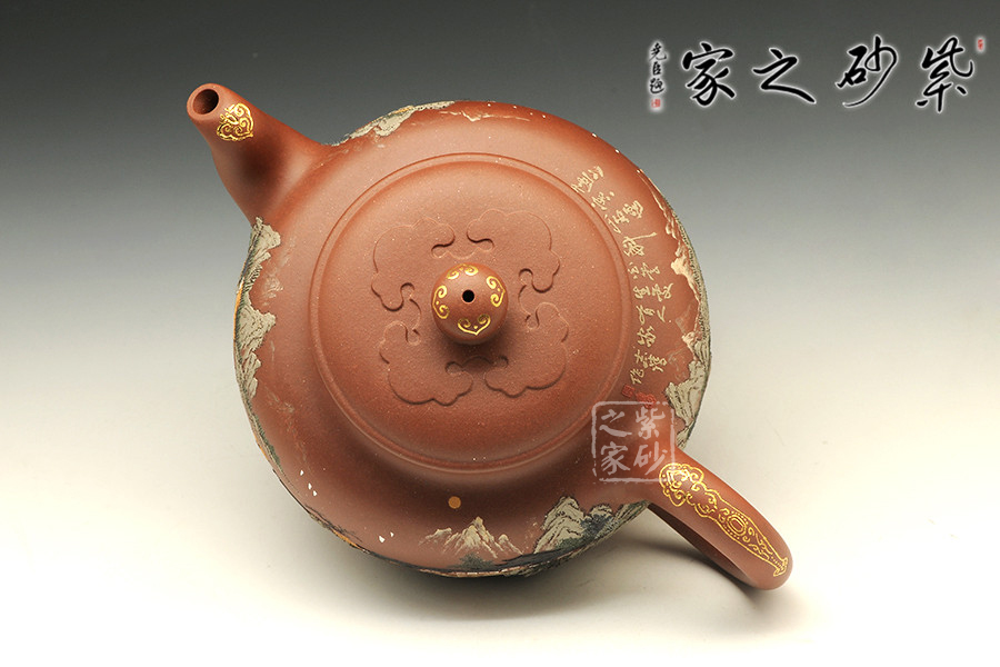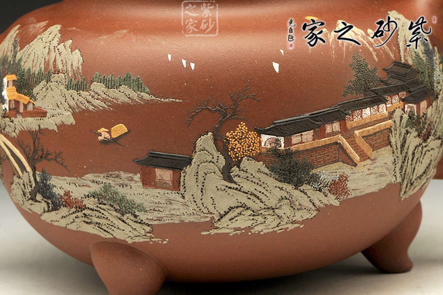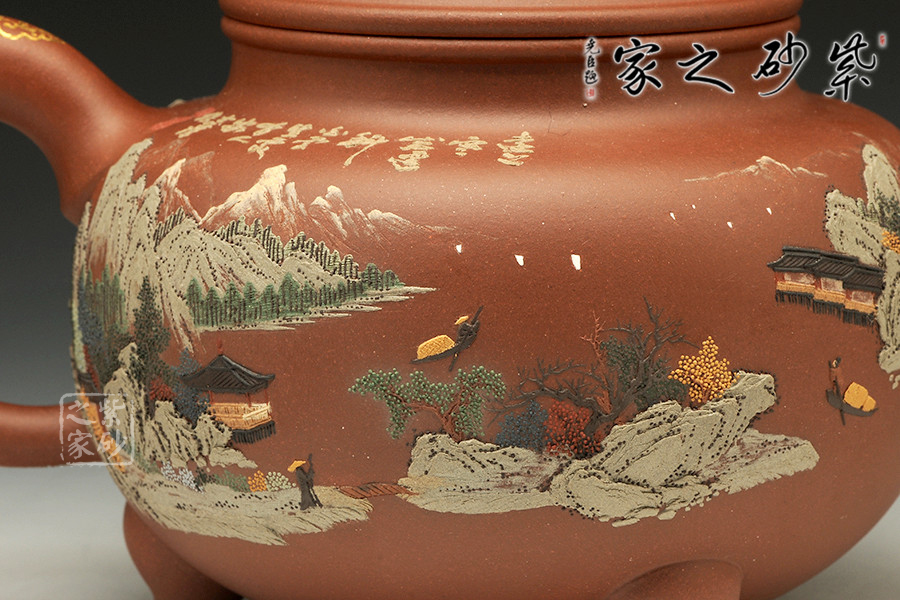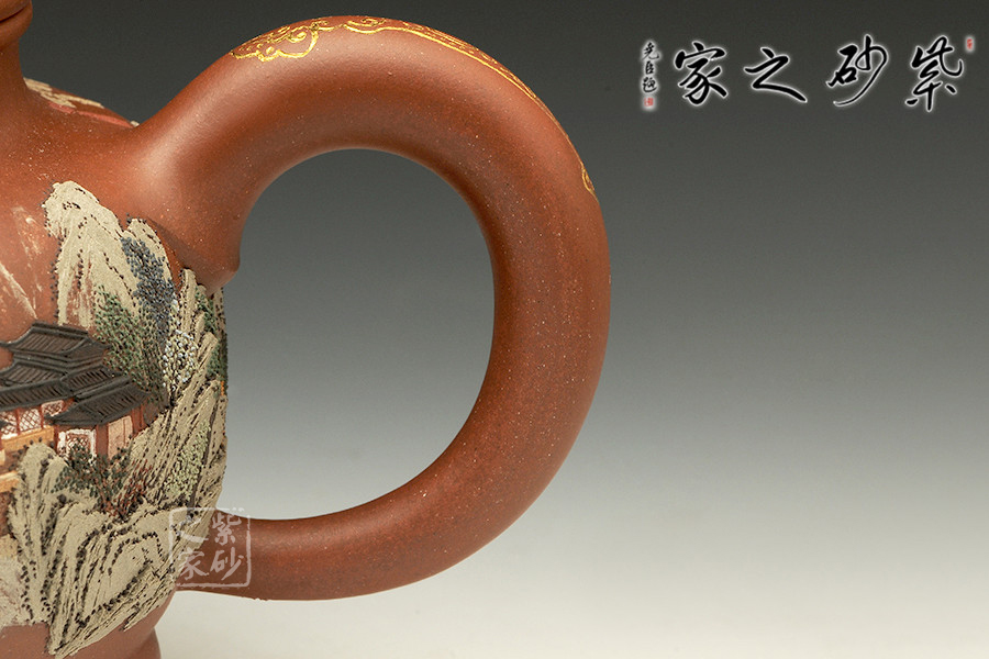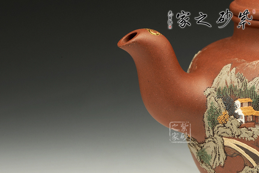 壺體圓潤,線條柔和,器型豐滿。壺嘴和壺把暗接無痕,做工精細。通體泥繪裝飾,每個角度都能欣賞到如畫美景,色彩搭配巧妙,描金點綴,精致非凡!足見老師功力!
