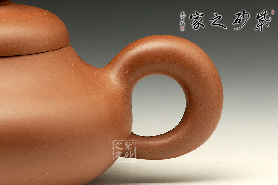 此件扁圓壺選用優(yōu)質(zhì)泥料原礦清水泥制作,從流把延續(xù)至壺蓋、壺身至壺底,僅用曲線過(guò)渡,沒(méi)有一個(gè)棱角和一根多余的線條,像一位氣定神閑的老人端坐,自然而飽滿,簡(jiǎn)單卻不單調(diào)。嘴、把、鈕飽滿有張力,又顯雍容氣質(zhì),表現(xiàn)出圓器的素雅美感。