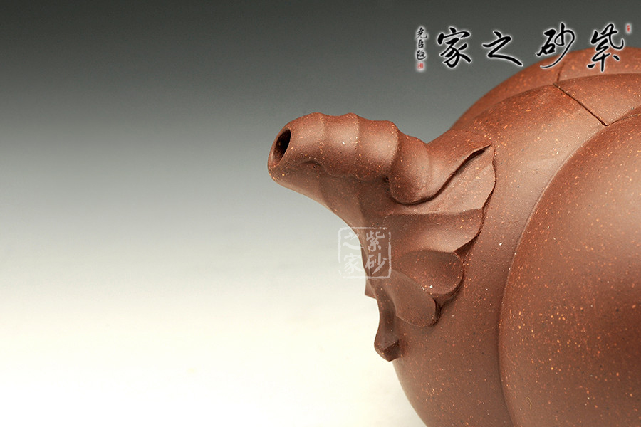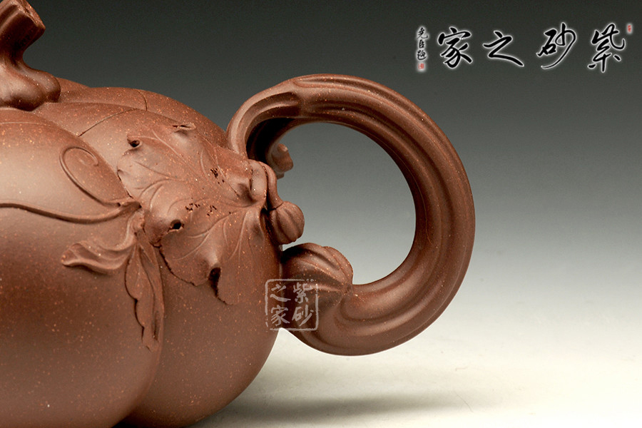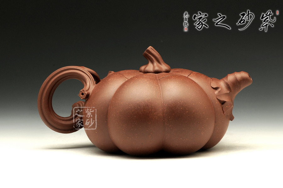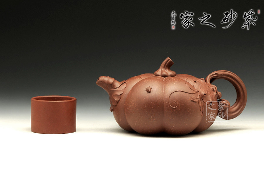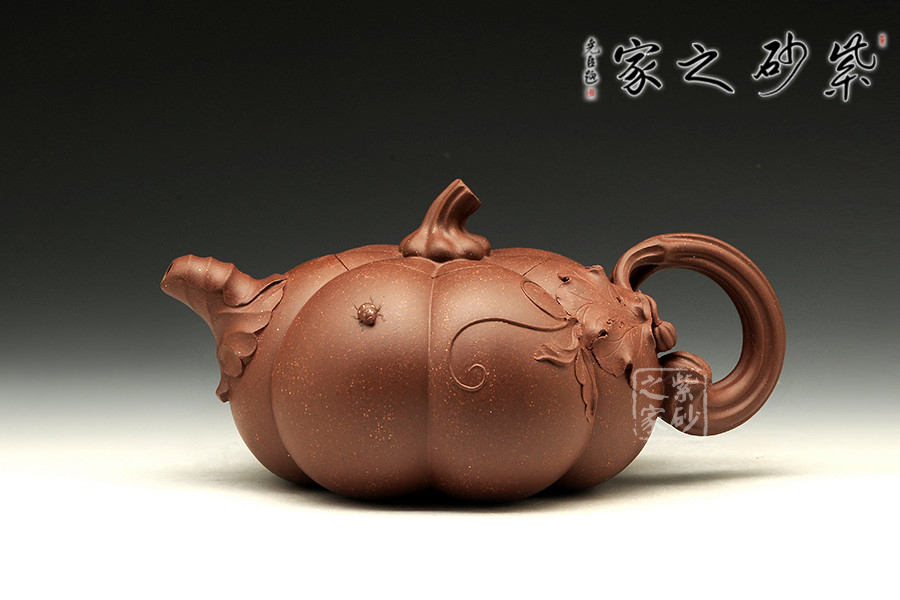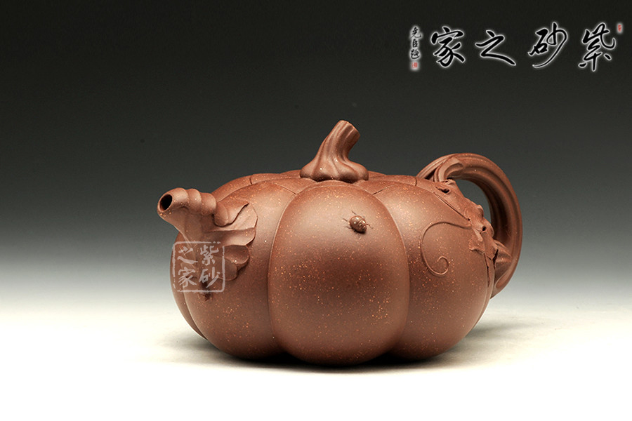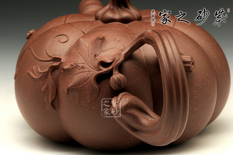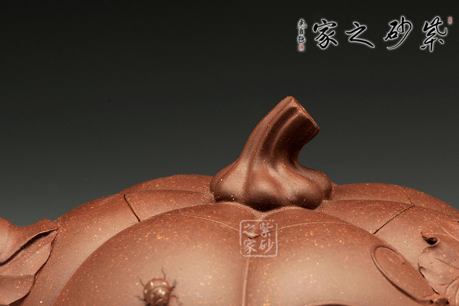 南瓜壺是紫砂壺中很常見的一種款型。此南瓜不僅外形酷似南瓜,更是集聚了南瓜的神韻,猶若瓜熟即將待落。壺鈕、壺把皆以南瓜藤為原型,形象逼真。壺嘴則若南瓜葉包裹而成,精巧別致,創(chuàng)意極新。壺把處一南瓜葉子胥出,蒼老卻不失神氣。此南瓜壺,顯然活矣!