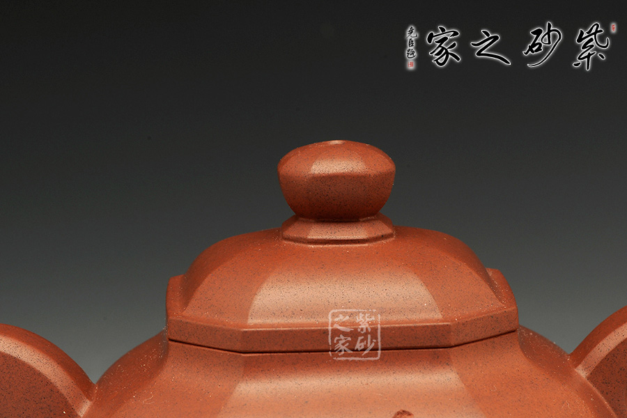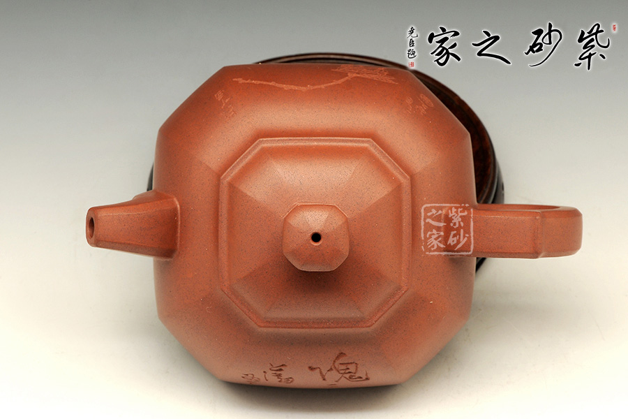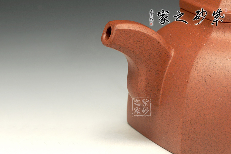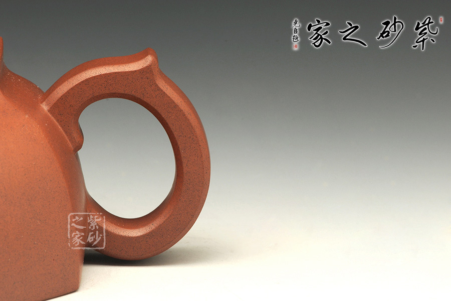 壺身的四方型中融入圓形,四角被切去,圓滑里有工整自然。子母線的圓潤非常動(dòng)人,平整細(xì)膩,足見工藝高超。蓋上鼓起,八方珠鈕小巧精致。彎流嘴上下粗細(xì)變化獨(dú)特,弧線的美感十分突出。而壺把則是粗細(xì)一致,端握趁手。