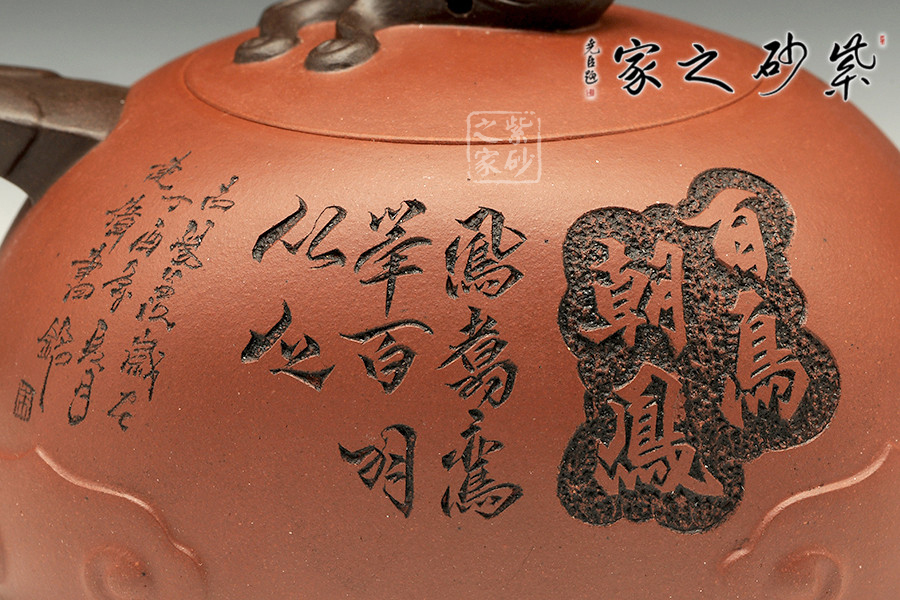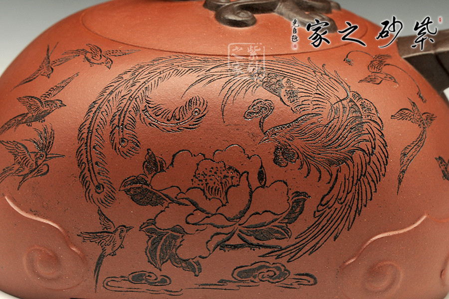 B面: 裝飾: 詩詞 裝飾者:陶刻藝人 裝飾內(nèi)容: 百鳥朝鳳