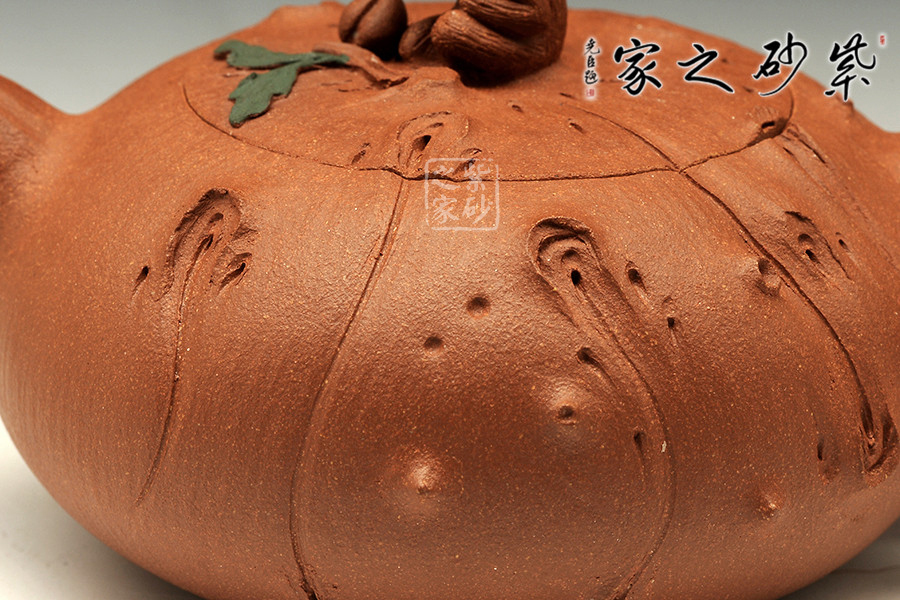 特點:原礦因含緞泥、紅泥、紫泥等諸多共生礦,陶之后,于深沉之“橙紅色”底上,滿佈五彩斑斕的粗細、深淺之紅、黃星斑點。