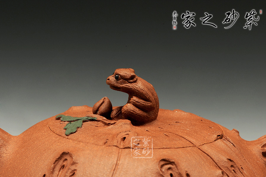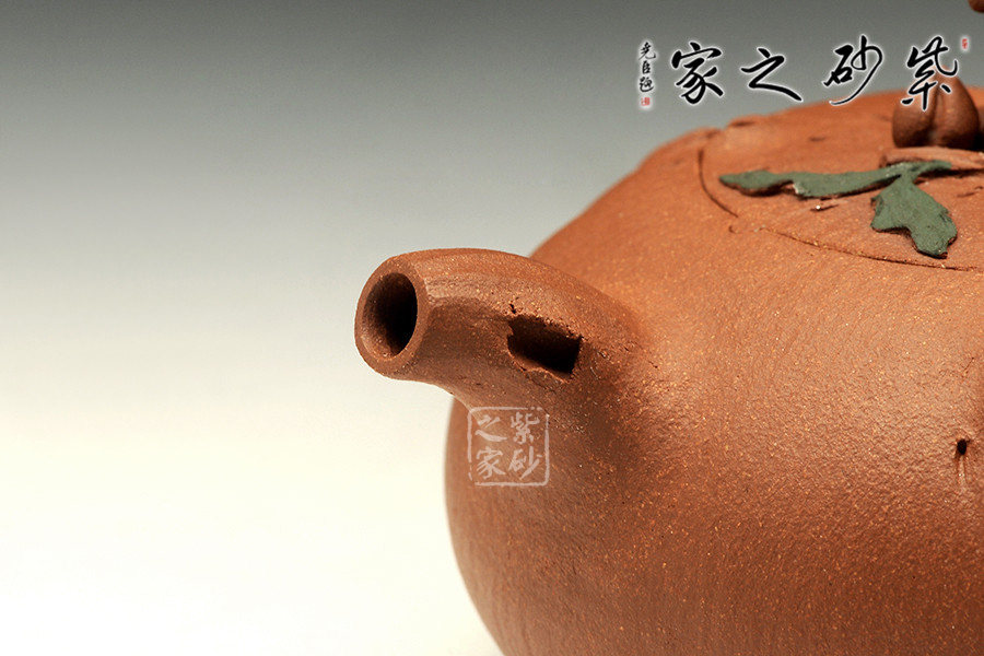 師從研究員級高工徐元明并得到其精心指點,博眾所長,練就一手過硬的純手工制壺技法。該壺充滿了生機活力,十分有趣,壺鈕為一只猴子與蟠桃,雙眼靈動,栩栩如生,一片綠葉為整器增添了色彩感,截蓋設計,上下仿佛渾然一體,壺嘴短流,出水流暢,不留涓滴。