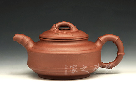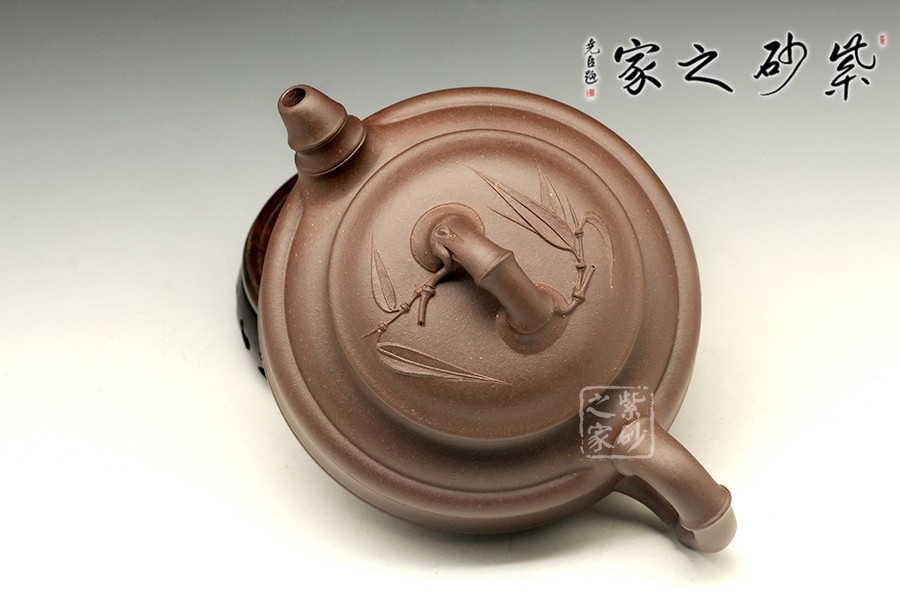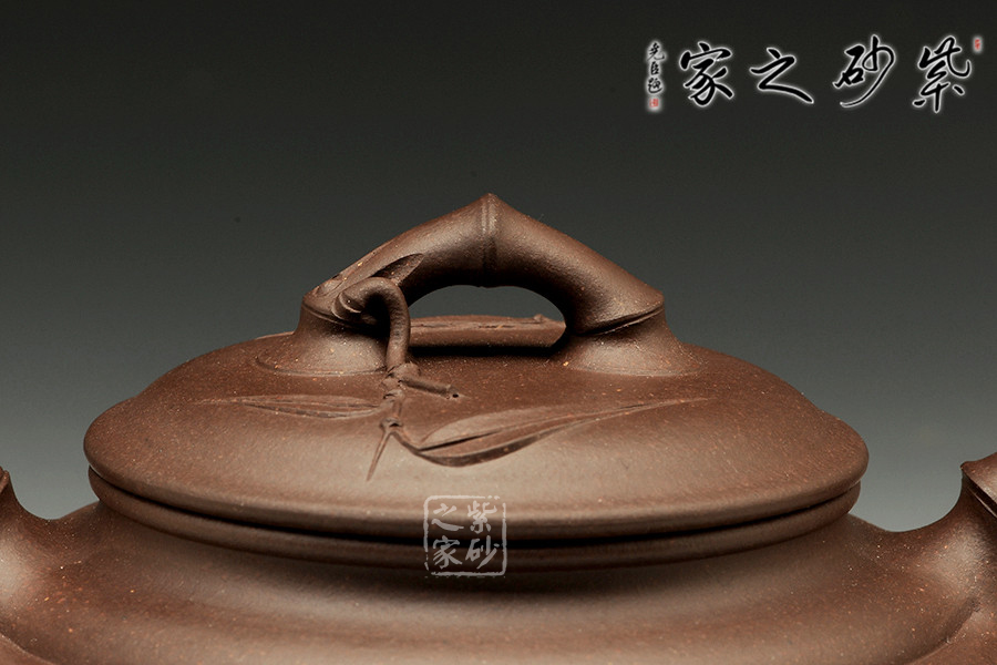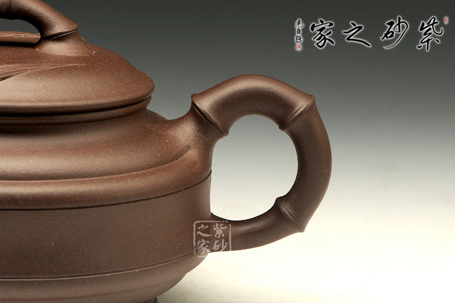功底深厚,最具發(fā)展?jié)摿に噹熤弧T搲刂窆?jié)壺把飽滿短小,竹葉裝飾飄然,壺把以竹節(jié)造型出現(xiàn),執(zhí)握不滑手。竹枝桿挺拔,修長(zhǎng),四季青翠,凌霜傲雨,倍受中國(guó)人民喜愛,有“梅蘭竹菊”四君子之一,“梅松竹”歲寒三友之一等美稱。作者以竹入壺,壺鈕做成竹節(jié)形狀,自然美觀,又便于拿捏。壺嘴壺把皆是竹節(jié),每節(jié)竹段長(zhǎng)度、粗細(xì)錯(cuò)落有致,十分符合竹子自然狀態(tài)下的特點(diǎn),展現(xiàn)了作者精湛的技藝。