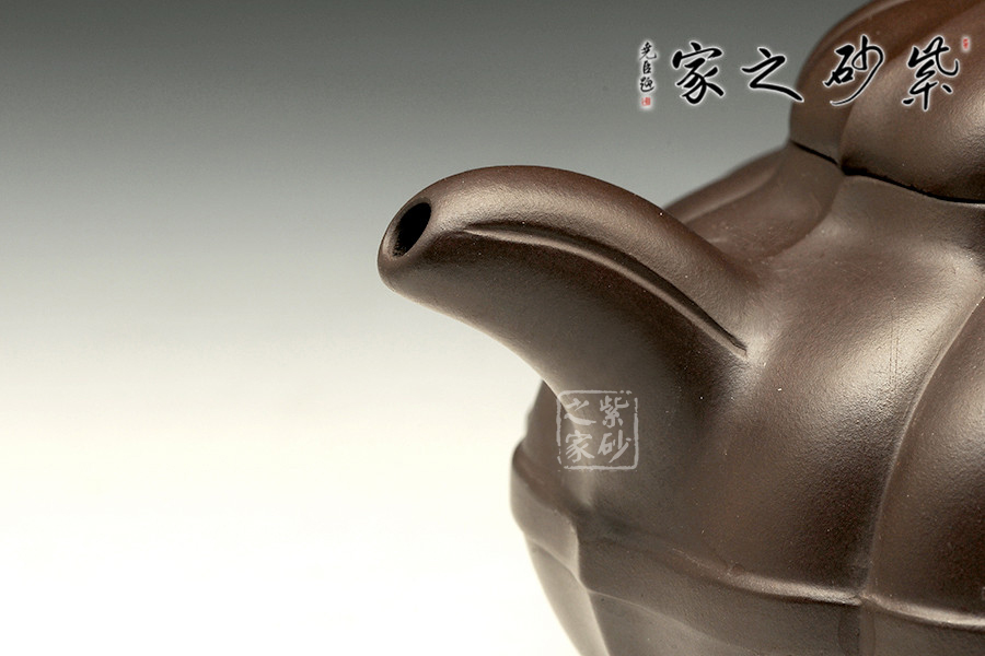 整器近似一朵含苞待放的花,在多瓣花瓣中,通過腰部的線圓進一步將壺身一分為二,同時從上往下的棱線,一凹一凸,交錯分布,但是在視覺效果上卻像都是向外凸出,將筋紋器之美展現(xiàn)的淋漓盡致!